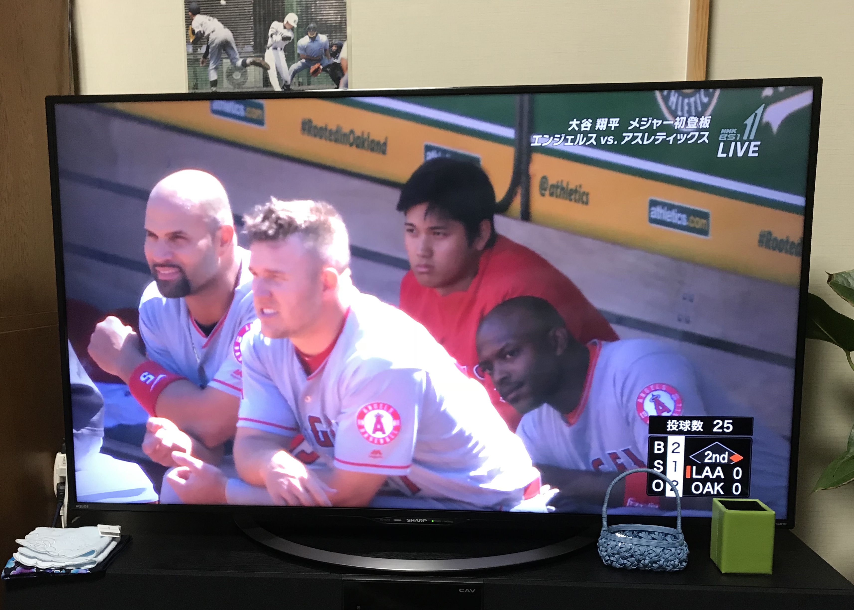 大谷翔平選手です。早起きは三文の得と言いますが、彼の投手デビュー戦をじっくり観ることができました。こんな凄いショットも見れましたし、早起きして良かった!!...です。