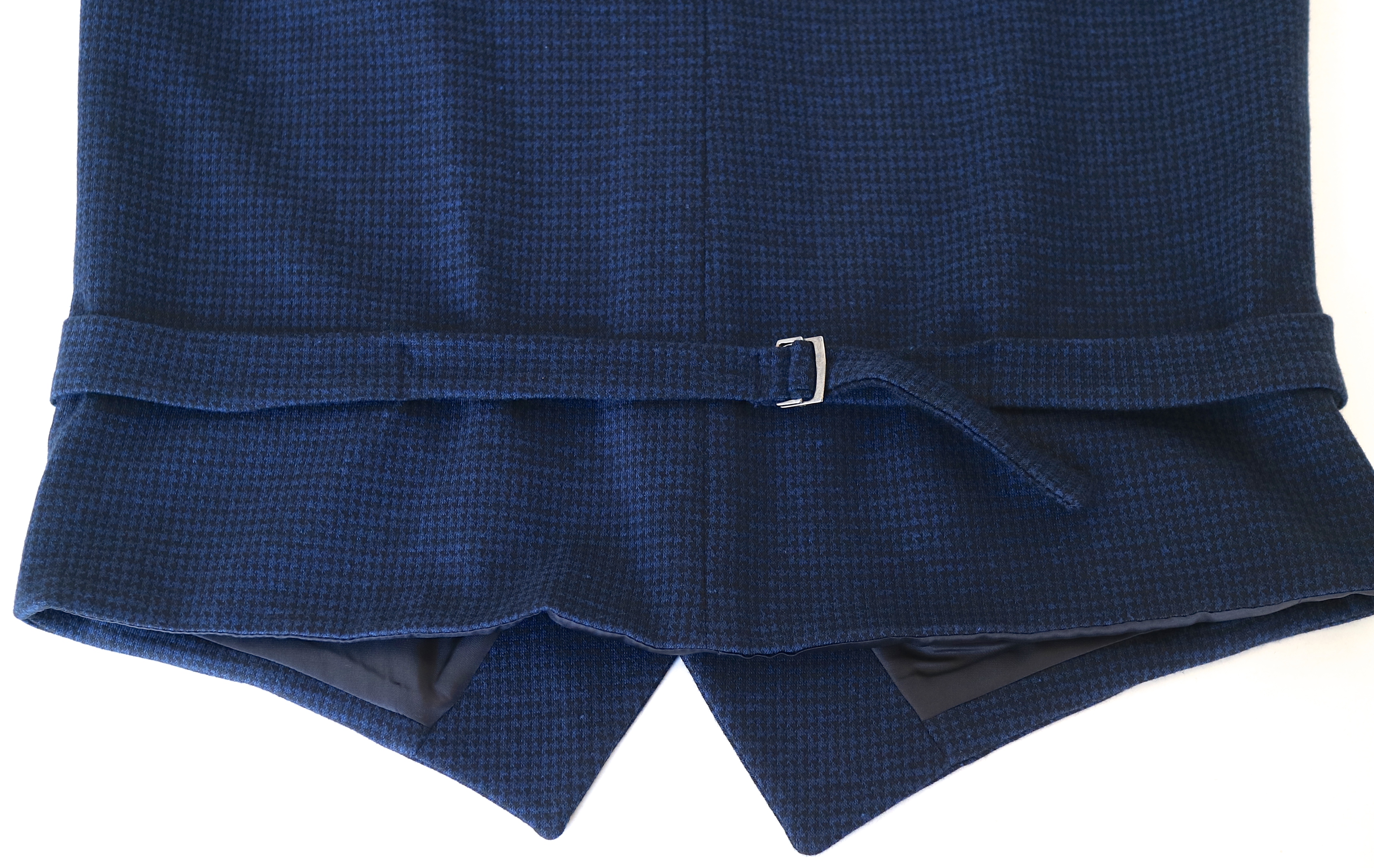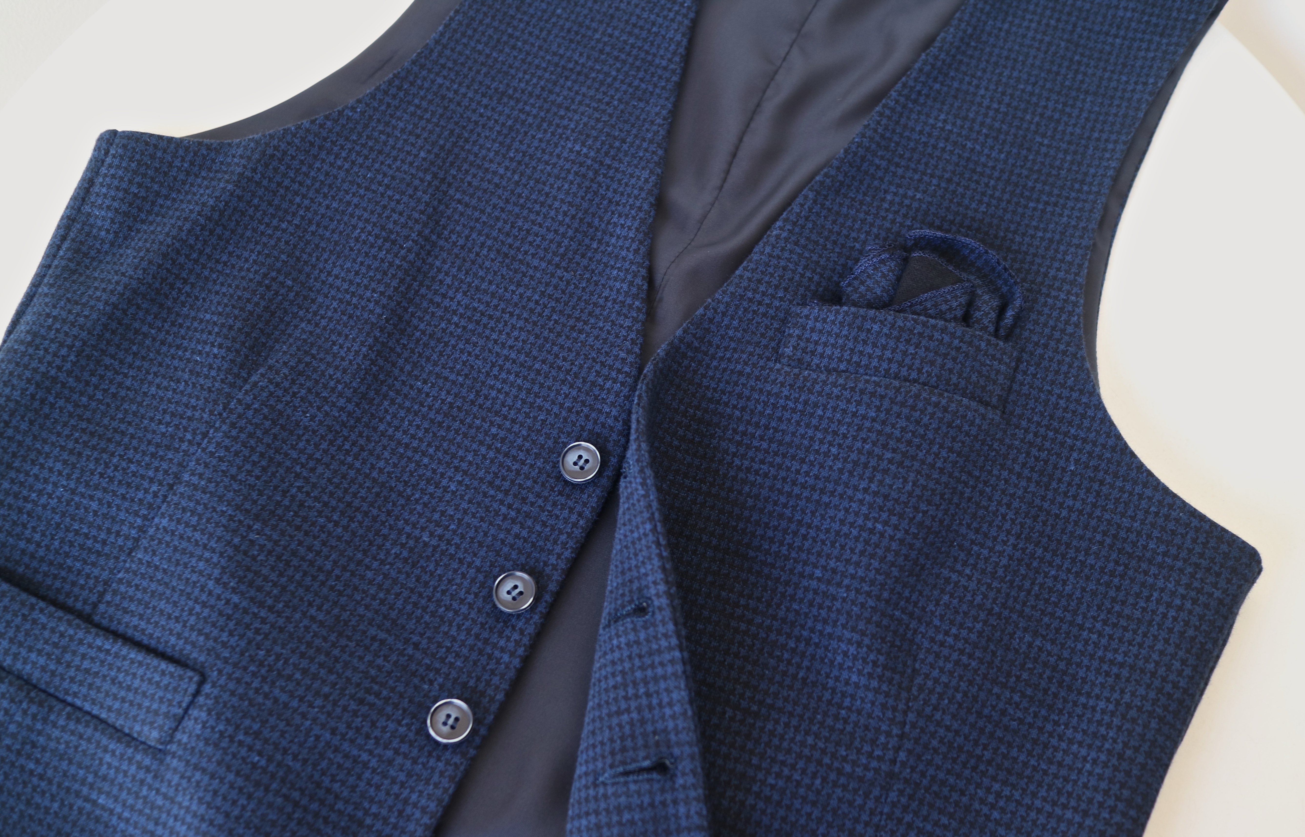 嬉しいことに、共地のポケットチーフ付きです。ブルーとネイビーのコンビネーションのマイクロハウンドトゥース柄は、男性心をくすぐるものがありますね。無地にはない、適度に生まれる表情が1番の魅力でしょうか。