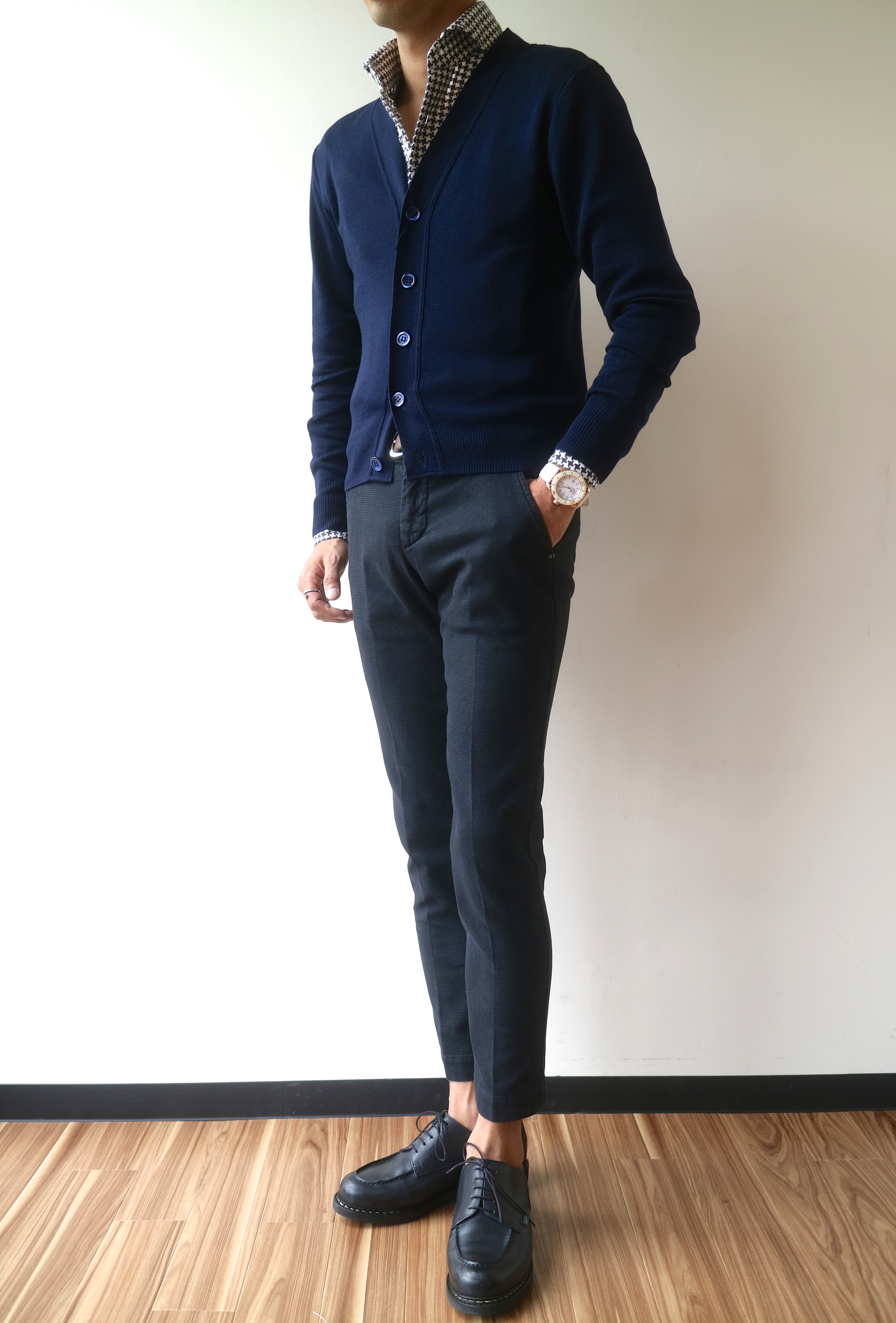 全身写真で合わせたカーディガンはLetroyesのHENRI、インのシャツはGiannetto、ベルトはD'AMICO、靴は私物です。