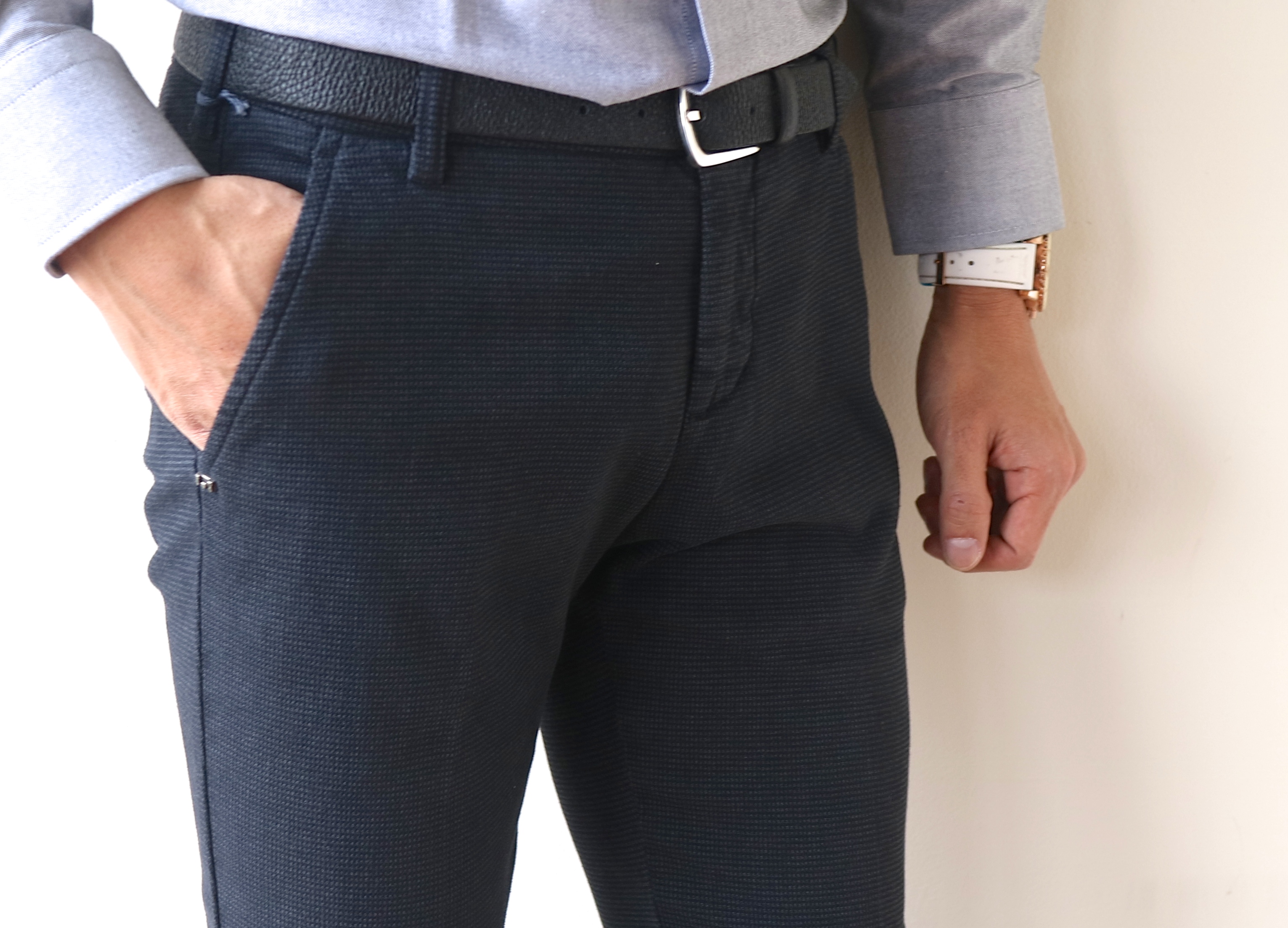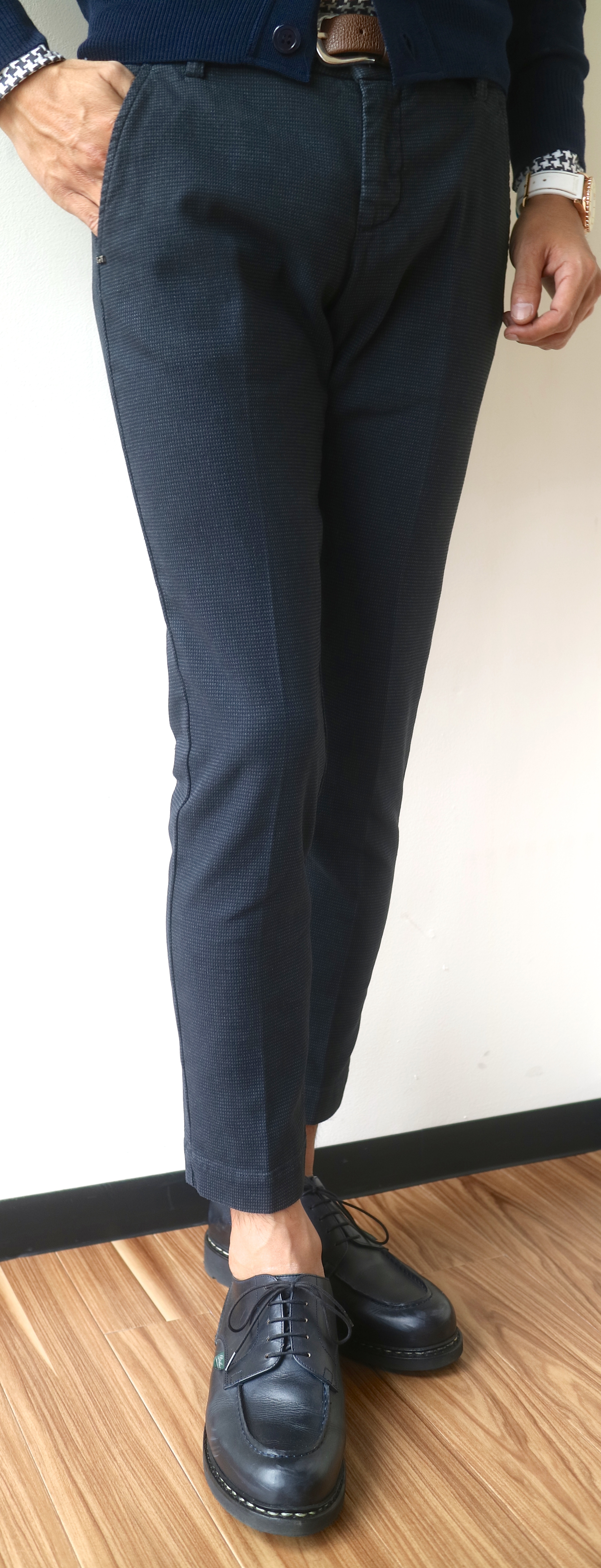 前述のトープのパンツより、やや織り柄は小さめで、長方形的な織り柄です。こちらはネイビーとグレイッシュなブルーの糸のコンビネーション。無地のネイビーに比べ、よりスモーキーな表情が醸し出されたような雰囲気に感じます。