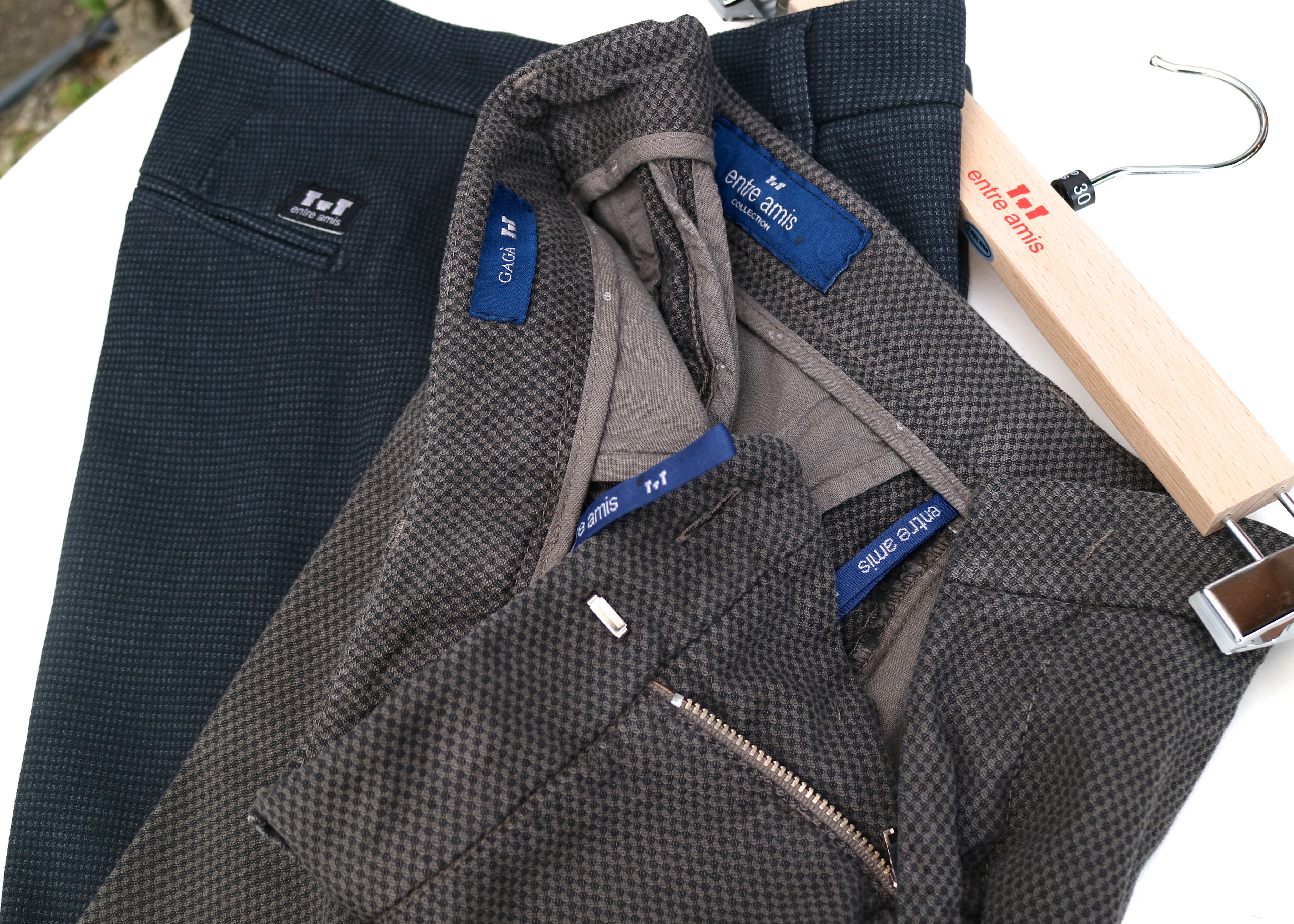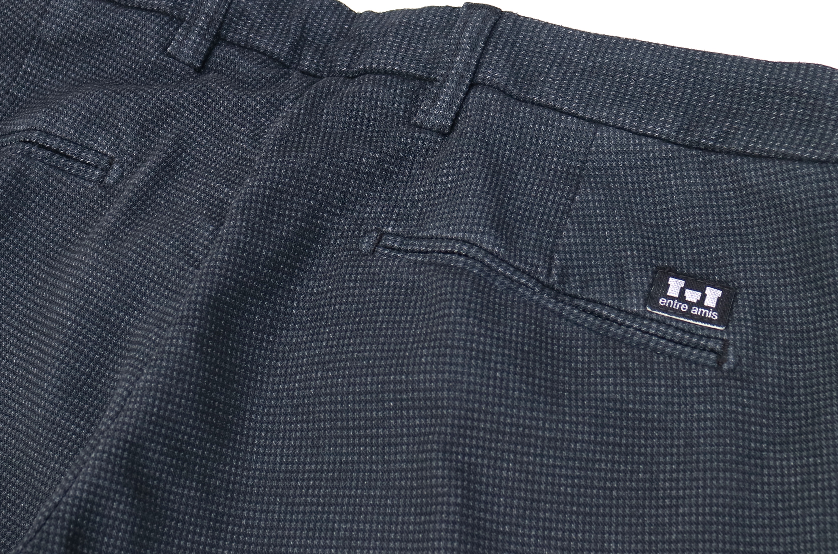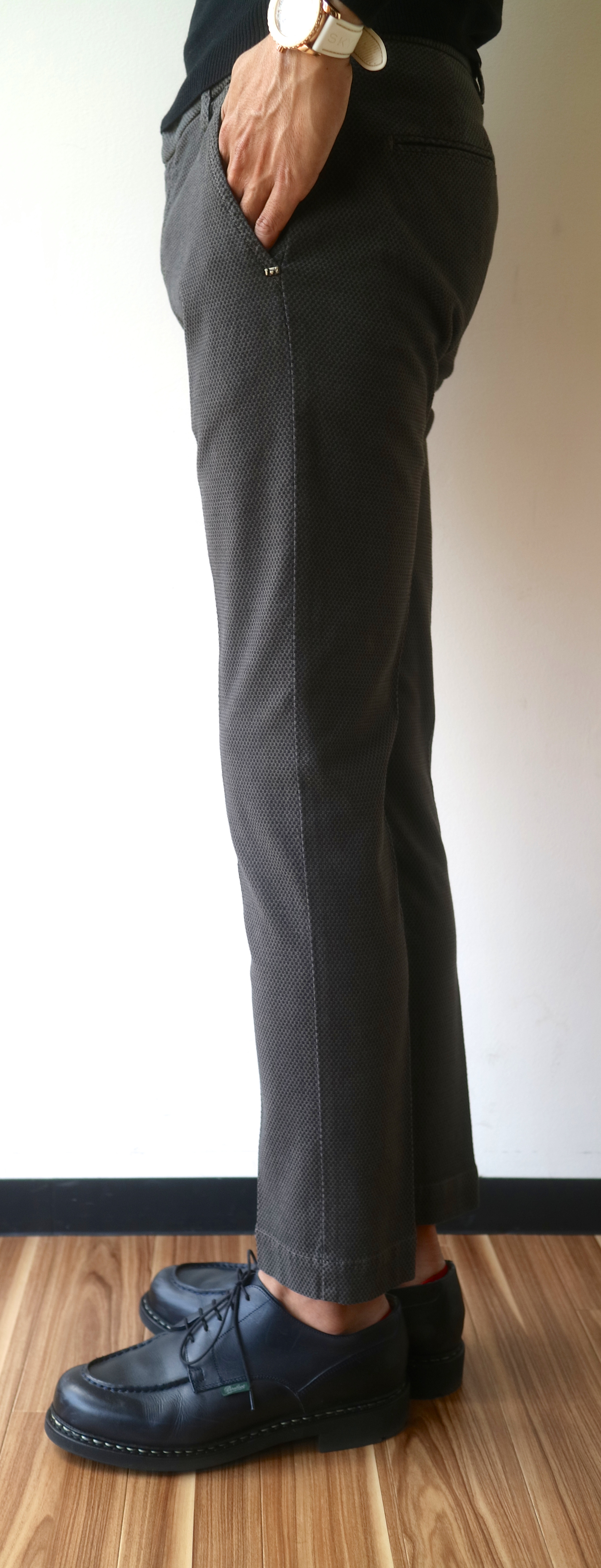 さて、本題です。前回のご案内が9月1日、その前は8月8日と、暫し間が空きました。今日は、【entre amis/アントレ アミ】。全ての細身パンツ好きの方、お待たせしました。ベーシックな無地をGETしたら、次に狙いたいのは、ちょっとだけ・巧みに変化を付けたジャカード織りのパンツ...なんてのが本日のお題です。どうぞ目を凝らしてご覧ください。