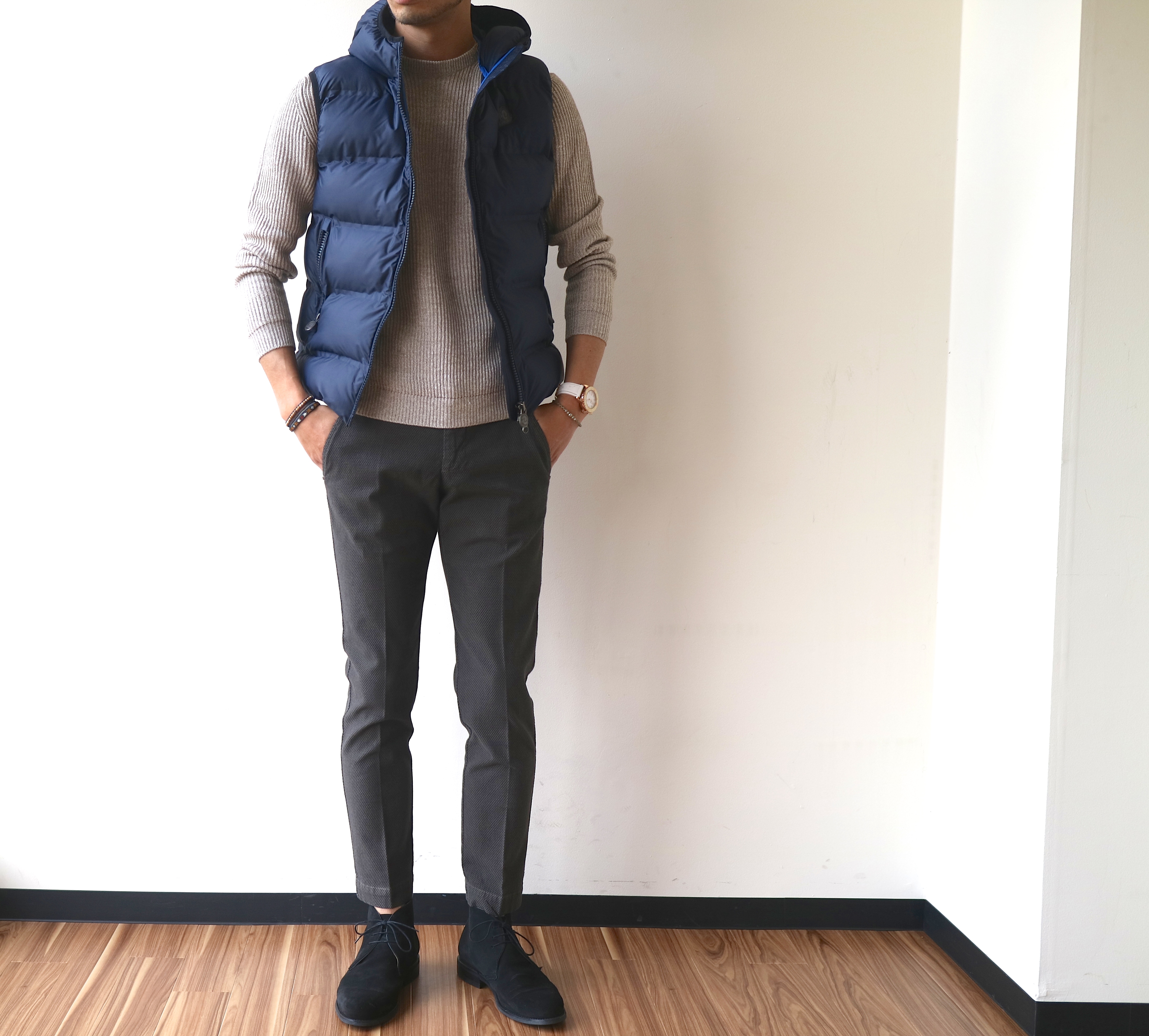 春物と、春先まで引っ張れるアイテム。上手く組み合わせて使いたいところです。トップスにはinvictaのフーデットベスト。インにはeleventyのサマーニット。ブレスレットをアクセントで取り入れてみるのも良いでしょう。ブレスレットはCHAN LUU(右手の物はこちら、左手の物はこちら)、靴は私物です。