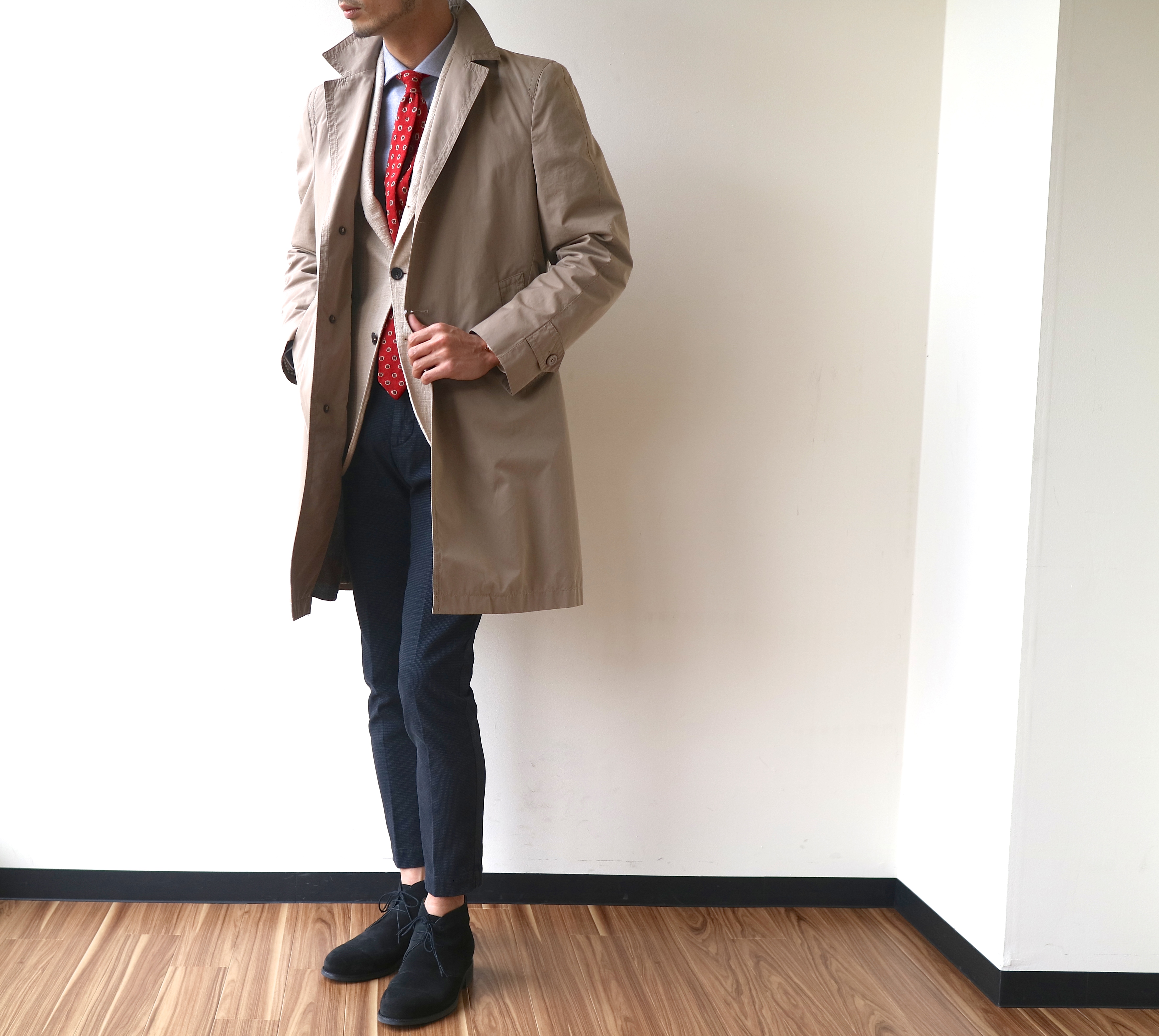 春も引き続き着用したい、BOGLIOLIのコットンのコート。今季トライしたいオフベージュのジャケットはLARDINI、シャツはMASTAI FERRETTI、タイはLARDINI(店頭のみ)、靴は私物です。色味が薄くなった時、重宝するネイビーのパンツ。ジャカードでちょい個性もあって、お勧めです。