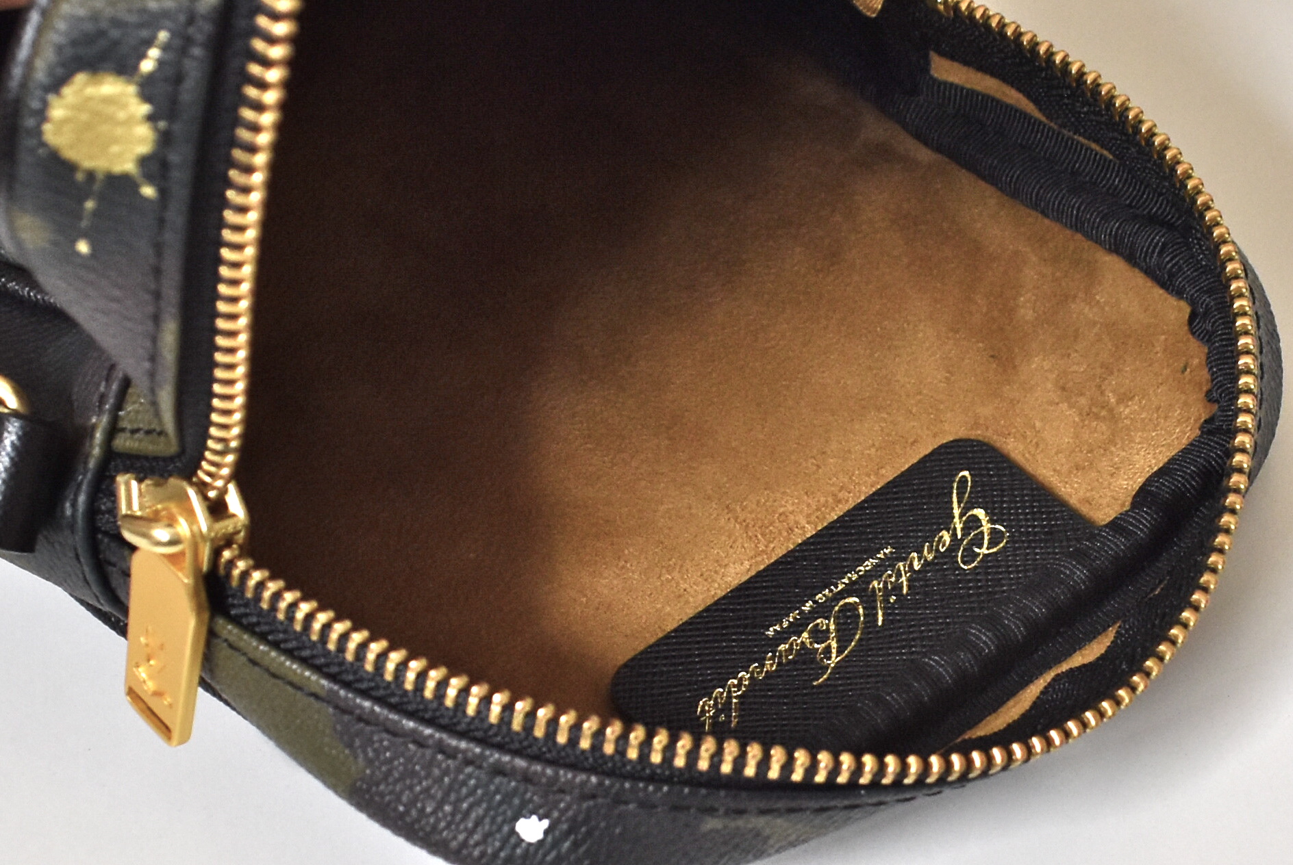 下側をカーブさせた、台形型のシャープなフォルム。また、幅も上側(幅5cm)から下側(幅0cm・マチなし)にかけて徐々に細くしてあり、まるでテイパードパンツのようですが、シュッとした形にデザインされています。カモフラージュの個性と相まって、先鋭的な印象です。