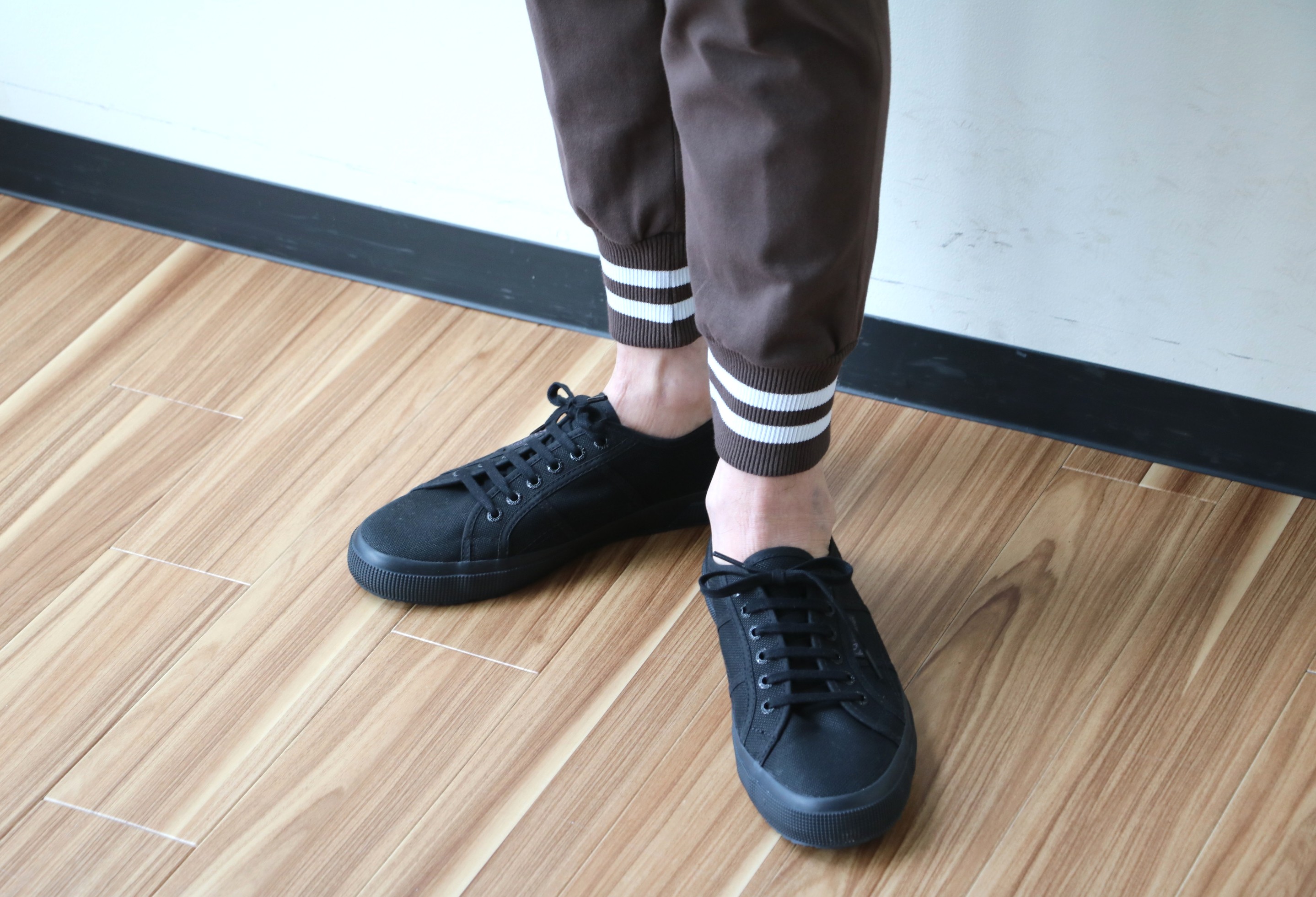リブパンツとスニーカーの相性は抜群に良く、スポーティーな雰囲気を簡単に演出可能です。