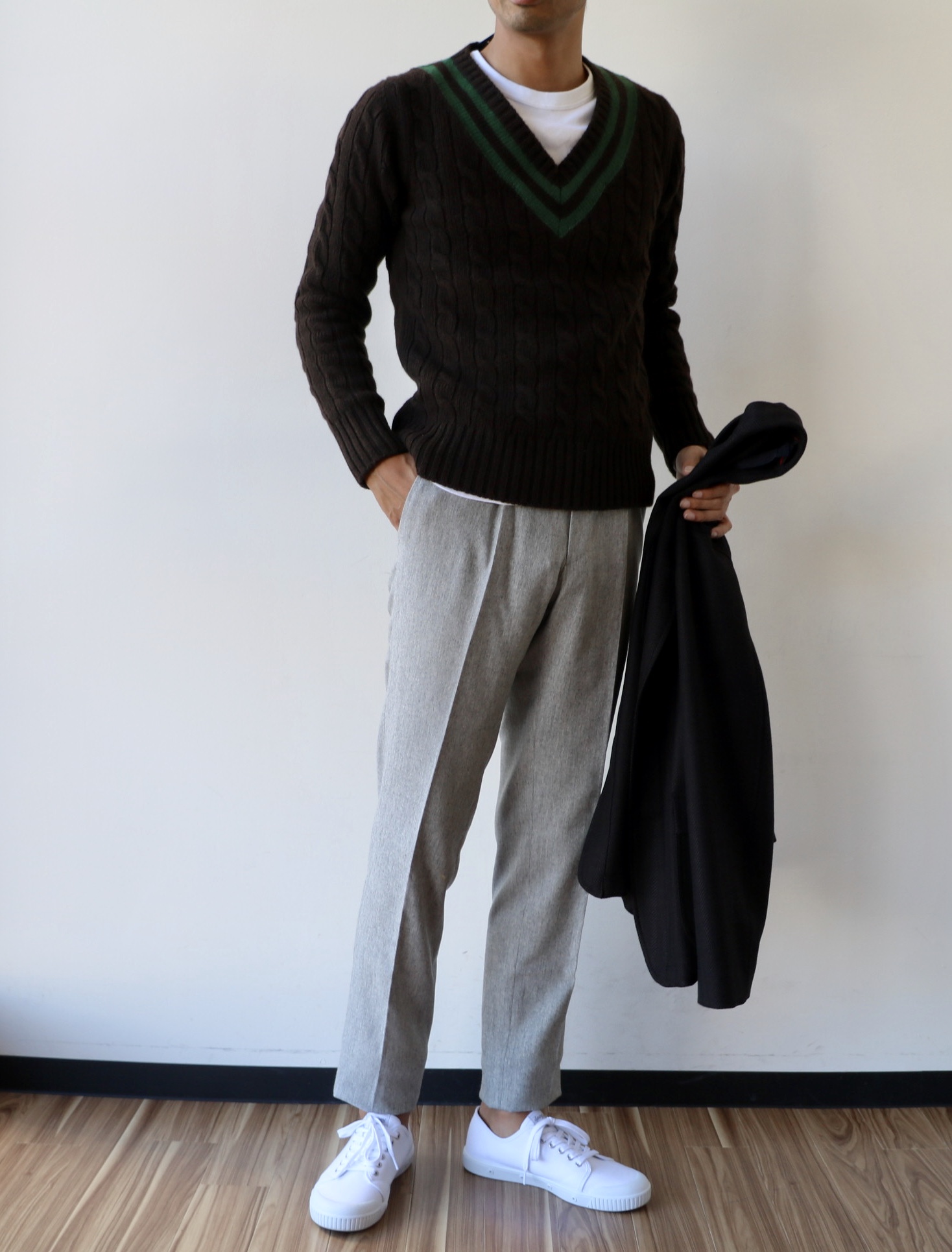 ざっくりとした編み地やケーブル編みのニットなどと、ラフに合わせるのも素敵でしょうね。気張らずにスニーカーを使うのも有りです。ケーブル編みのニットは、THE GIGI。手に持ったジャケットもTHE GIGIです。スニーカーはSpring Courtでした。