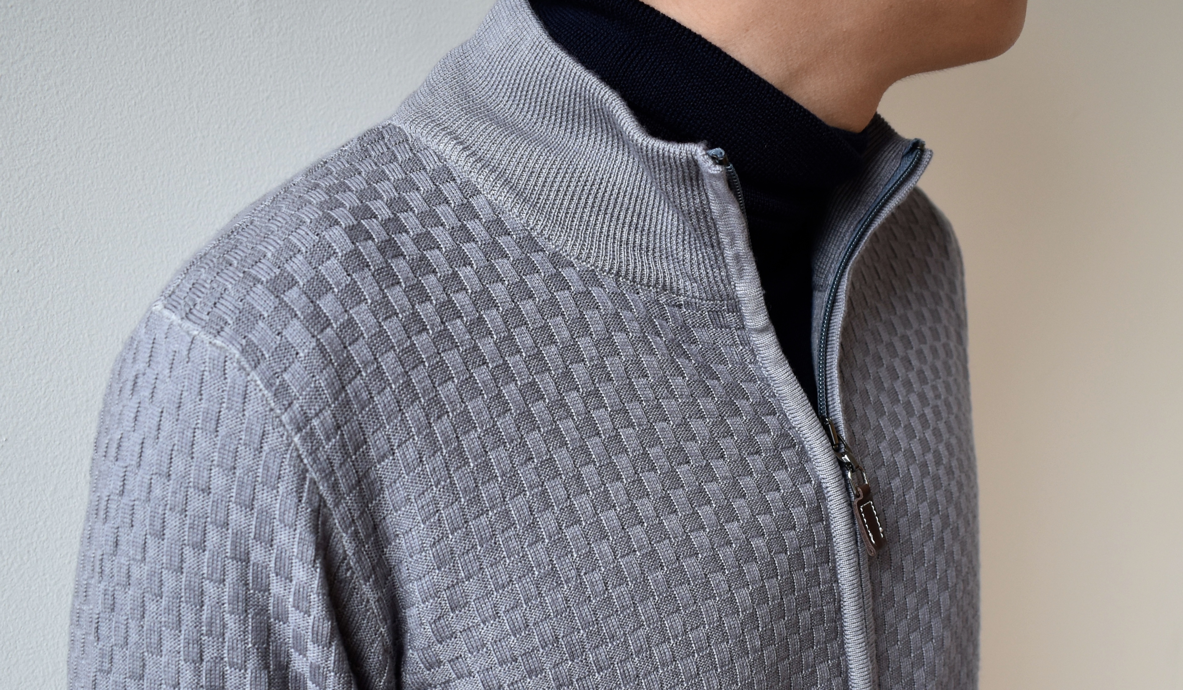 MODEL:後染めハイゲージ 立ち襟ジップカーディガン