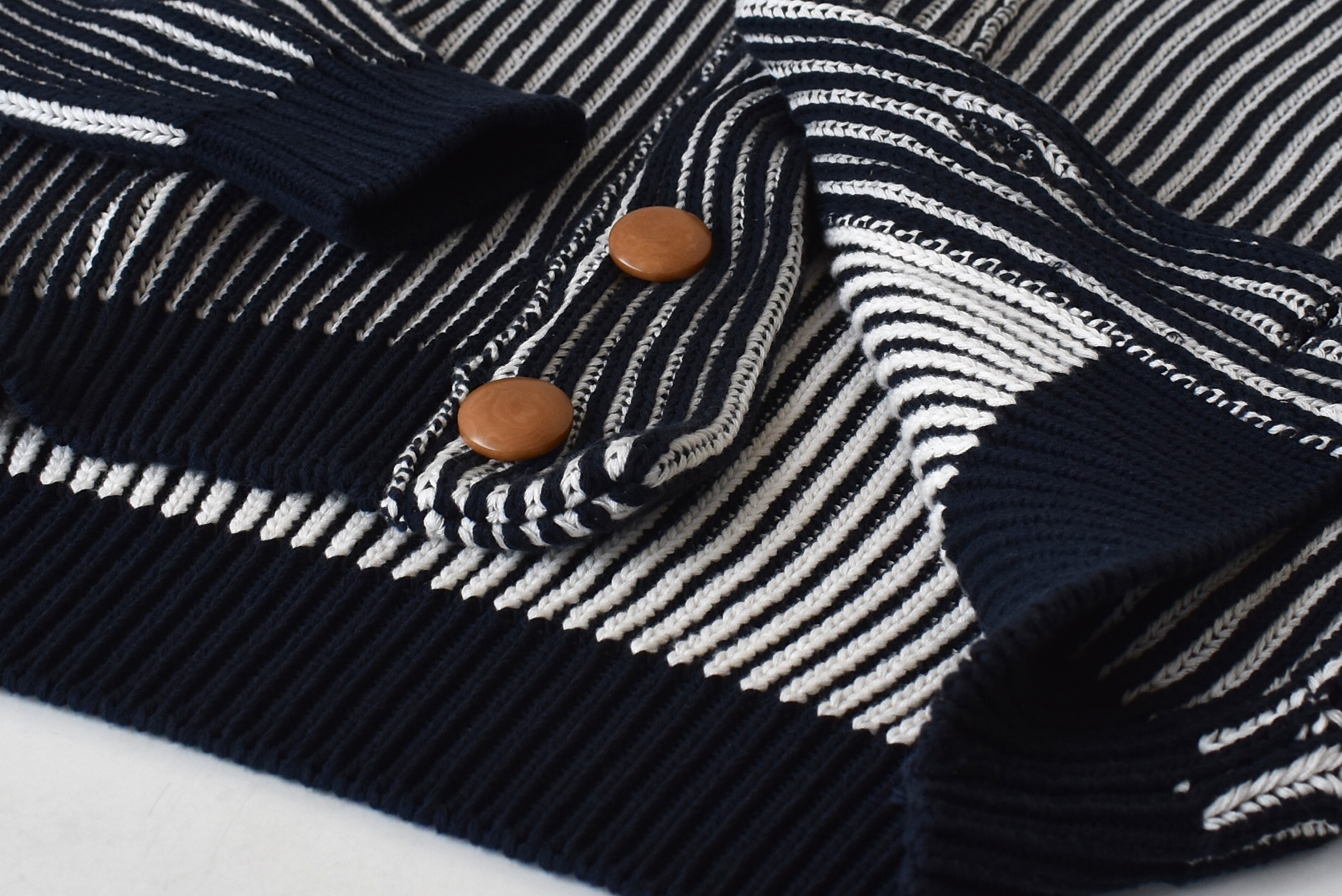 ネイビーとホワイトを基調とし、ワンポイントでライトブラウンの釦。存在感のある表情ながら、配色はベーシック。適度に遊びを感じつつ、モダンでスタイリッシュな表情も感じさせます。