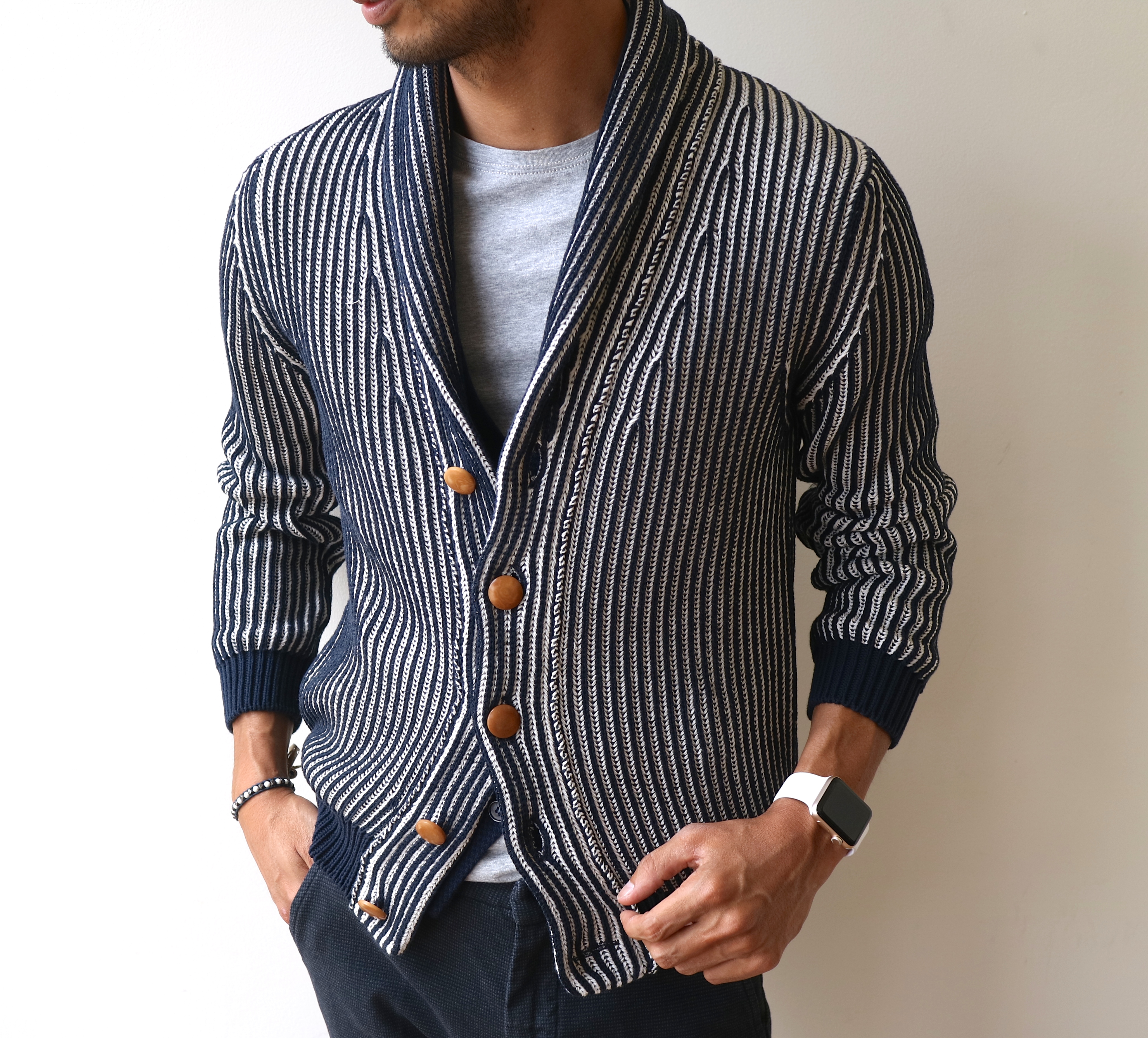 そういう訳で、さっそく袖を通してみました。冬の入り口まで使えてしまえそうな厚さのショールカーディガンは、今の時期見逃さずにチェックしておきたいところでしょうか。