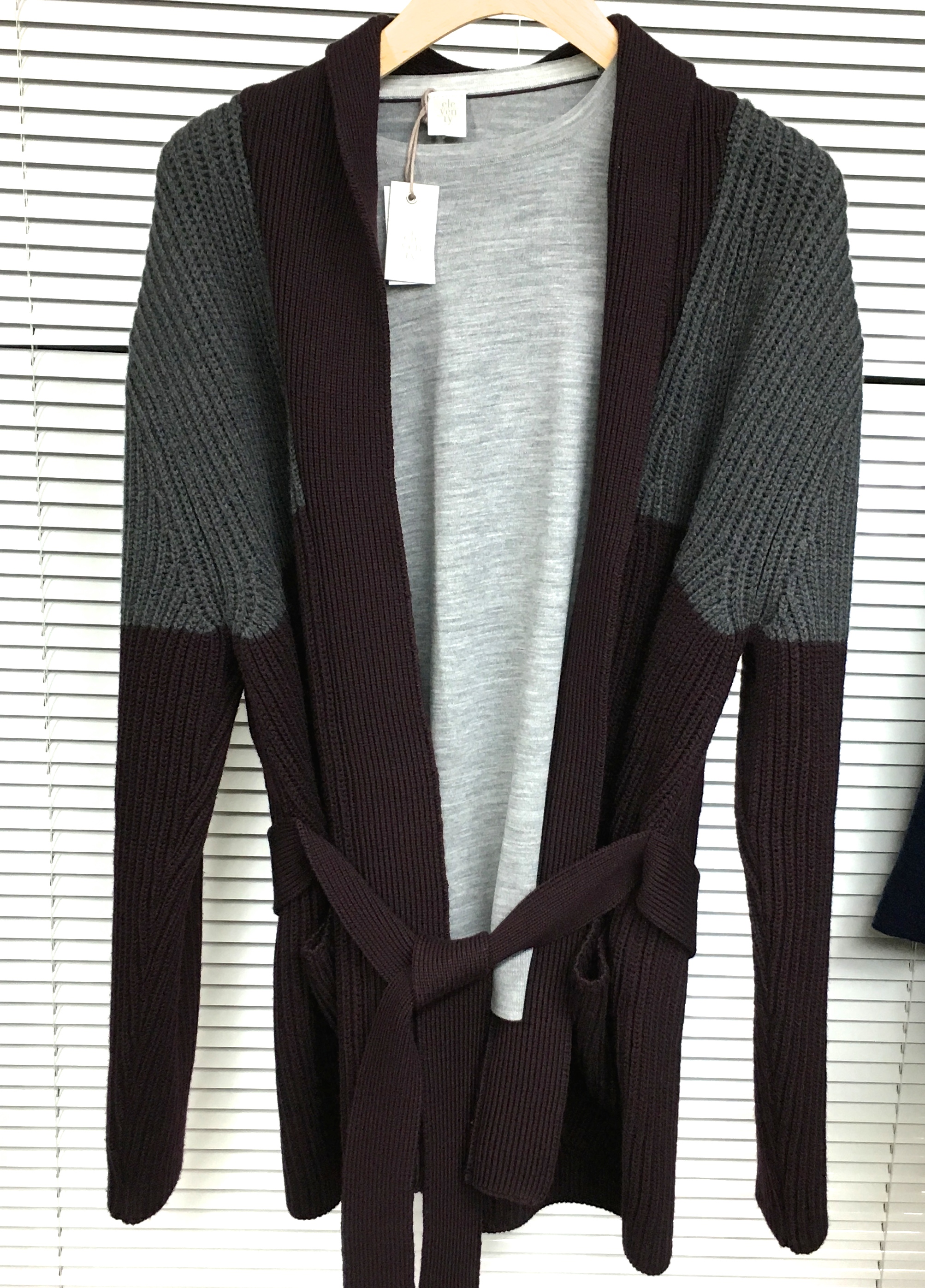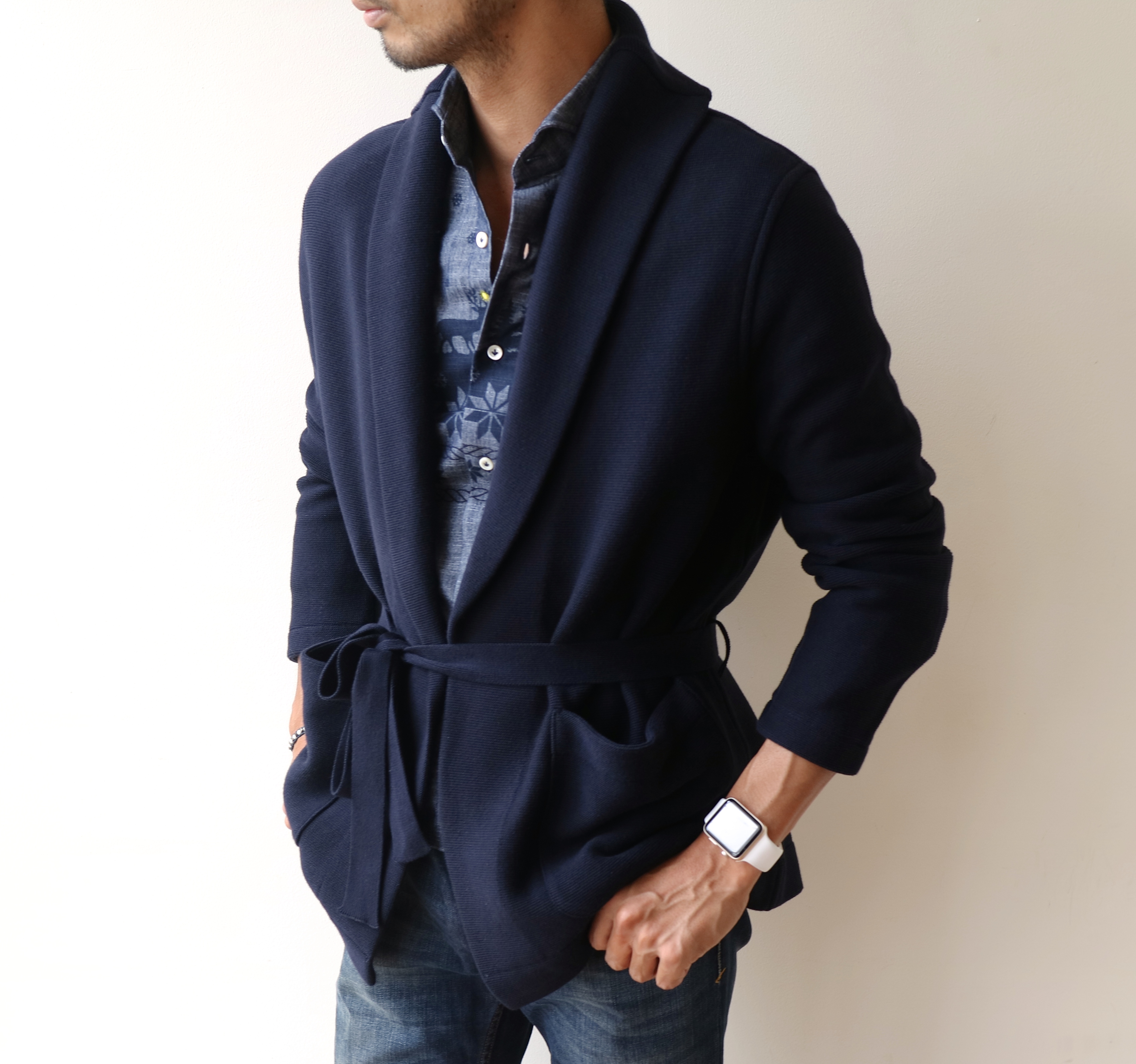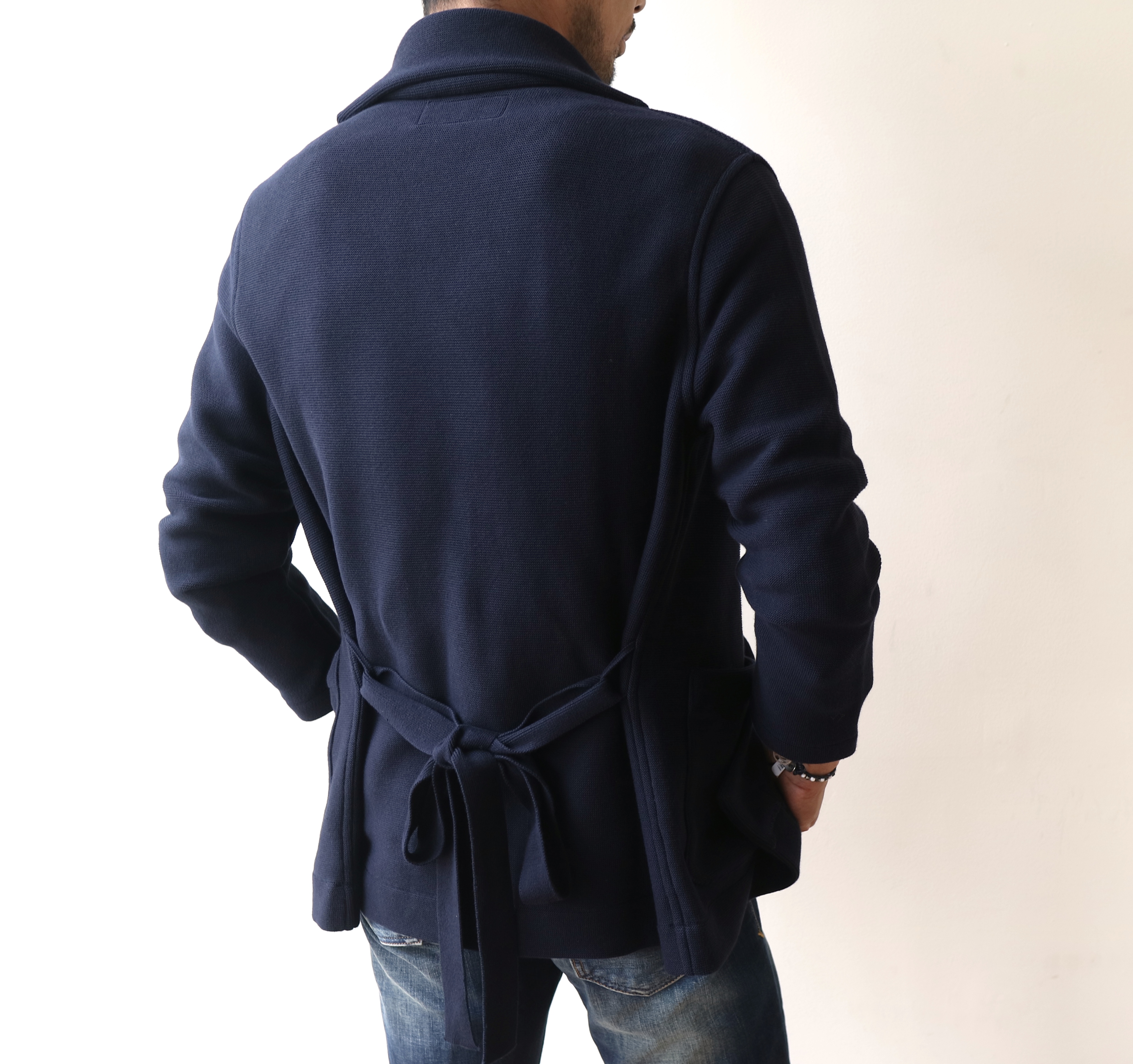ロング丈のカーディガンの提案がジワジワと増えてきています。ウエスト部分にはベルトが付きますが、ベルトを締めてダンディに見せるも良し、ベルトを外してしまって上からサラッと羽織るだけにしても良し、アレンジの効くアイテムです。