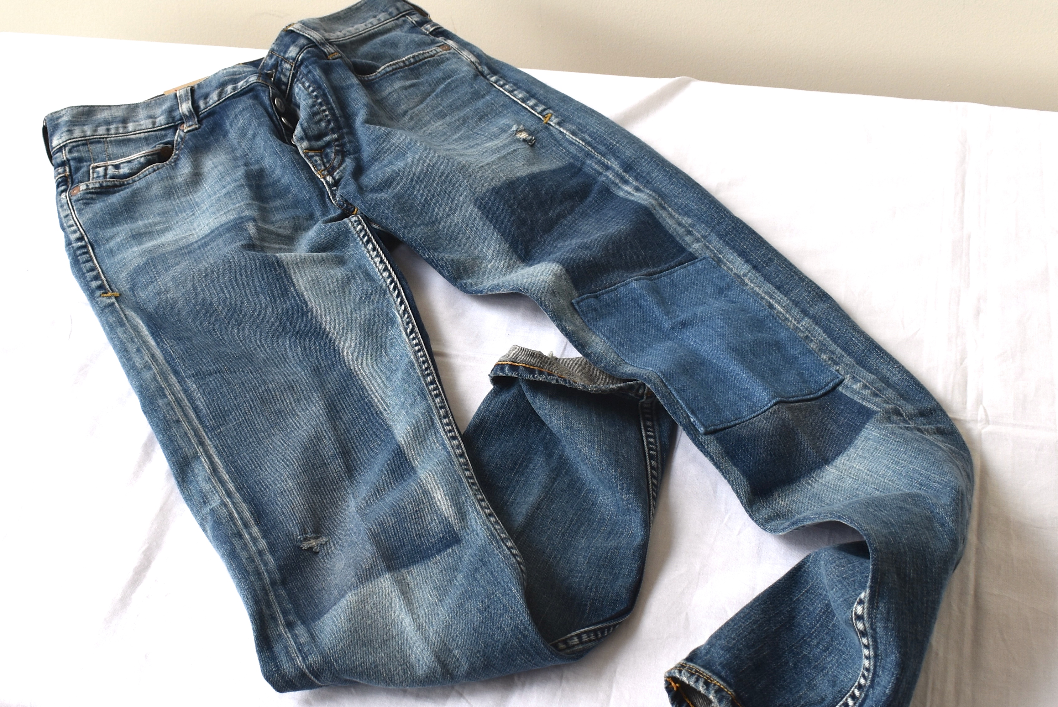 面白いのは、こちらの加工ジーンズ。左膝のパッチに加え、個性的な色の落とし方が目を引きます。
