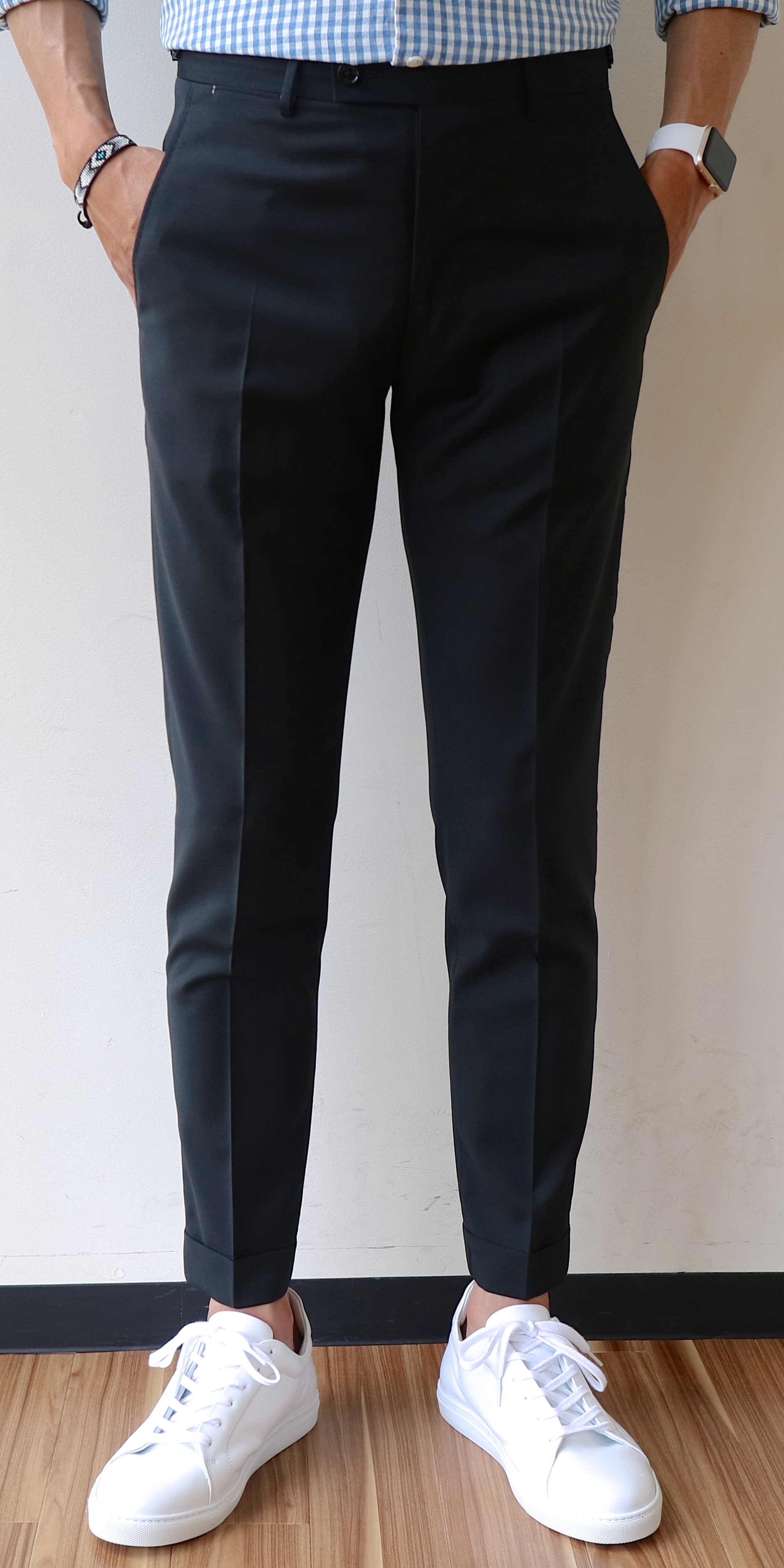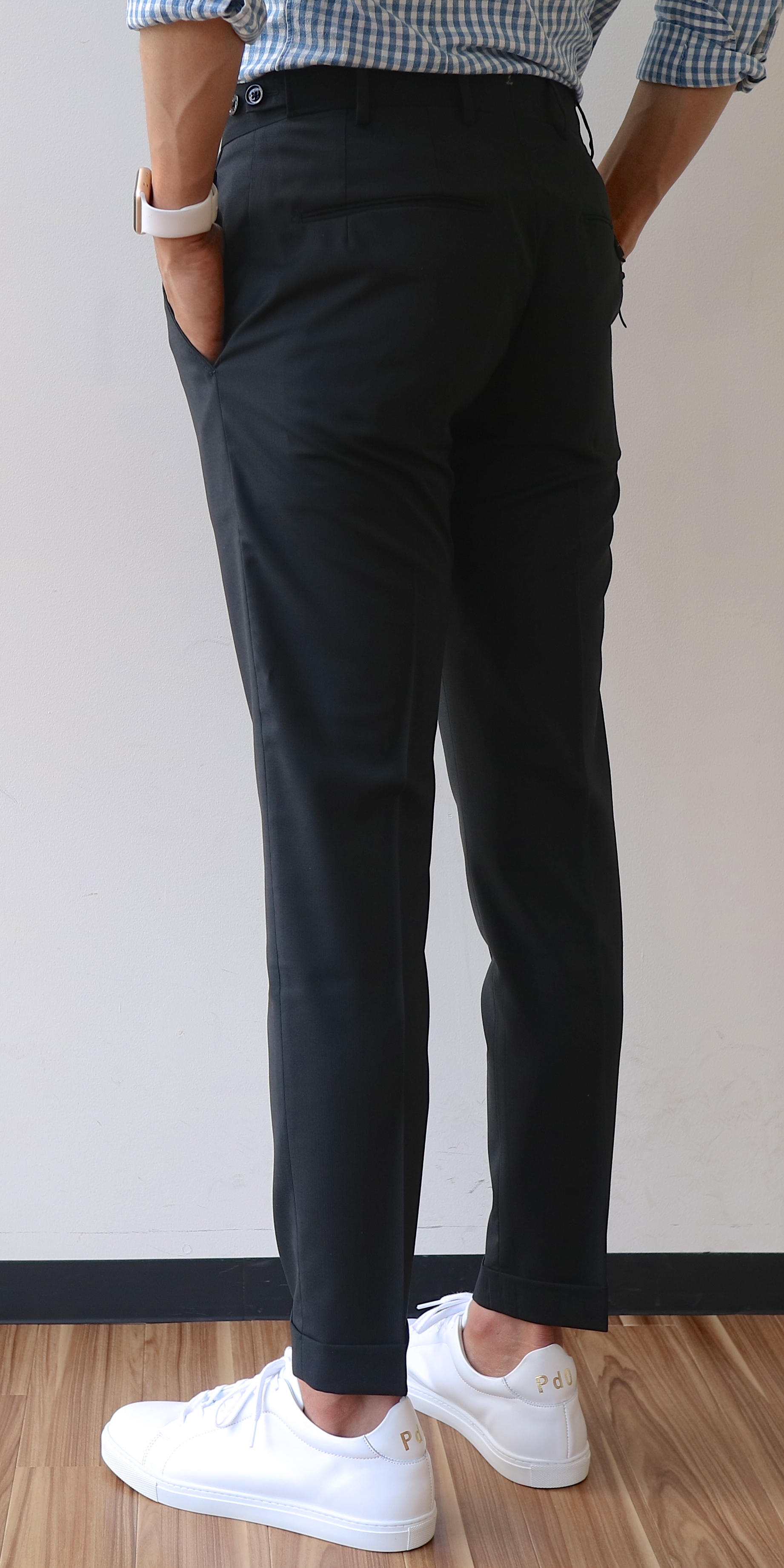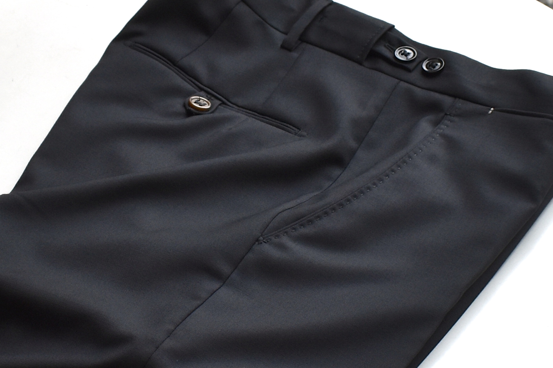 まずは問題です。写真のサラッとした生地のパンツ。素材は何でしょうか? ......、答えはウールです。夏用のきわめて薄手のトロピカルウール。ウールというと、温かみのある秋冬の素材、またはビジネス用パンツの素材とイメージされる方がおられるかもしれませんが、どちらもその限りではありません。夏用の薄手のウール地は、他のどの素材と比べても1番涼しいのでは?と思う程さらりとしています。また、カジュアル寄りなウールパンツならば、白Tシャツやスニーカーなど、敢えてカジュアルなアイテムと合わせ、ちょっぴりモード感を演出...なんて常套手段だったりするのです。