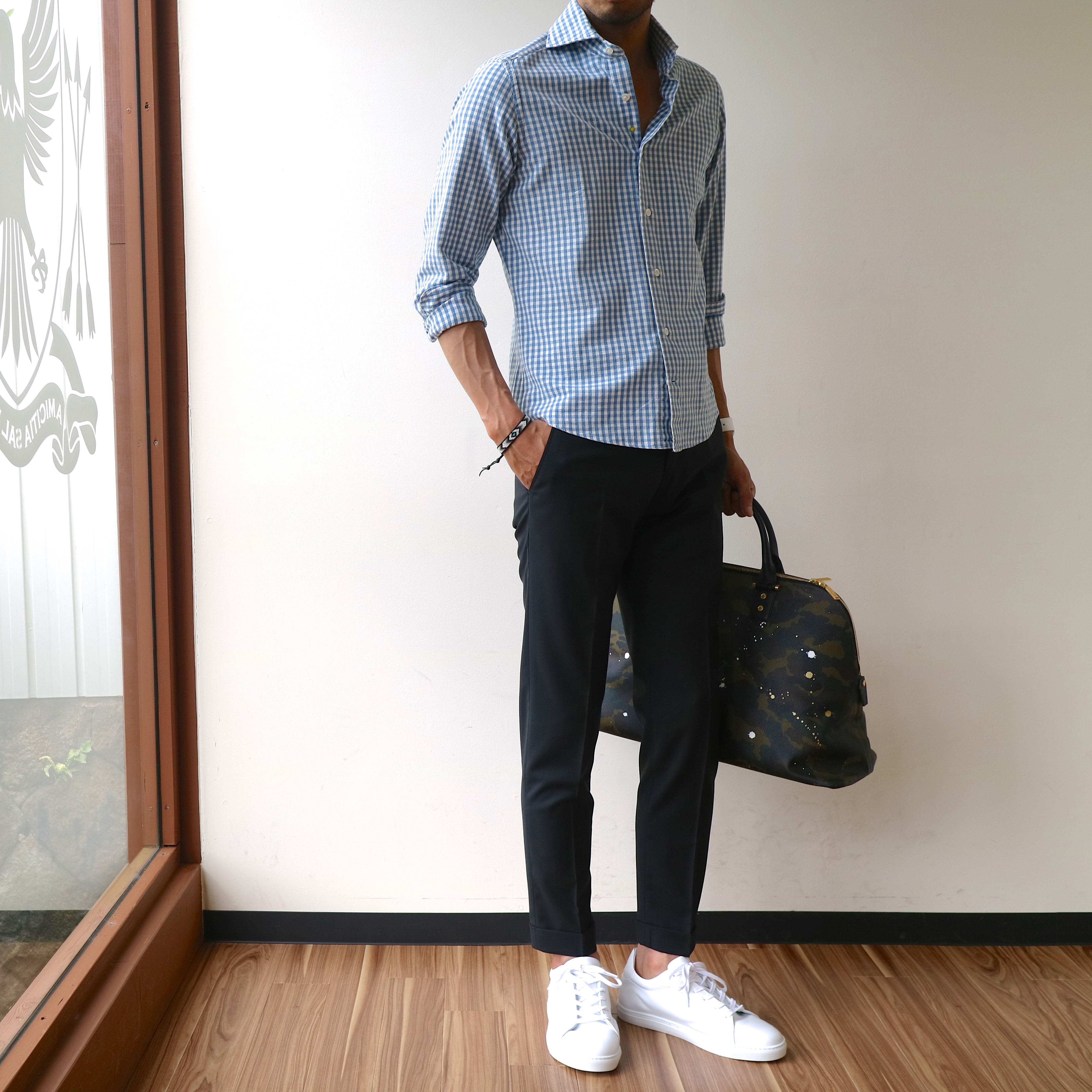 今季、よく売れたモデルです。最後に全身でご覧ください。シャツーGiannetto ウールパンツーBERWICH 靴ーPantofola d'Oro(後日ご紹介予定) バッグーGENTIL BANDIT ブレスレット右手ーCHAN LUU