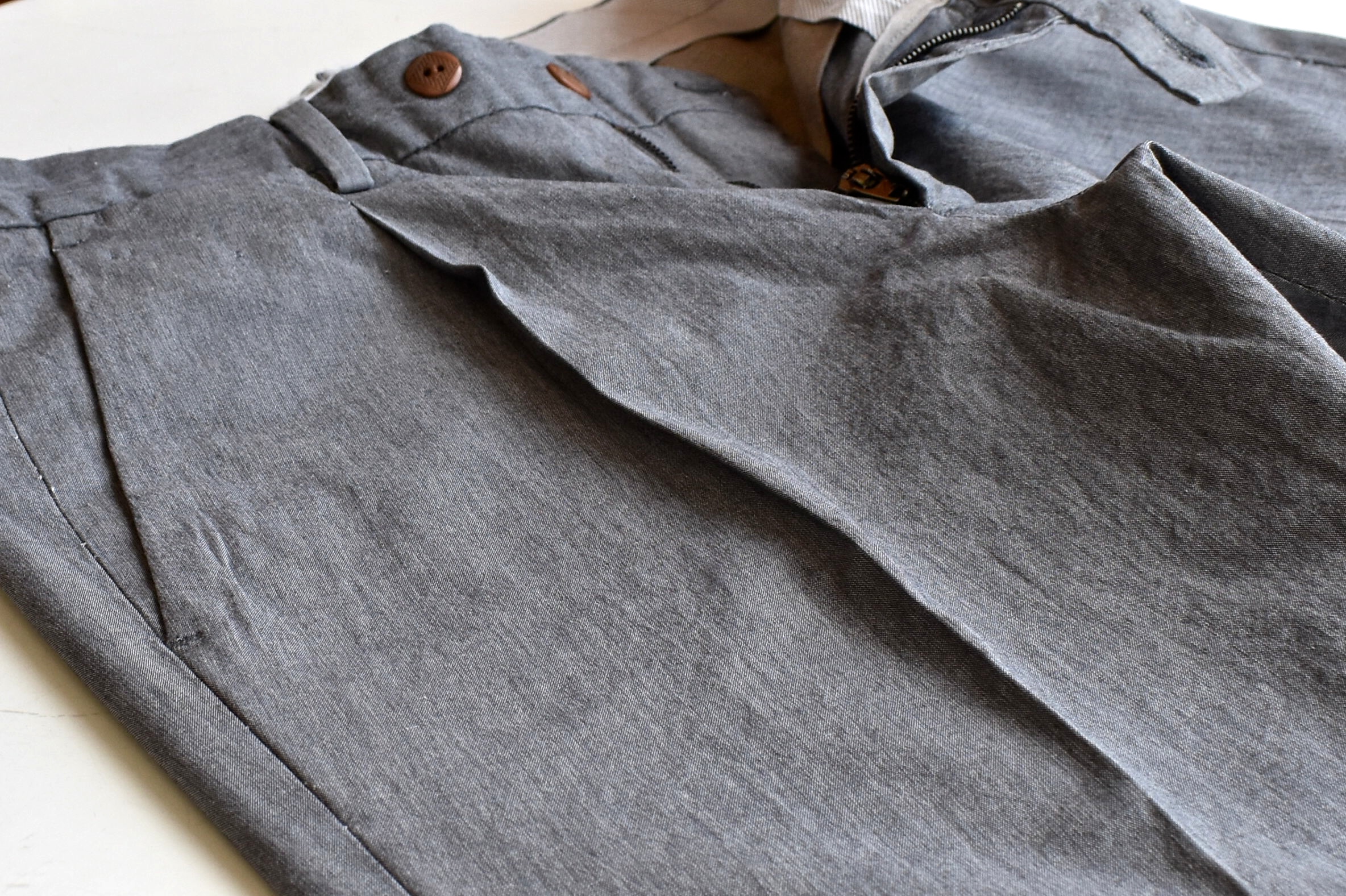 今日の1本は・・・、シャンブレーのような、霜降り調の生地のパンツ。薄めかつドライな質感と相まって、夏によく映えそうな1本です。