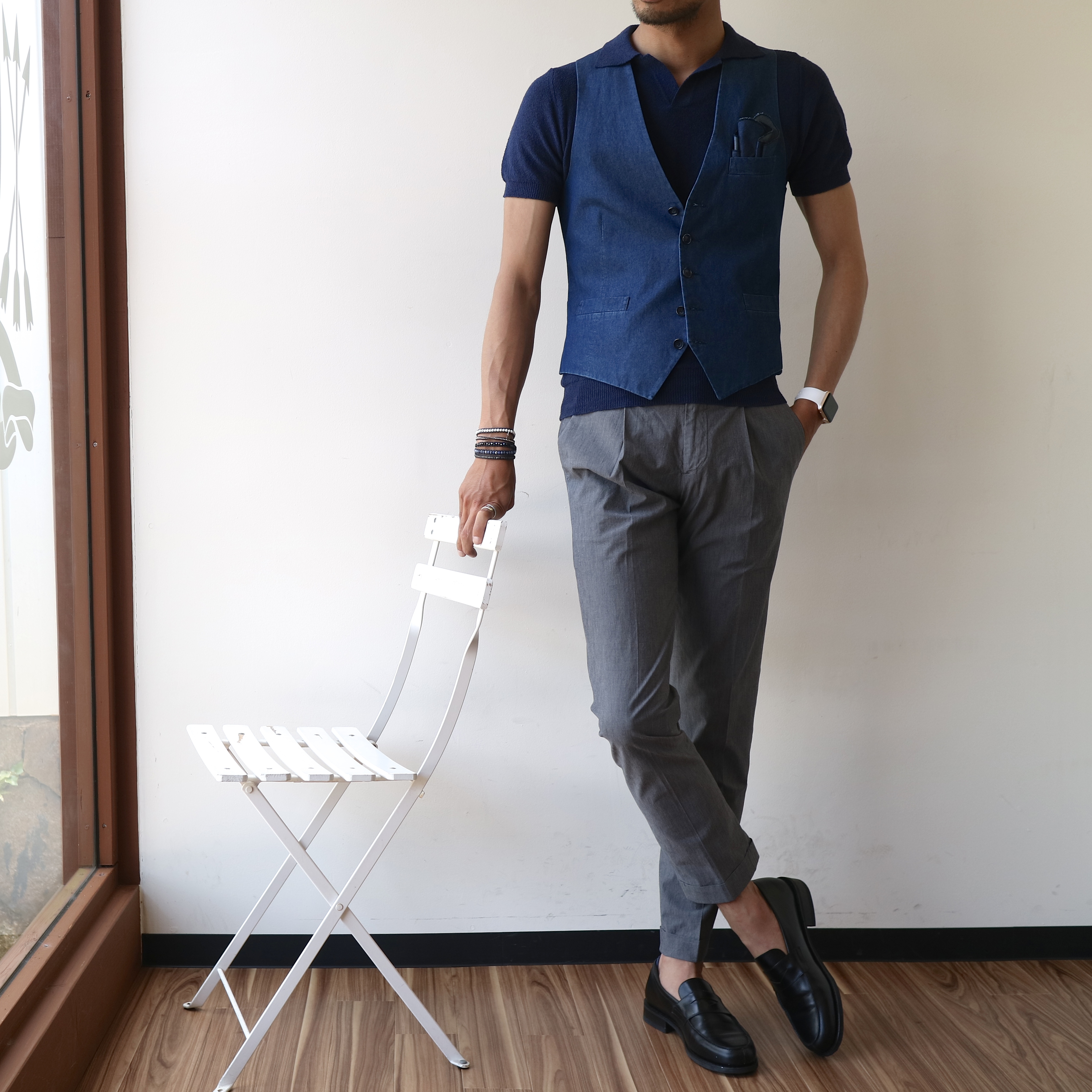 オンオフ両刀使いに、適した雰囲気。コレは使えます。最後に全身でご覧ください。シャツ地ジレーGiannetto ニットポローmorgano コットンパンツーBRIGLIA 1949 靴ーParaboot(私物) ブレスレット右手ーCHAN LUU(後日ご紹介予定)