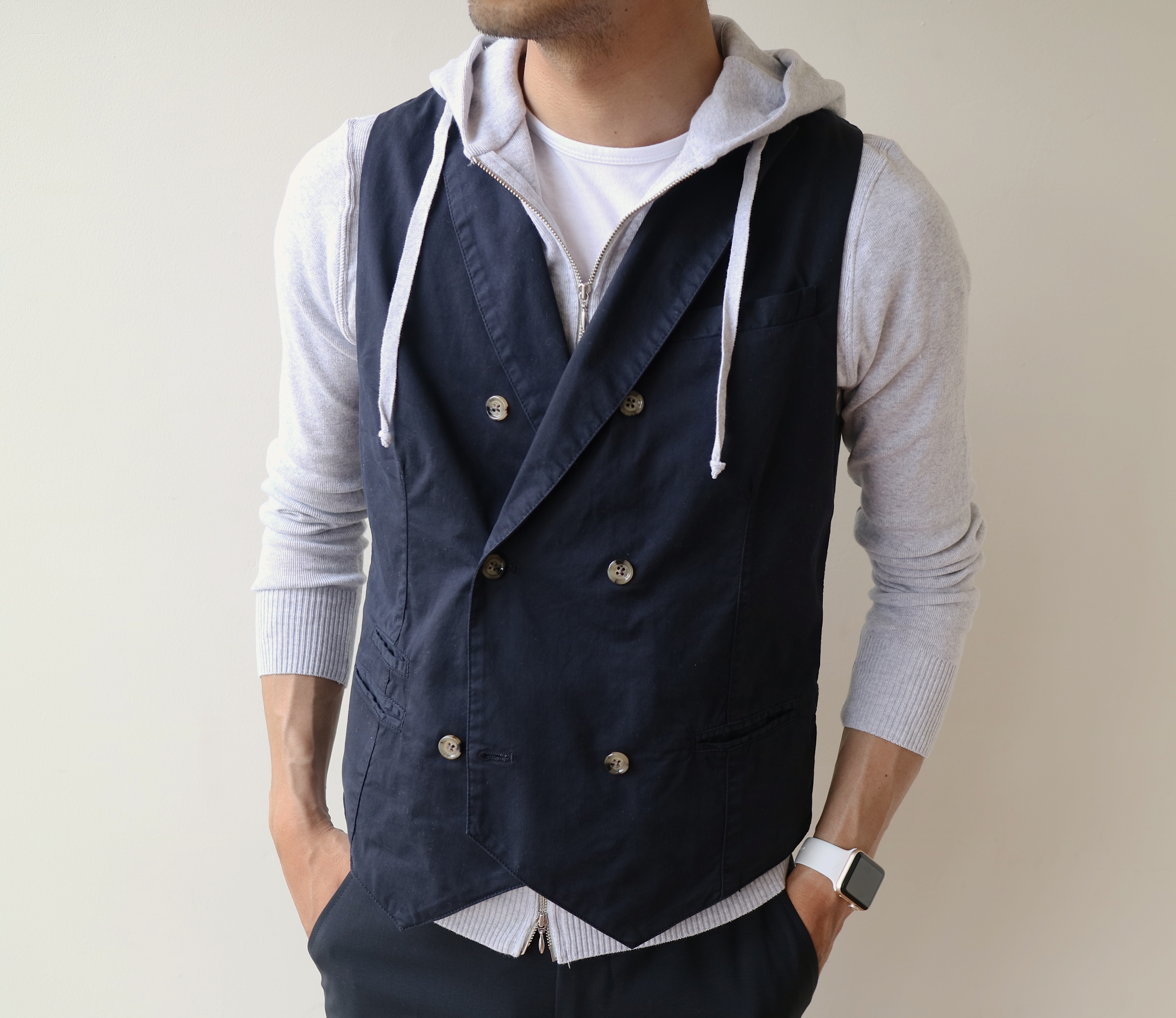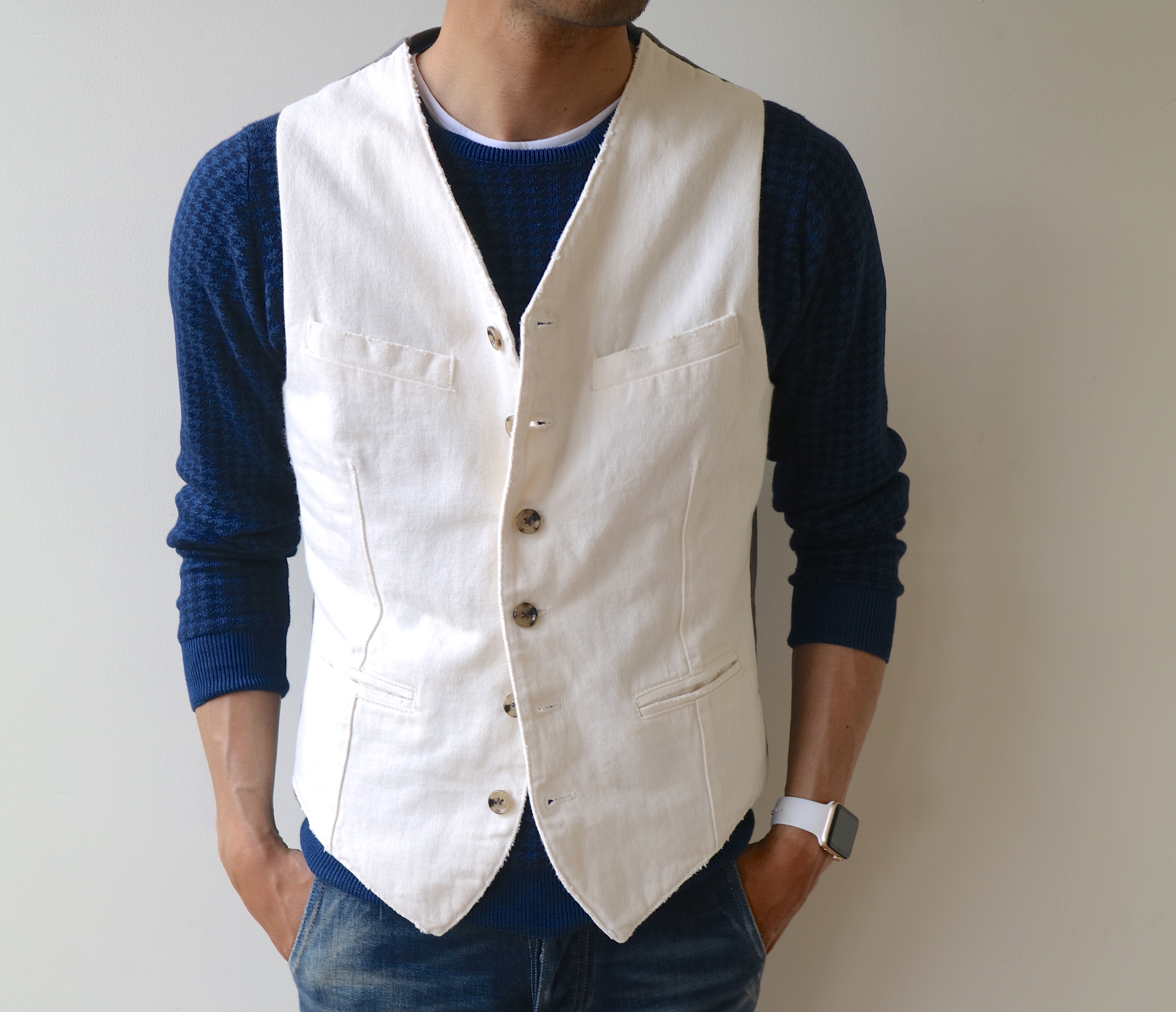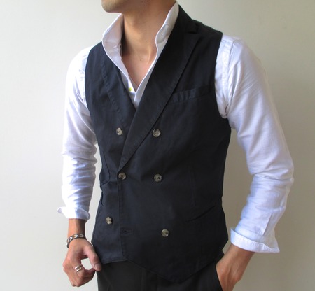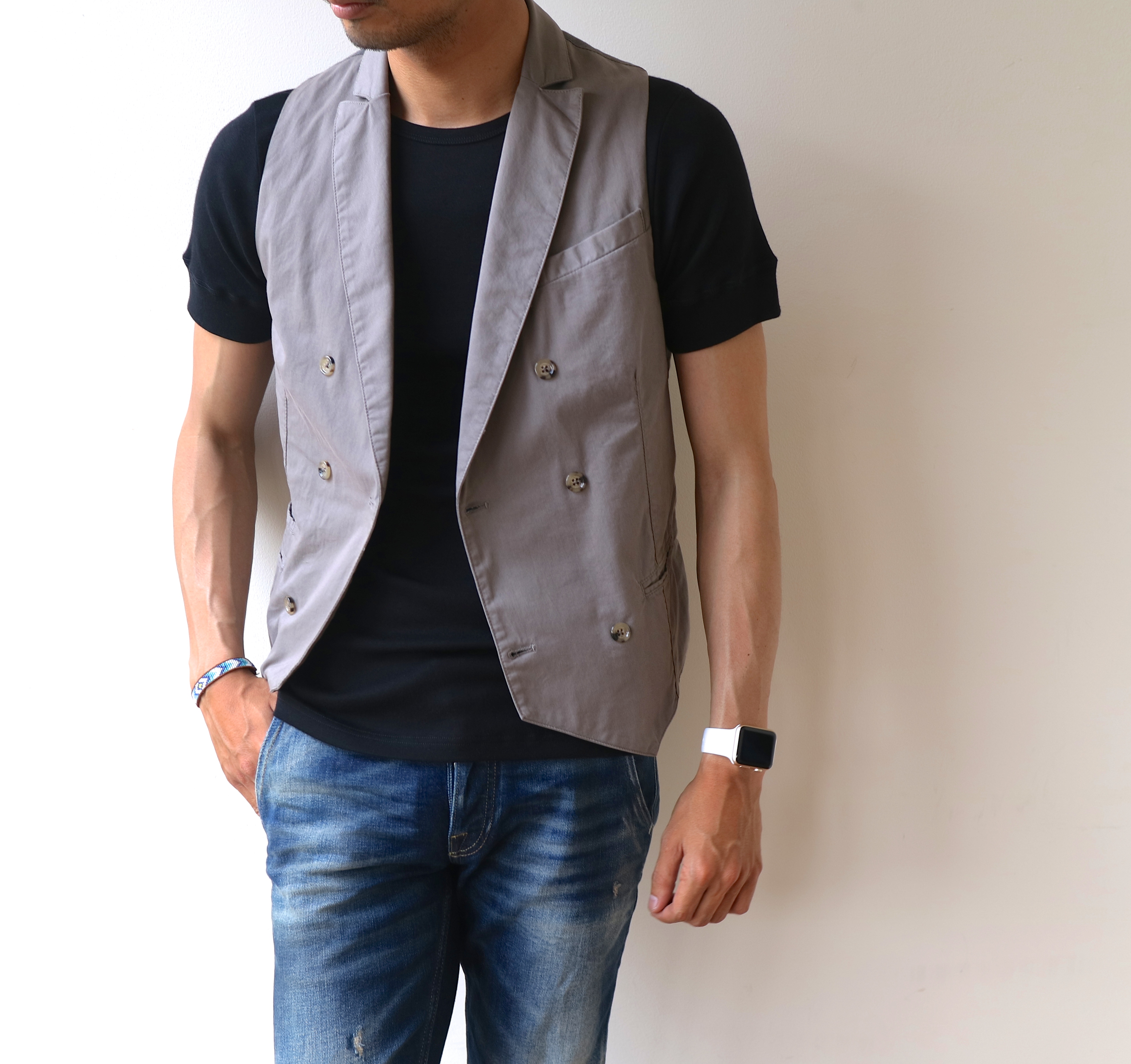 半袖のカットソーだけでは単調...そんなときはジレを上に乗っけるだけで、随分と印象を変えられます。時に釦を留めて、カチッと見せるのもアリ。夏場にかけて、お勧めの使い方でもあります。