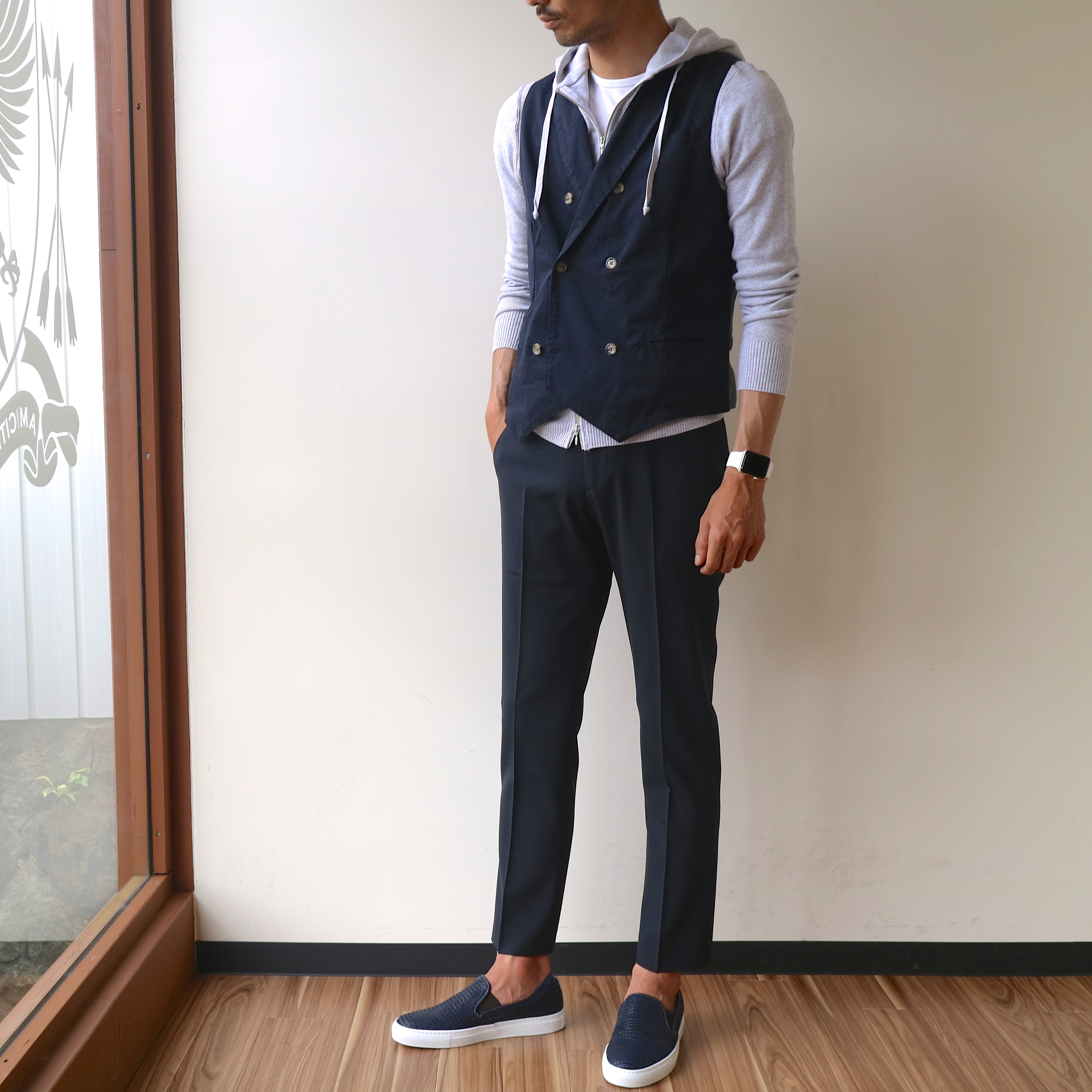 お洒落アイテム、ジレ。春夏・秋冬というより、オールシーズンで使ってしまってOKでしょう。 ジレーeleventy インのニットパーカーーLetroyes パンツーentre amis 靴ーPantofola d'Oro
