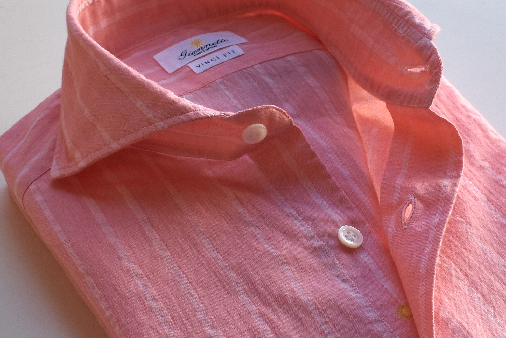 襟元を見ていただければ分かるように、夏仕様の薄手なコットンの生地。とってもソフトで、優しく肌を包み込んでくれるでしょう。今年の夏は、これを着て肌を小麦色に...ショートパンツと合わせても素敵でしょうね。