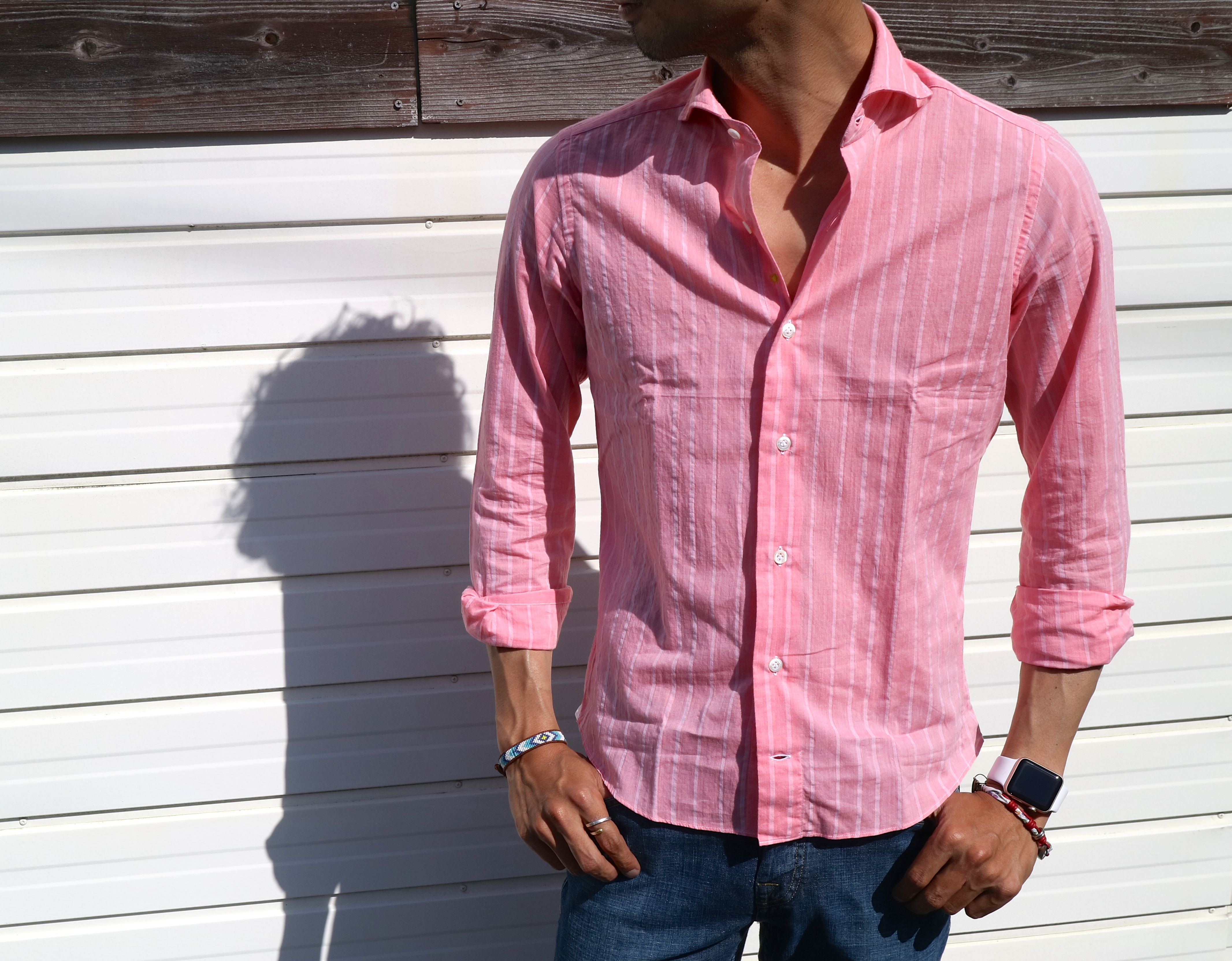 昨日は、サマーニット。今日は...、どうしましょう。日差しも随分強くなってきました。1枚でさらりと着れるシャツなんて、如何でしょうか。迷わず手に取ったのは、【Giannetto/ジャンネット】のストライプシャツ。日焼けした肌によく映えそうな、淡いピンク。1枚でも、十分絵になる表情が魅力です。