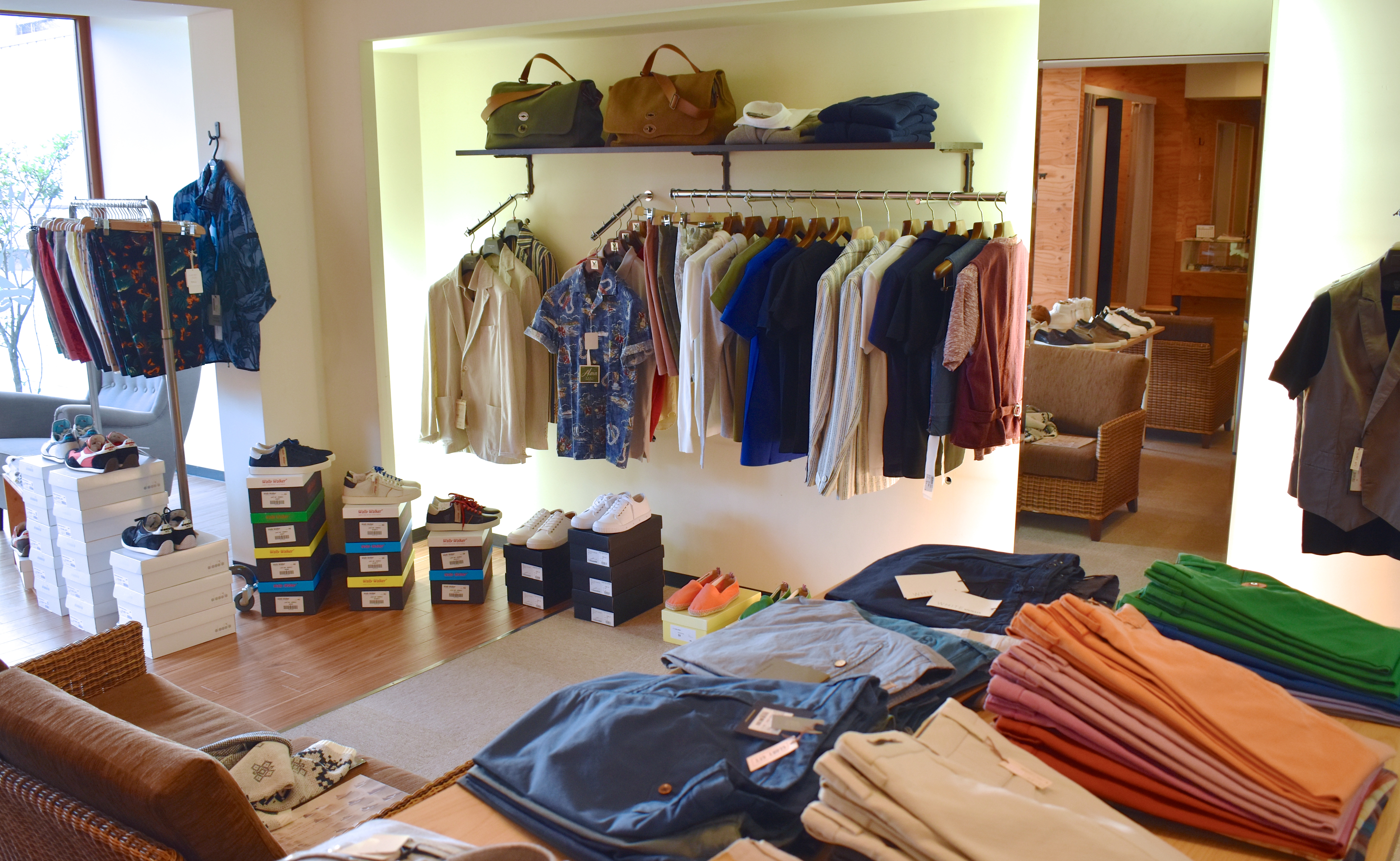 ファッションはいつも先取り。出勤するやいなや、売り場を夏ヴァージョンに変更です。好評をいただいたスニーカーフェアは、今日で終了。明後日の水曜日からは、夏物を積極的に売り出していきます。