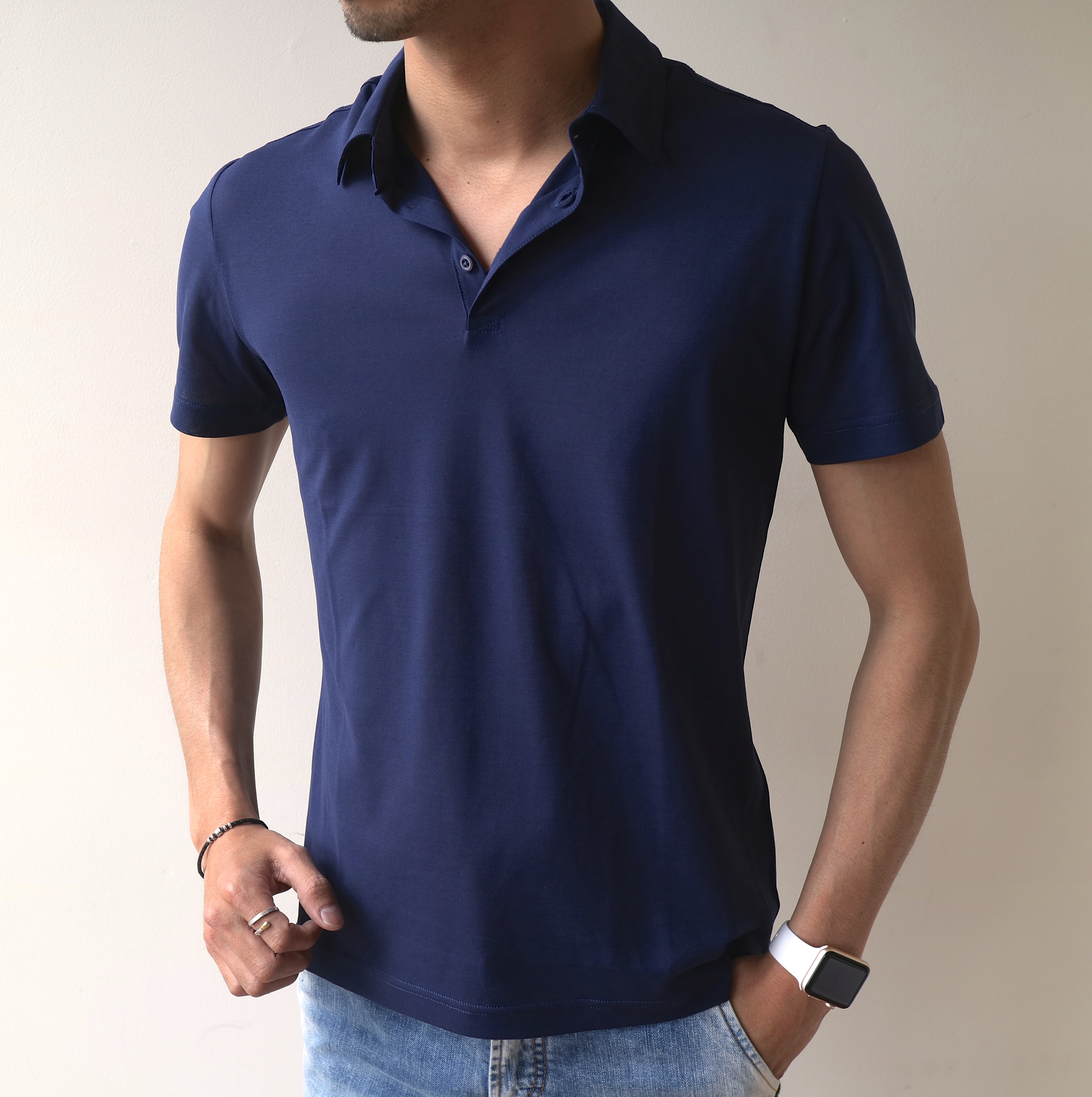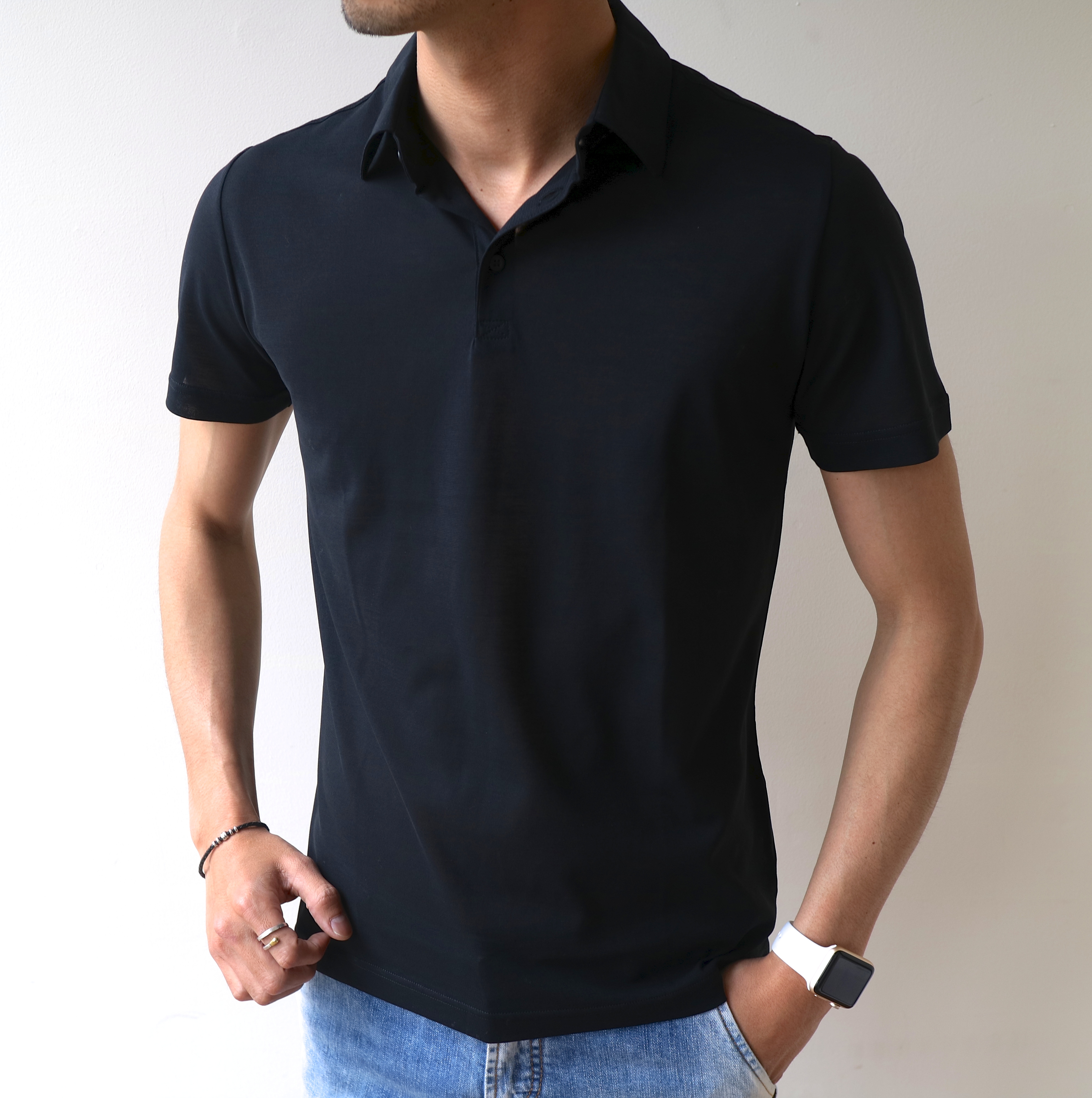 ホワイトに加え、ネイビーブルーとブラックの3色展開。程よい感じで艶っぽく、大人なポロシャツ。綺麗目なジャケットのインナーにも難なく使えそうですね。モデルは身長183cm・体重66kg・胸囲93cmで、サイズ46を着用しております。
