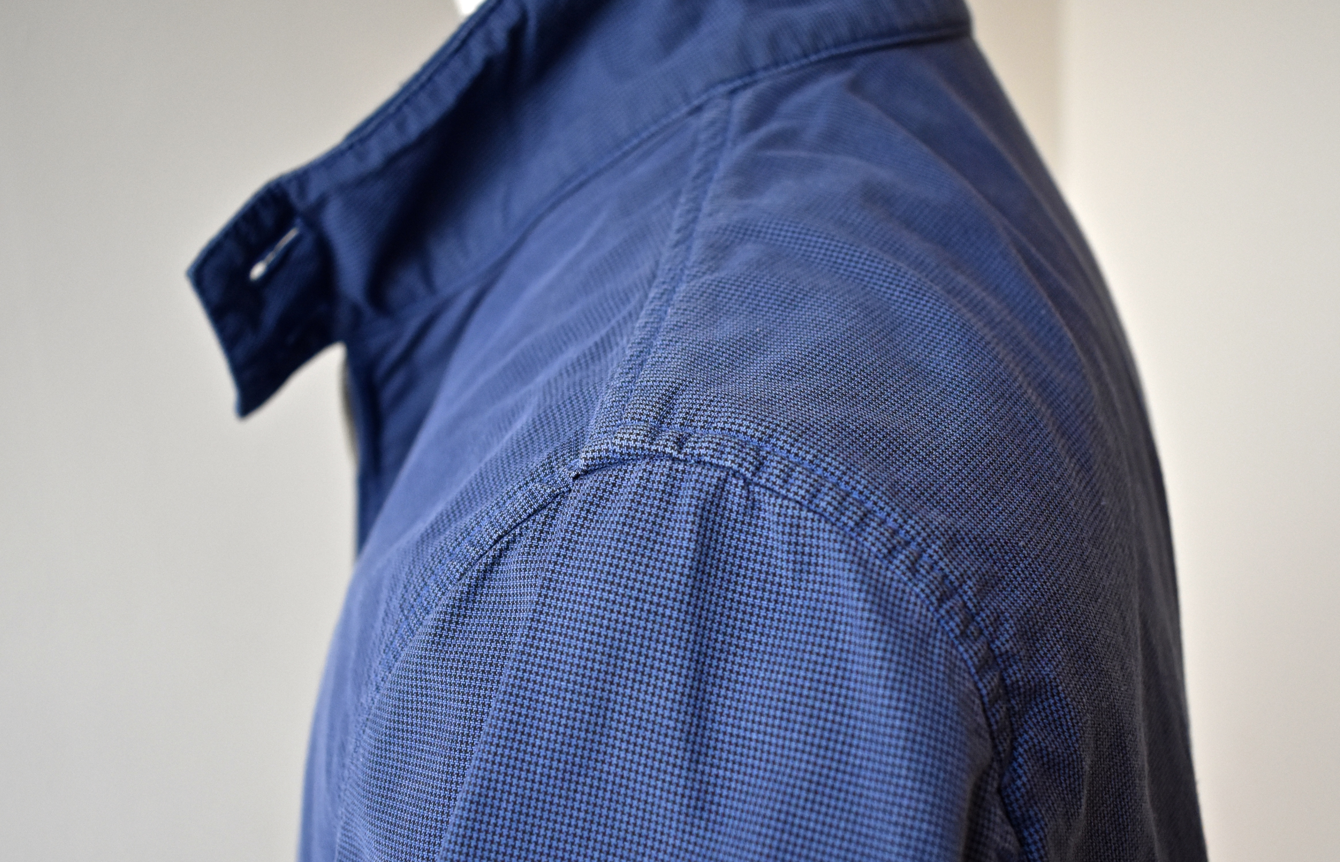 マイクロハウンドトゥースの生地は、ガーメントダイ(後染め)加工を施したもの。表現されたのは、何年も着込んだかのようなヴィンテージ感。肩のラインは、G9の代名詞の一つでもあるラグランスリーブではなく、肩のラインが強調されるセットインスリーブに。昔からのG9のファンの方にはお叱りを受けるかもわかりませんが、イタリア服にどっぷり浸かった身としては、妙に親近感を覚えてしまいます。洒脱感があって、こっちの方が好きだな...なんて贔屓はいけませんが、売り場で妙に気になっている存在です。