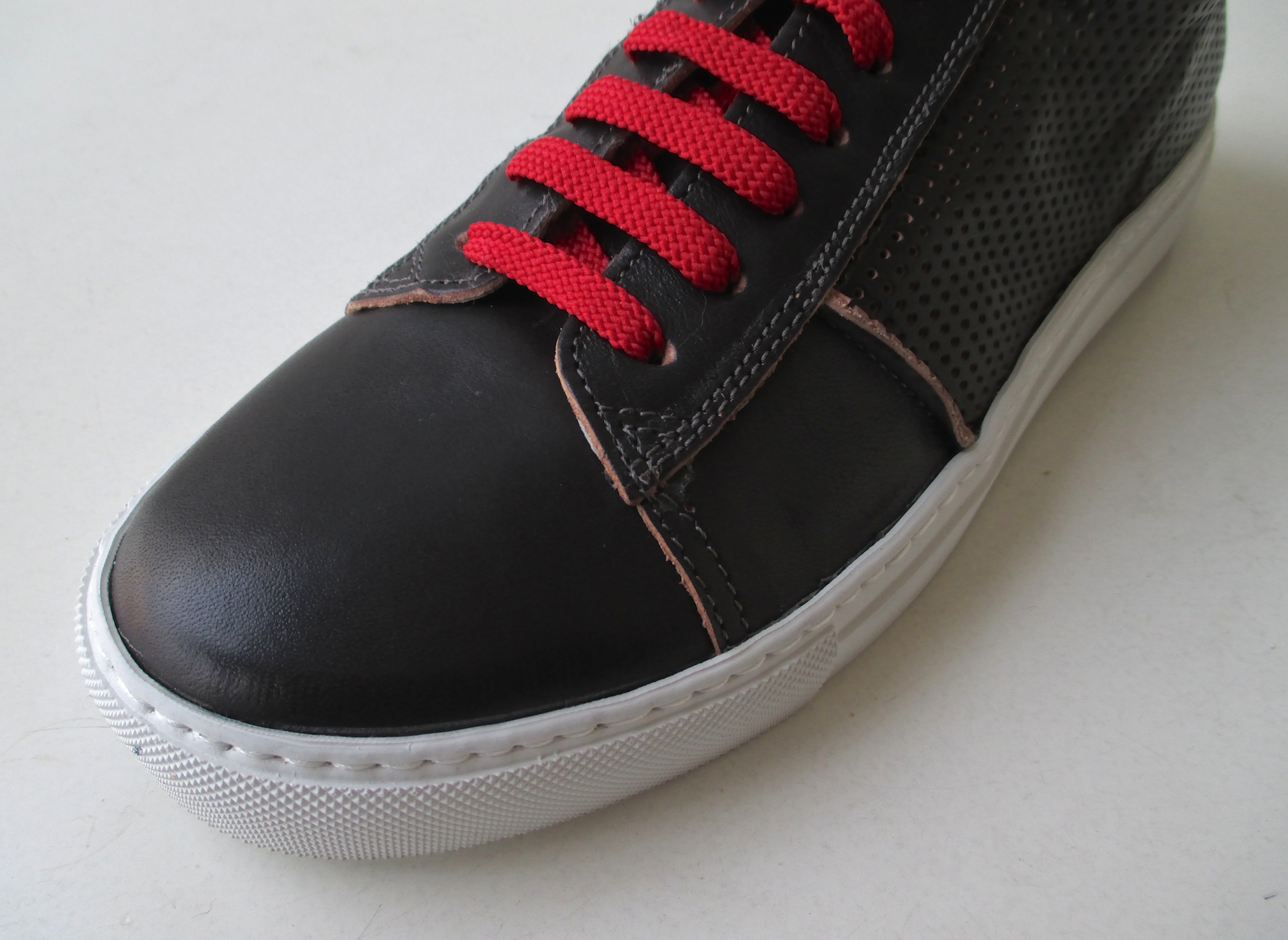 一目惚れのデニムスニーカーのセレクトを決めた後、すぐさま目に飛び込んで来たのが、こちらのパンチングレザーのスニーカー。ホワイトとツヤ感のあるブラックをご用意しました。