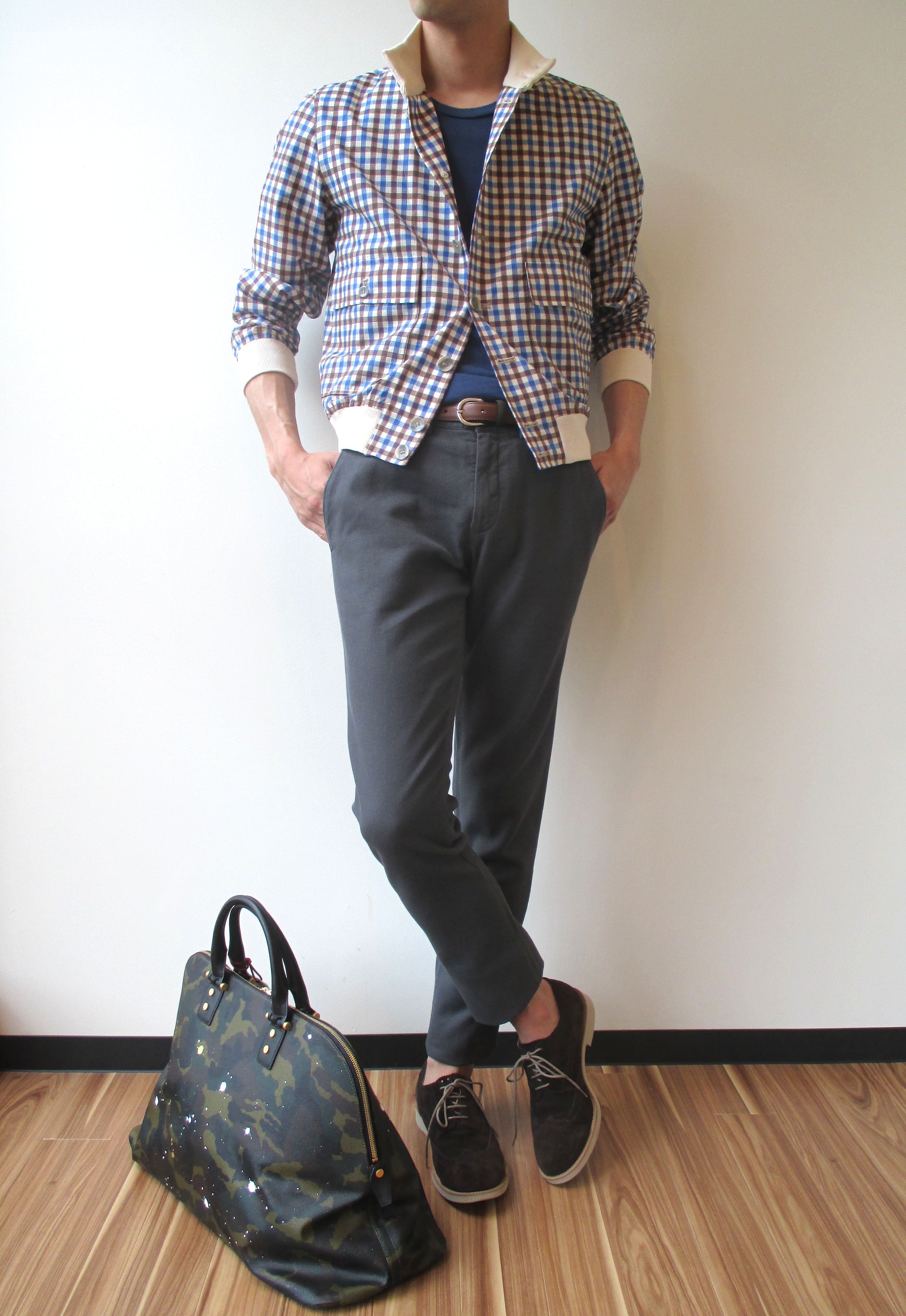 羽織ったブルゾンはVALSTARの"VARSTARINO"、カットソーはSeagreenのクルーネック、ベルトはAndrea D'AMICO、靴はDOUCAL'S、バッグはGENTIL BANDEITのハンドバッグです。