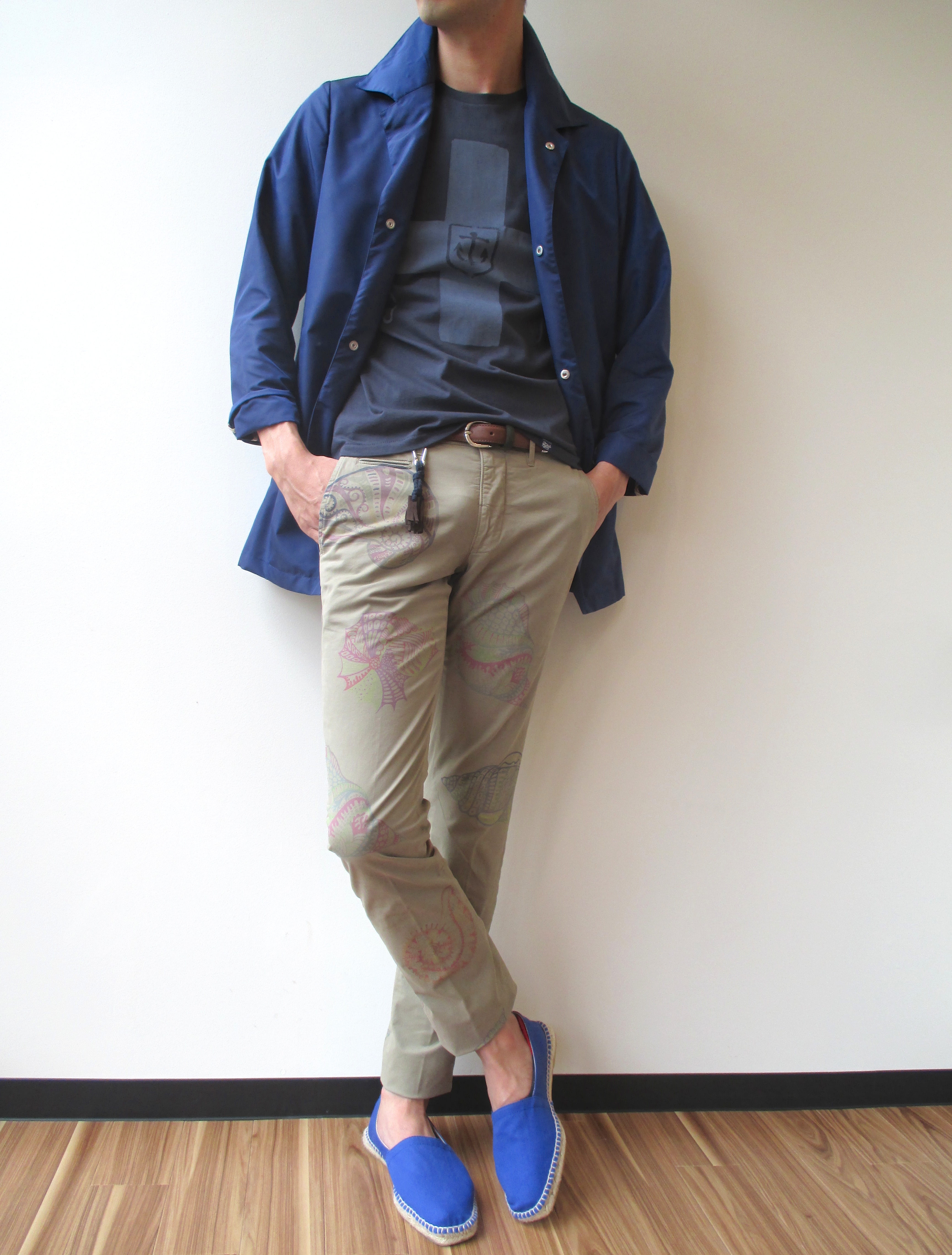 羽織ったのはVALSTARの"VALSTARINO"ショートステンカラーコート、中に着たカットソーはWOOLRICH、ベルトはAndrea D'AMICO、シューズはCastanerのエスパドリーユです。