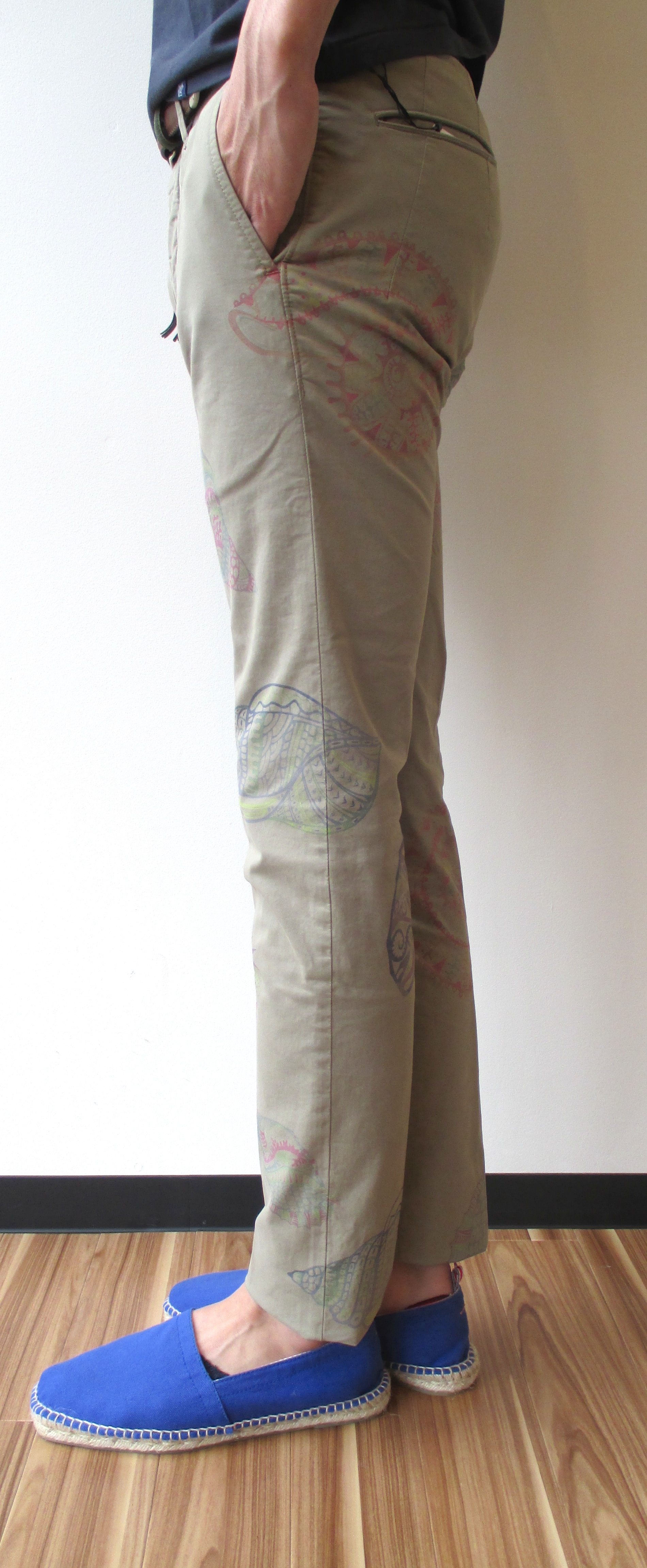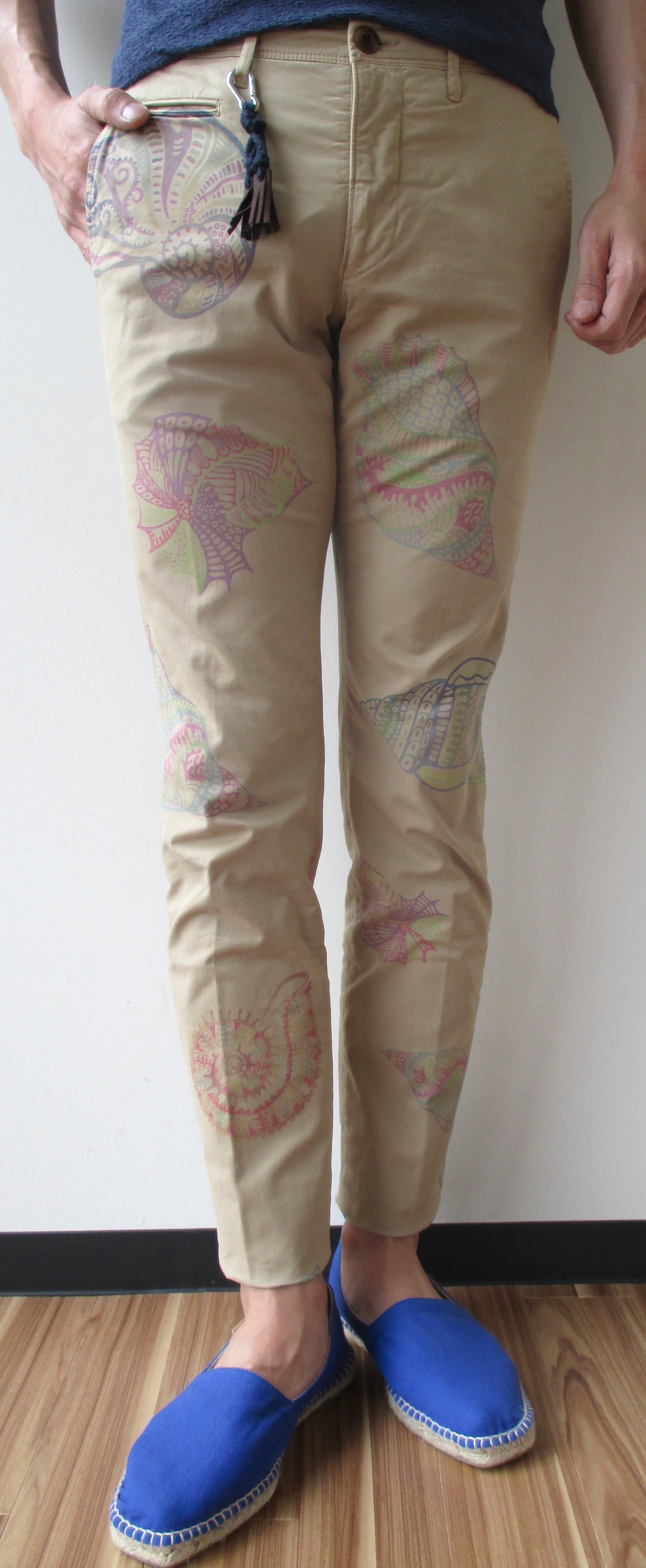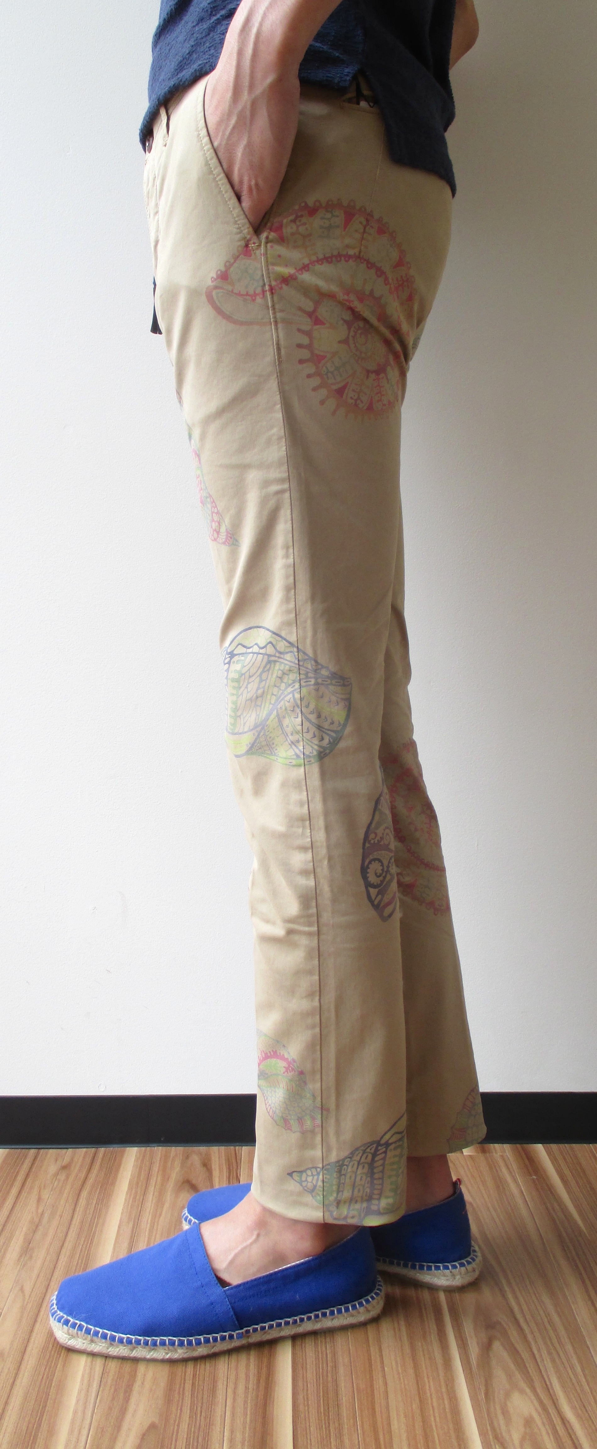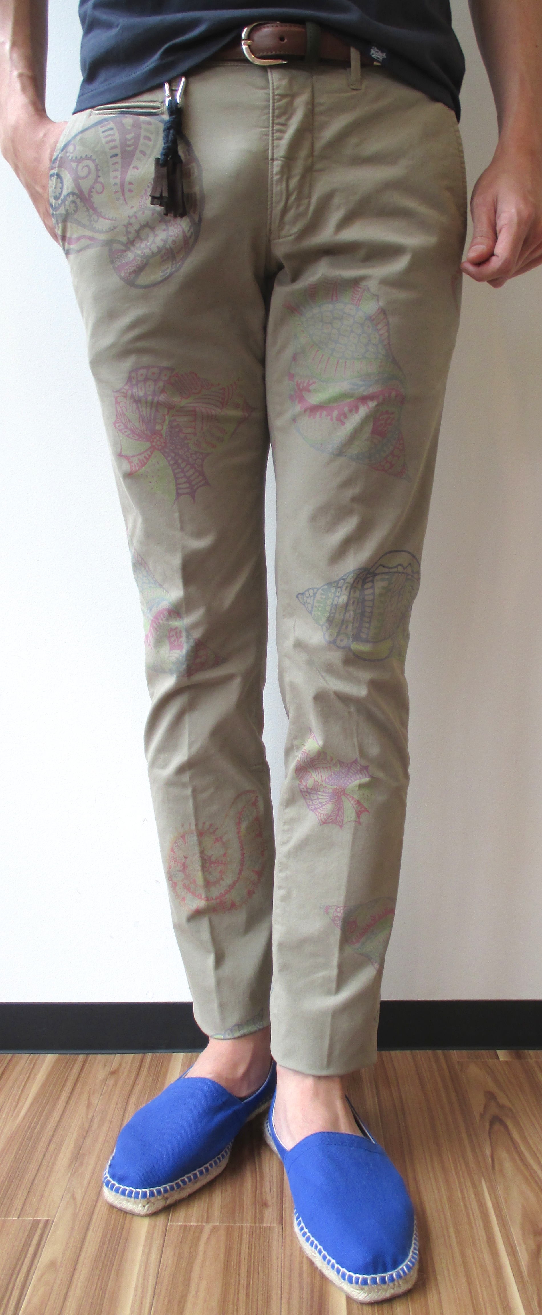 ユニークな柄物のご用意もございます。細身のベーシックなパンツにプリントされたのは、アンモナイトの化石です。