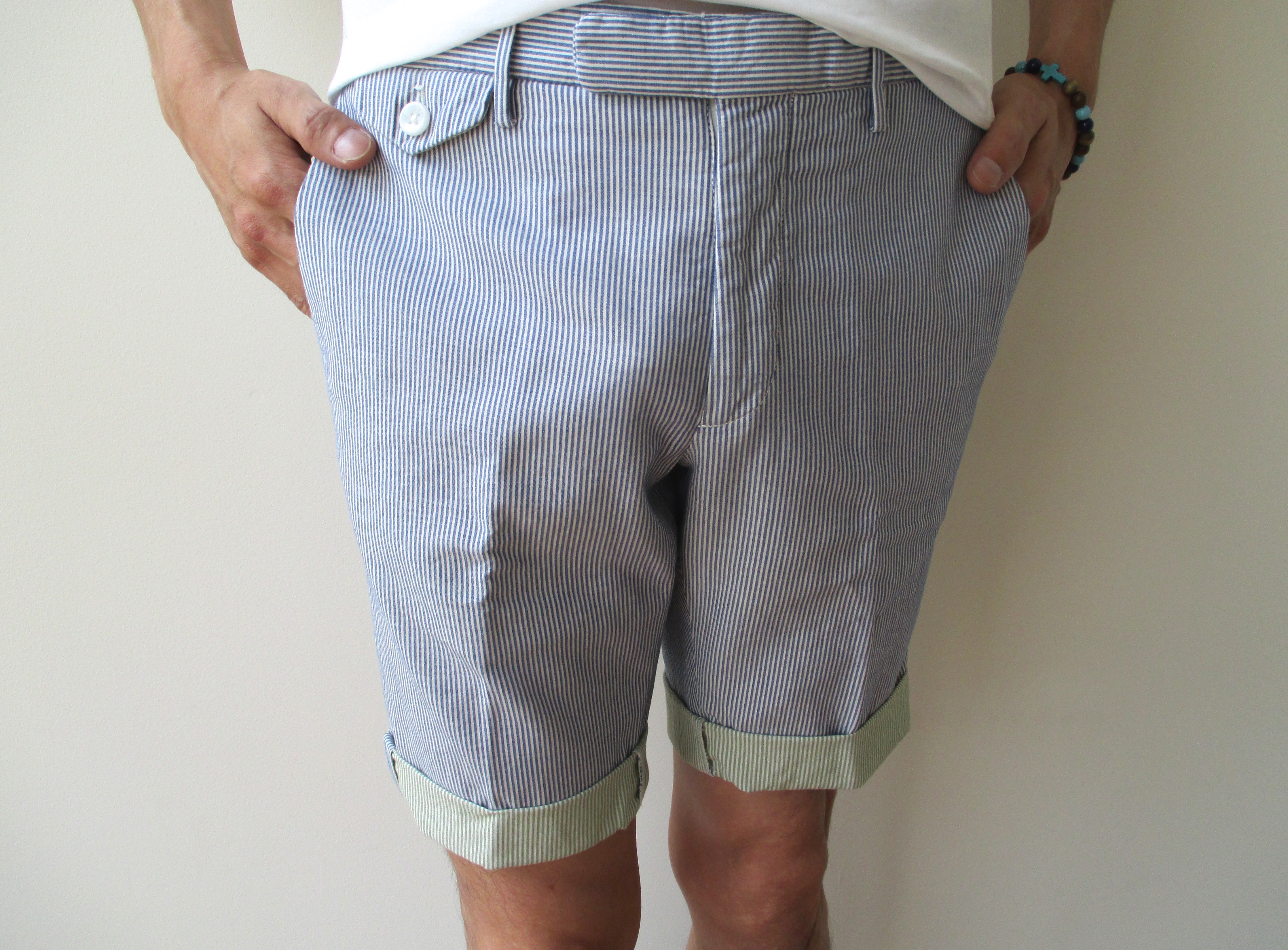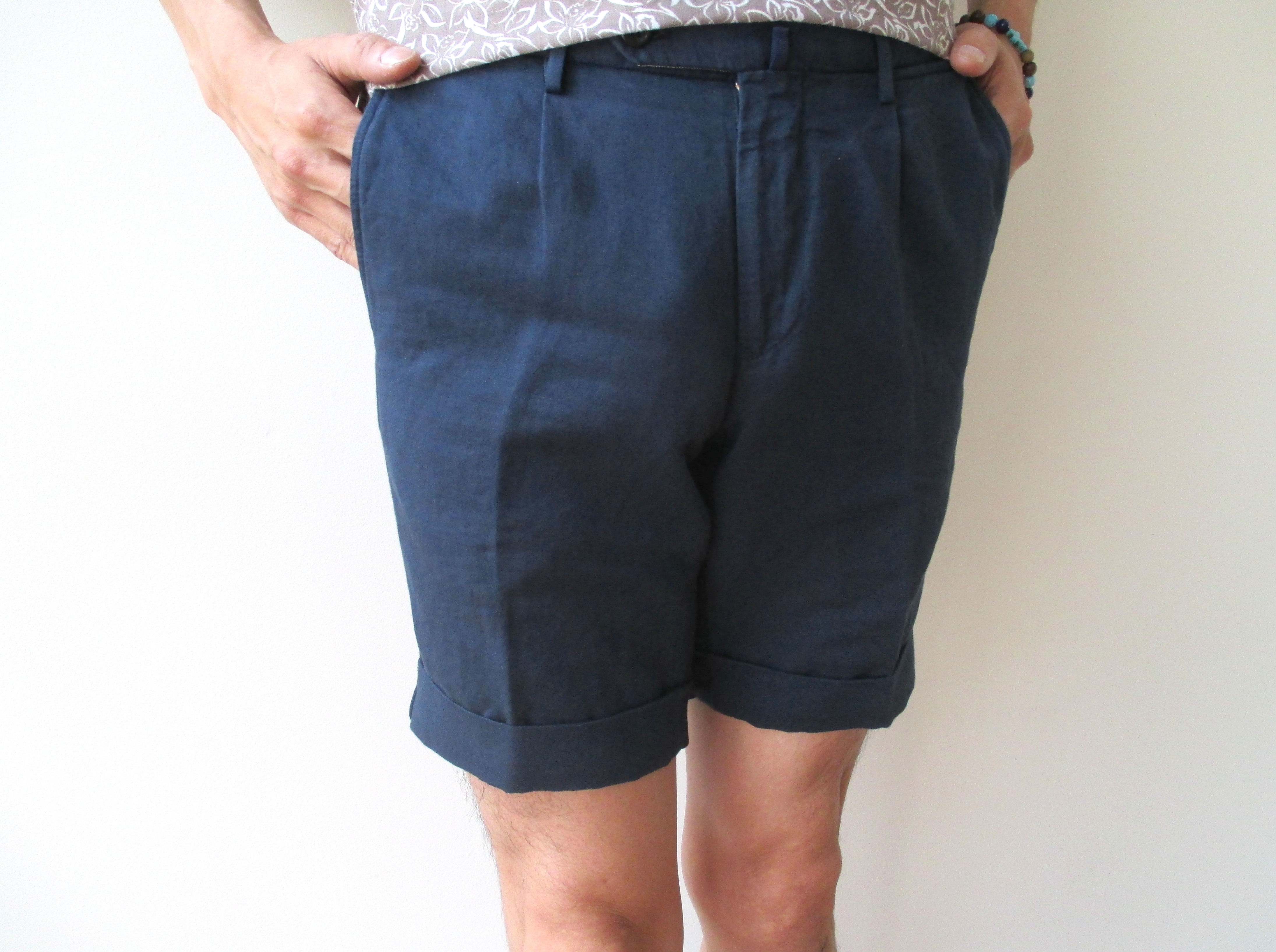 こちらの裾もターンナップ仕様。盛夏におけるショーツといえども、エレガントな着こなしの追求に手を抜かない諸兄には、最適なショーツになるはずです。ホワイトはスタッフの着用サイズがなく置き撮りですが、ご容赦下さい。