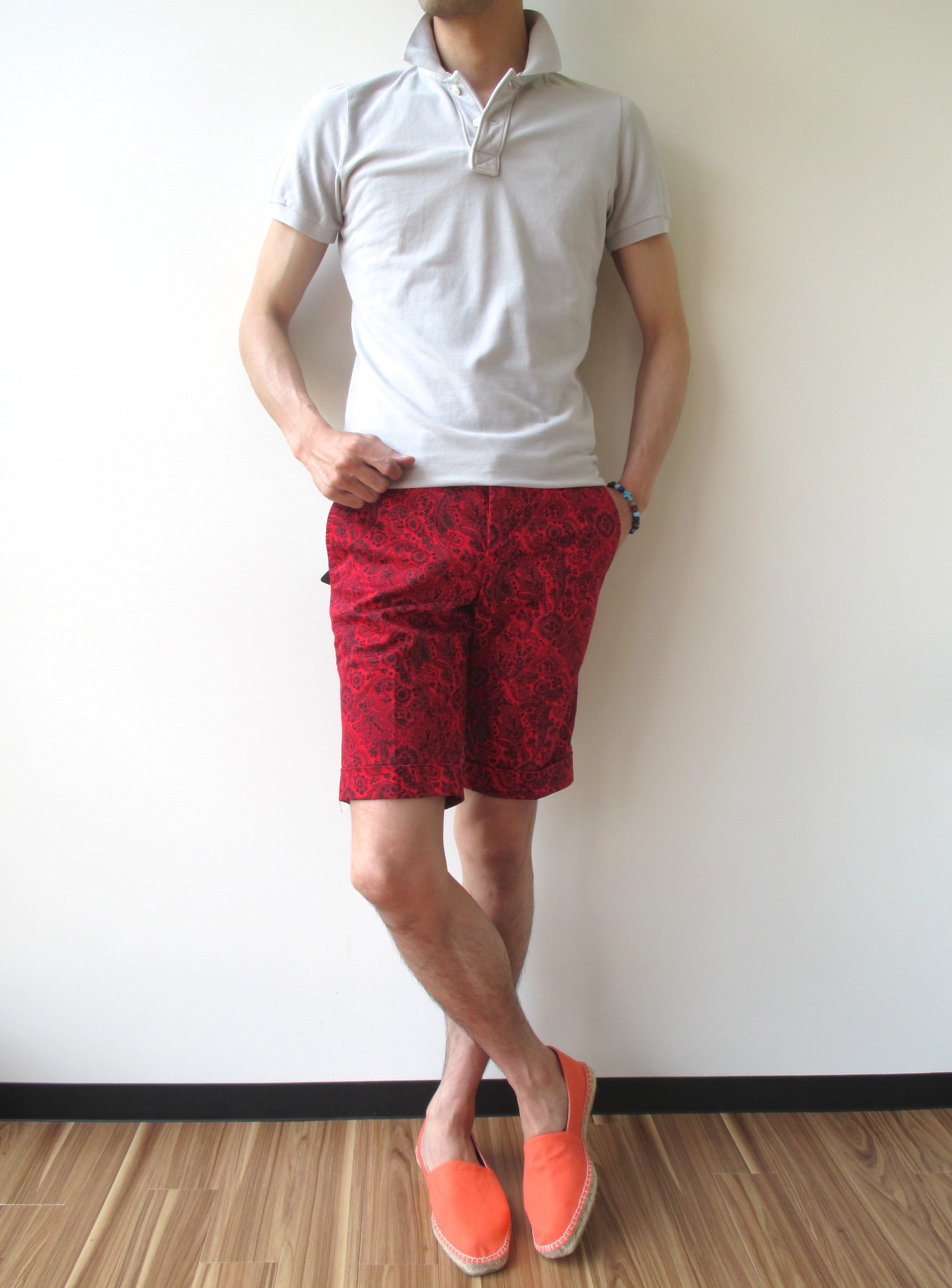 合わせたショーツはPT01のペイズリー柄ショーツ、靴はCastanerのエスパドリーユ、ブレスレットは私物です。