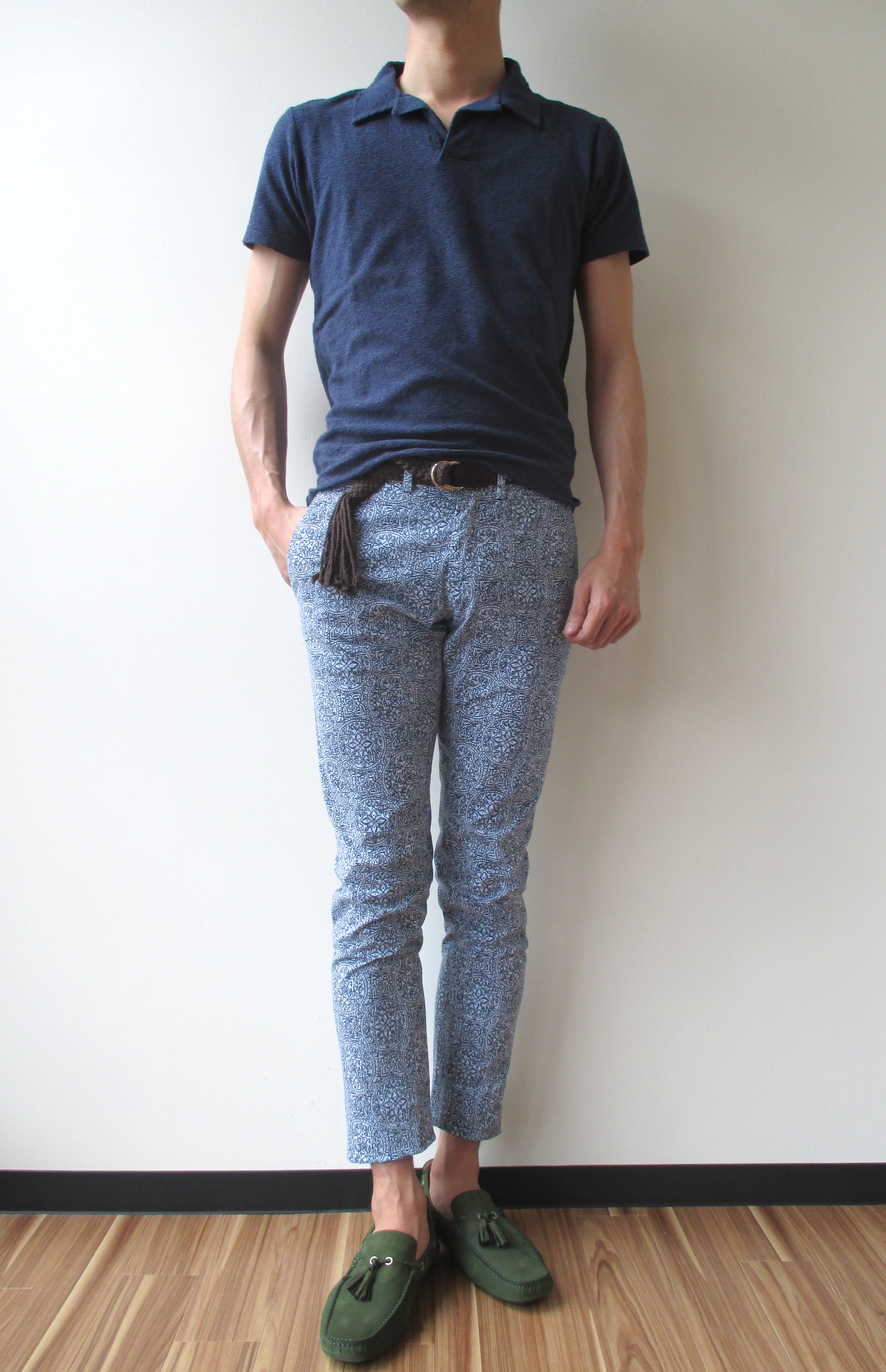 合わせたカットソーはSeagreenのパイルポロ、ベルトはAndrea D'AMICOのコットンメッシュベルト、シューズはDOUCAL'Sです。