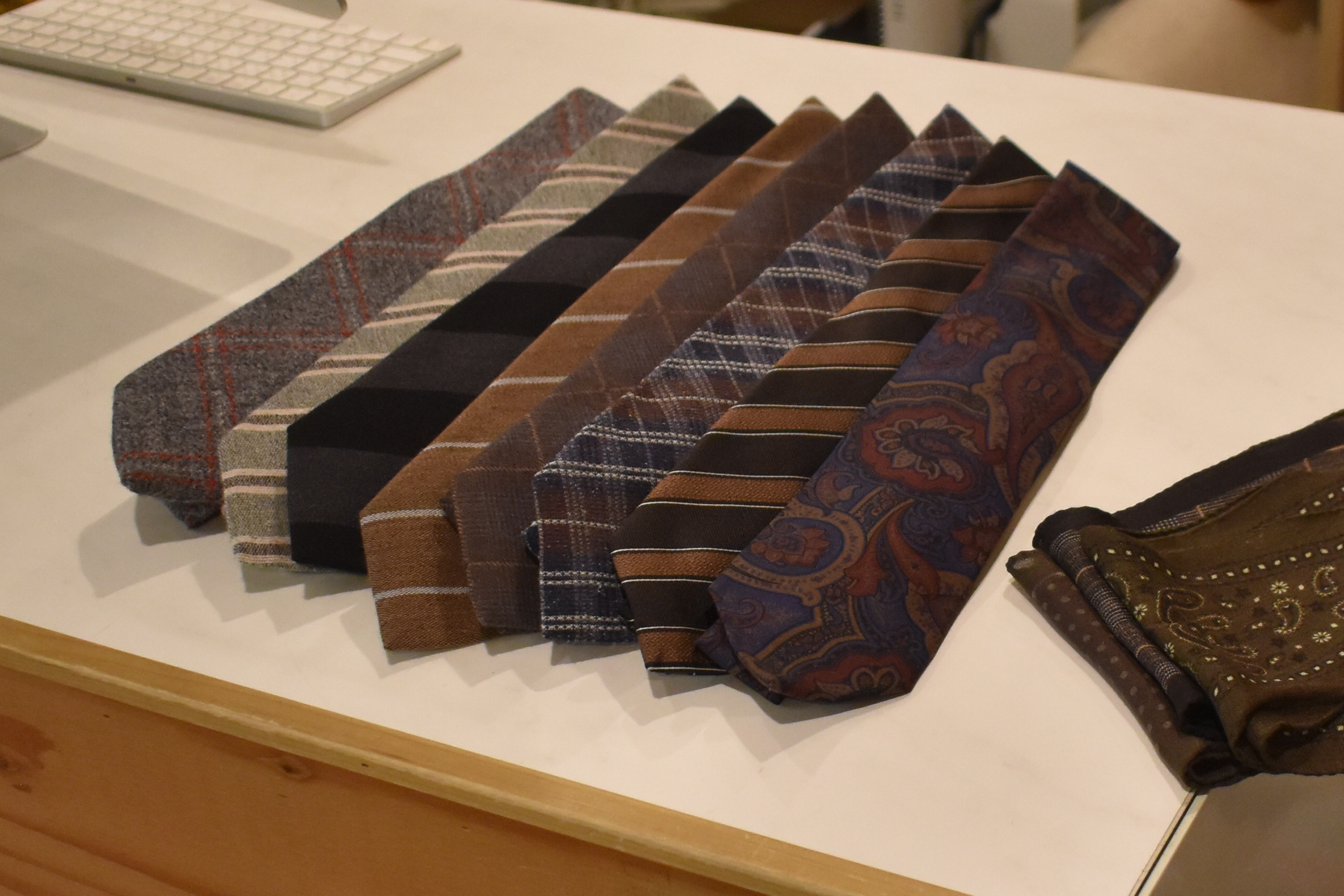 ネクタイ、ネッカチーフなどの小物系も先ほど入ってきました。店頭の在庫を覗いていただければ、その充実度にきっと驚かれることでしょう。9月から蔵開きをしておりますが、出遅れ感は全く感じられないはずですので、明日・明後日と、是非ご来店ください。お店まで足をお運びになれないお客様方につきましては、通販サイトOUTLETの項目にて、色々とご覧くださいませ。