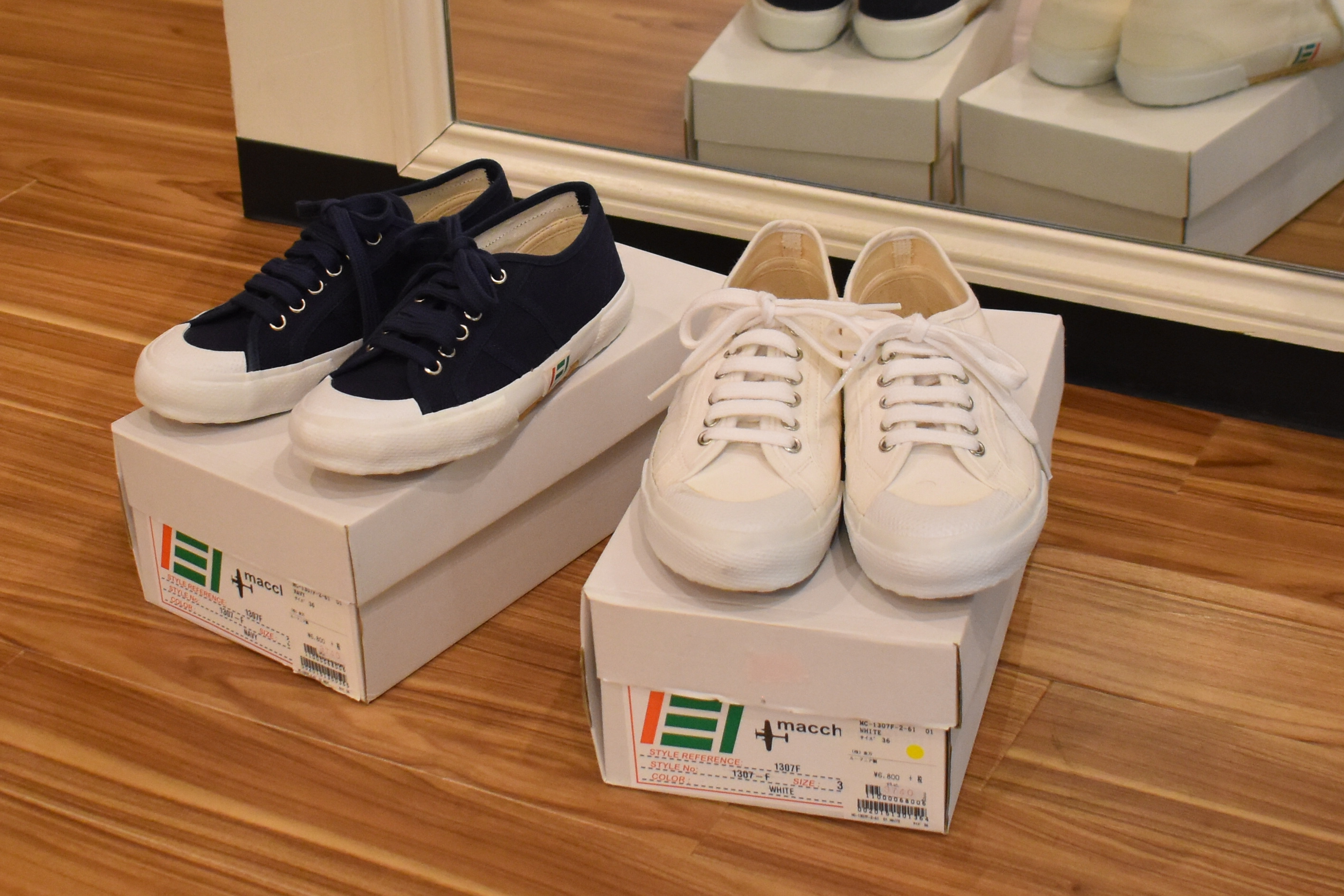 ちょっと前に入ってきたのは、スニーカー。ついつい洋服ばかりに目がいってしまいますが、ちょっと目線を落とせば、ここにも見逃せないアイテムです。HESCHUNG/エシュンのチャッカブーツ風のスニーカーと、Pantofola d'Oroのレザースニーカー。サイズが合う方はご注目ください。