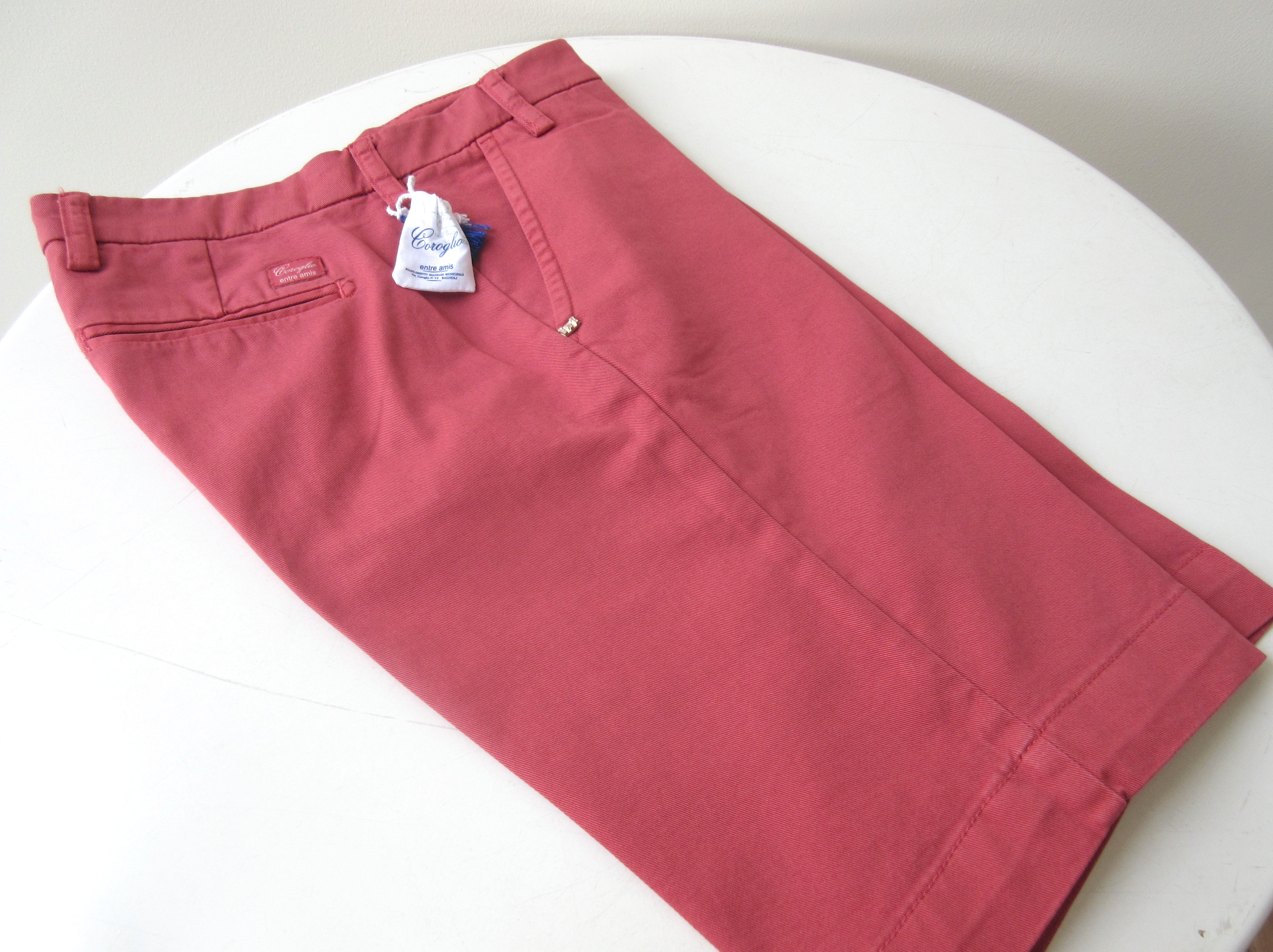 【entre amis/アントレ・アミ】は南イタリア・ナポリのパンツ専業メーカー。ブランド創業は2007年ながら、新進気鋭のブランドとして、かのピッティ・ウォモでも高い注目を浴びています。今回ご紹介するショーツは、ナポリ近郊のビーチに由来する「Coroglio/コロリオ」シリーズから。商品タグにも、パンツにも「Coroglio」と明記されており、ビーチやクルーズを意識したラインになります。