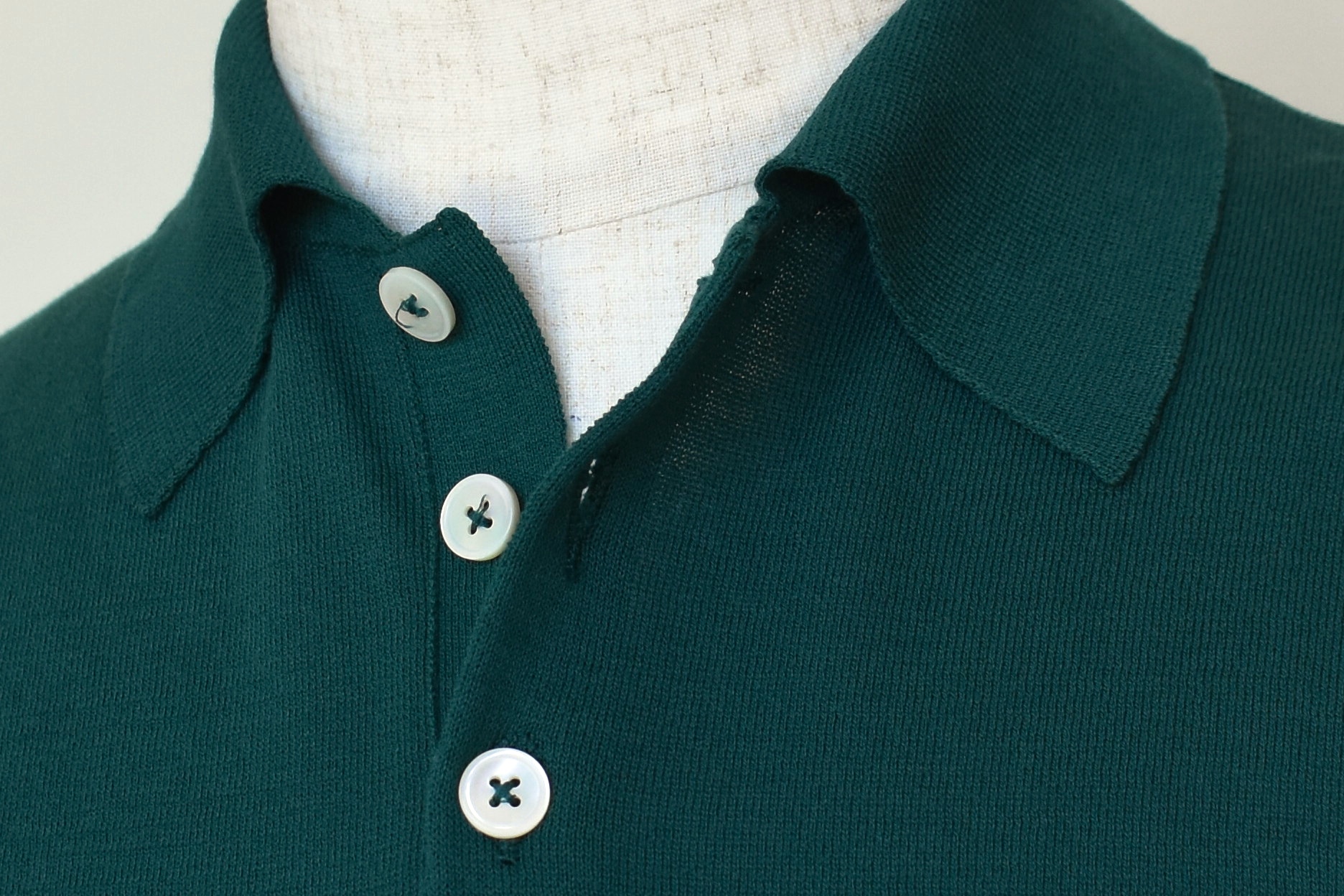 鮮やかなグリーン。ですが、不思議とアダルトに見えます。ニットポロだからでしょう。やや大きめな貝釦がさり気なく主張をします。