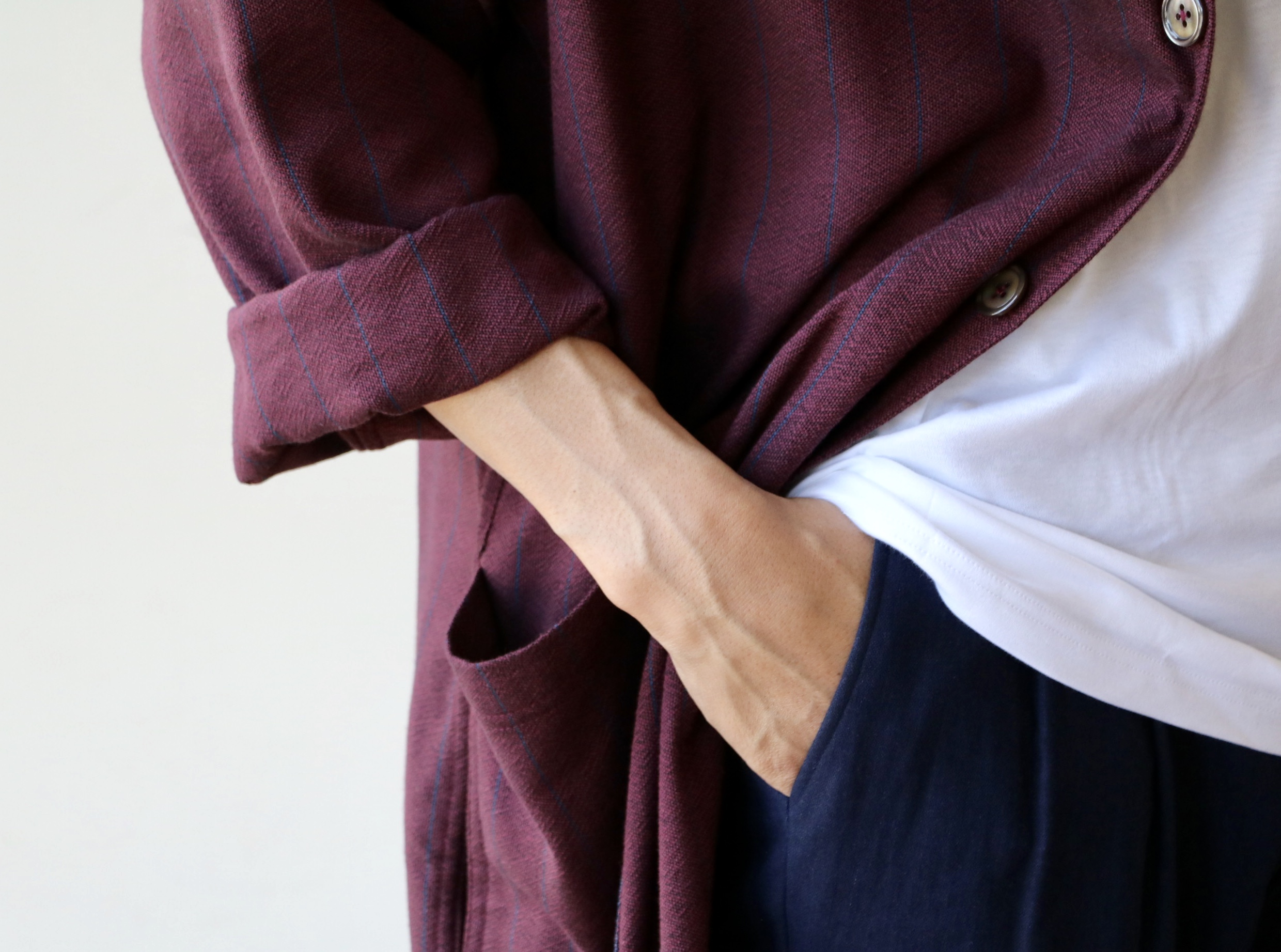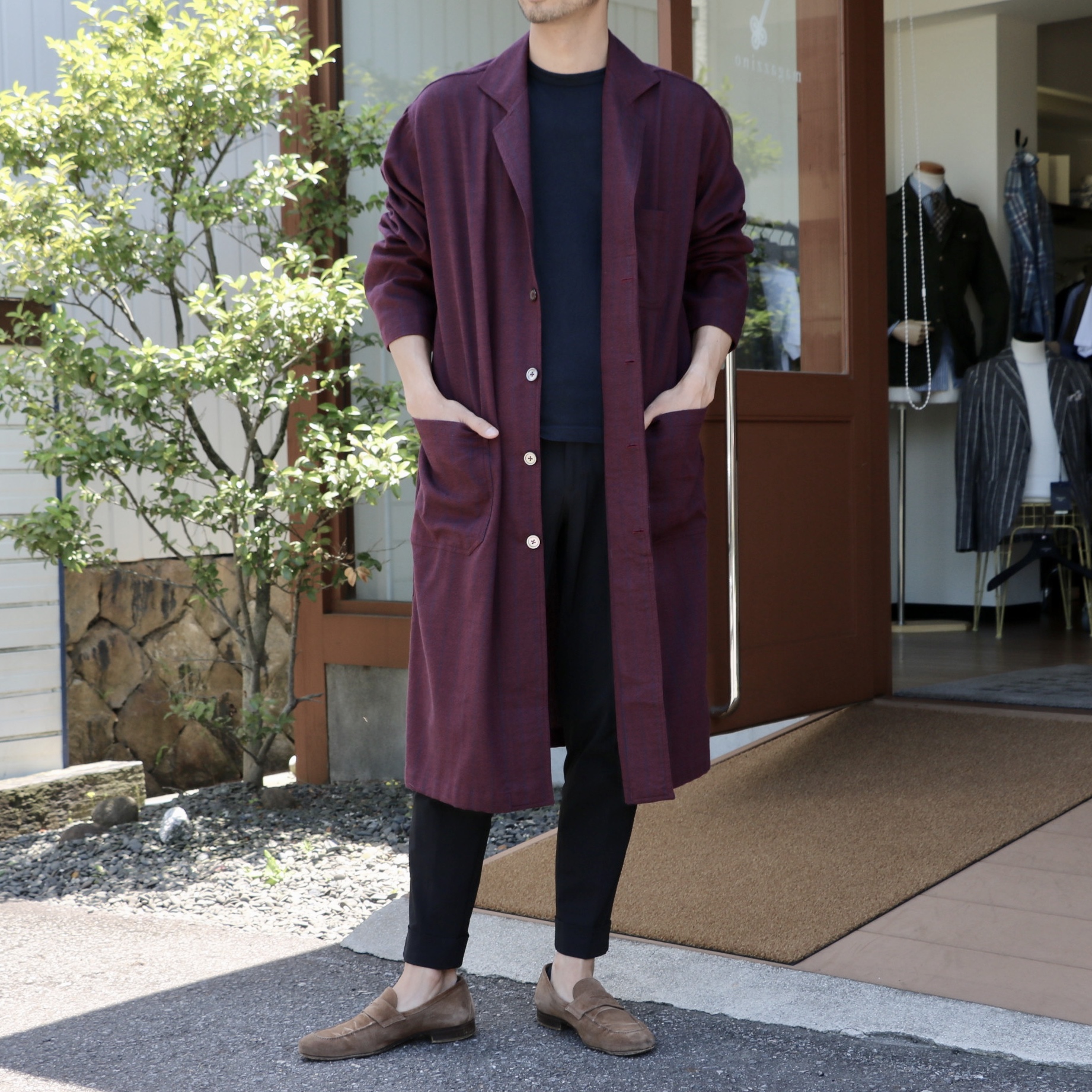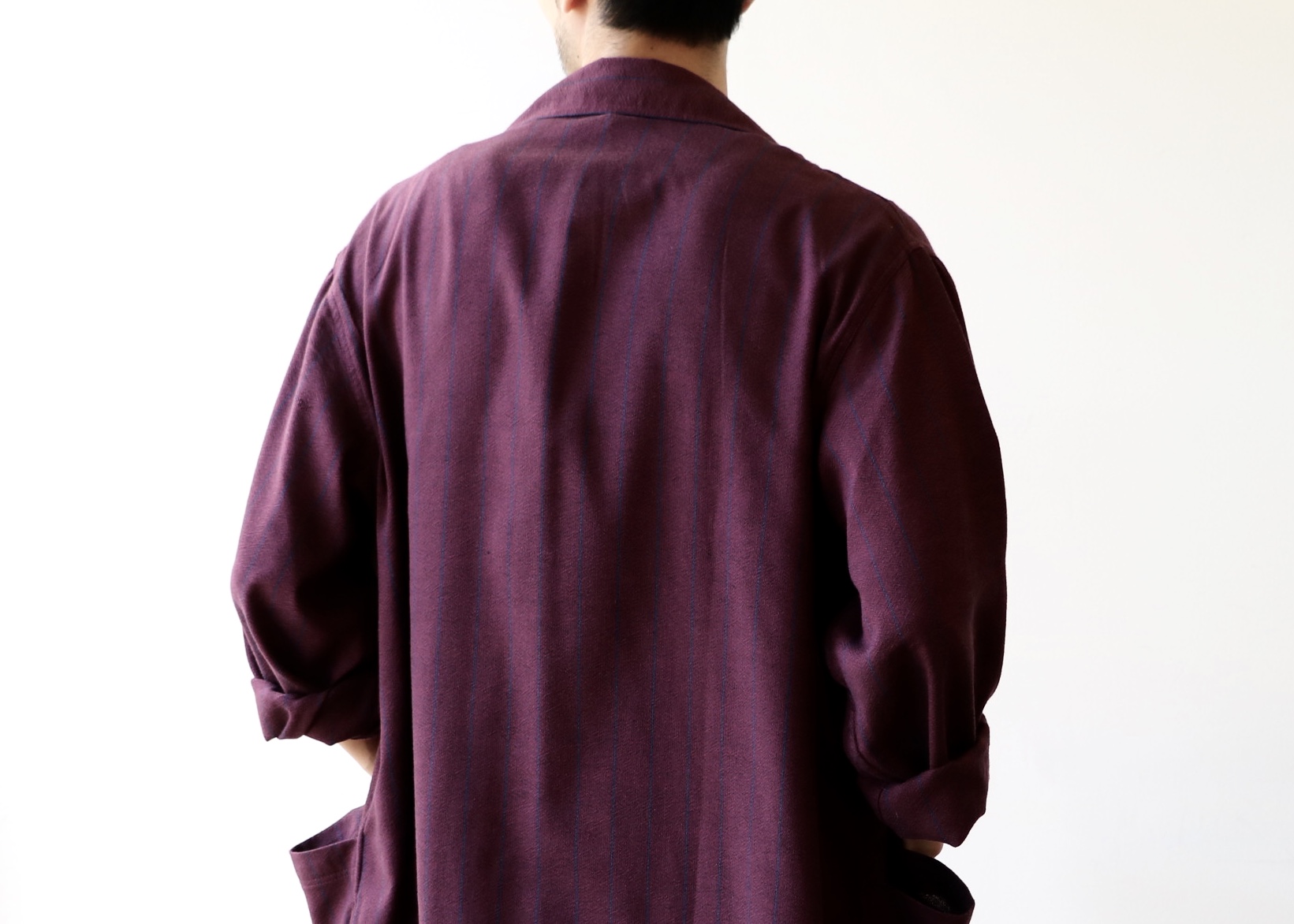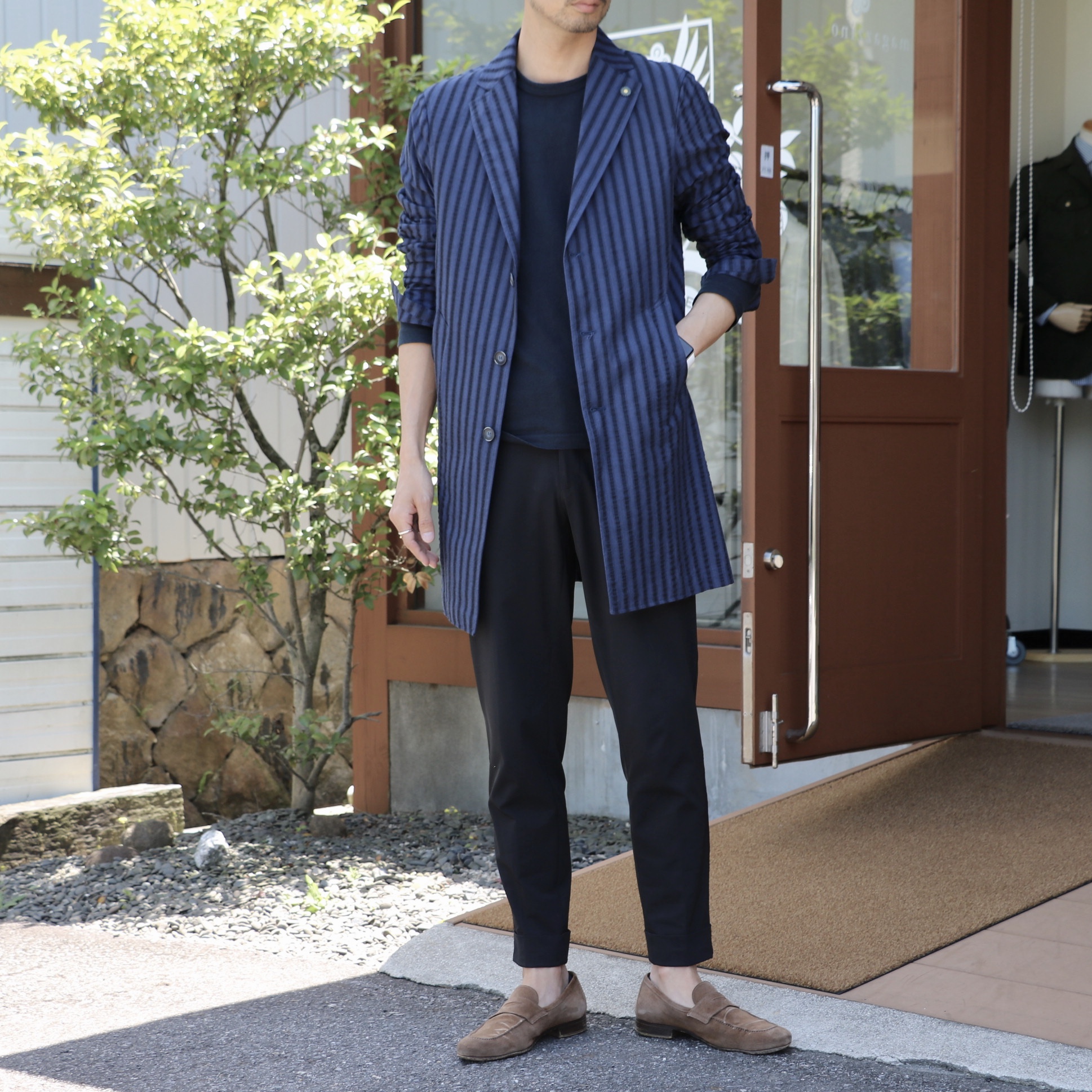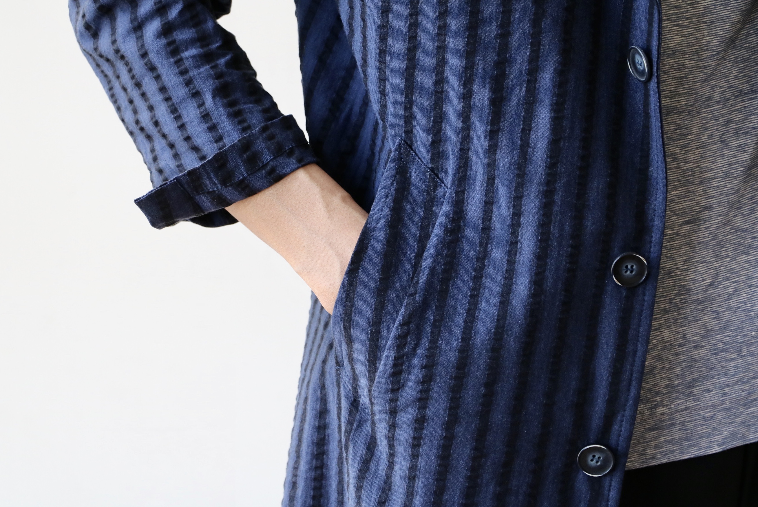 ブルーとネイビーの幅広ストライプは、シアサッカーの生地。前者のコートと同じですが、夏はTシャツの上に、バッサリ羽織って欲しい1枚です。