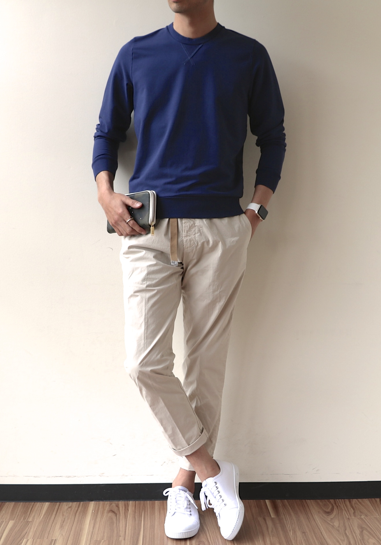 パンツは、White Sand。リラックス感とオシャレ感の両方を追求できる、今までになかったタイプのパンツ。我々のお店でも好評ですが、大手のお店さんでもよく売れていると情報が入ってきています。手に持った長財布はGENTIL BANDIT、スニーカーはSpring CourtのG2です。