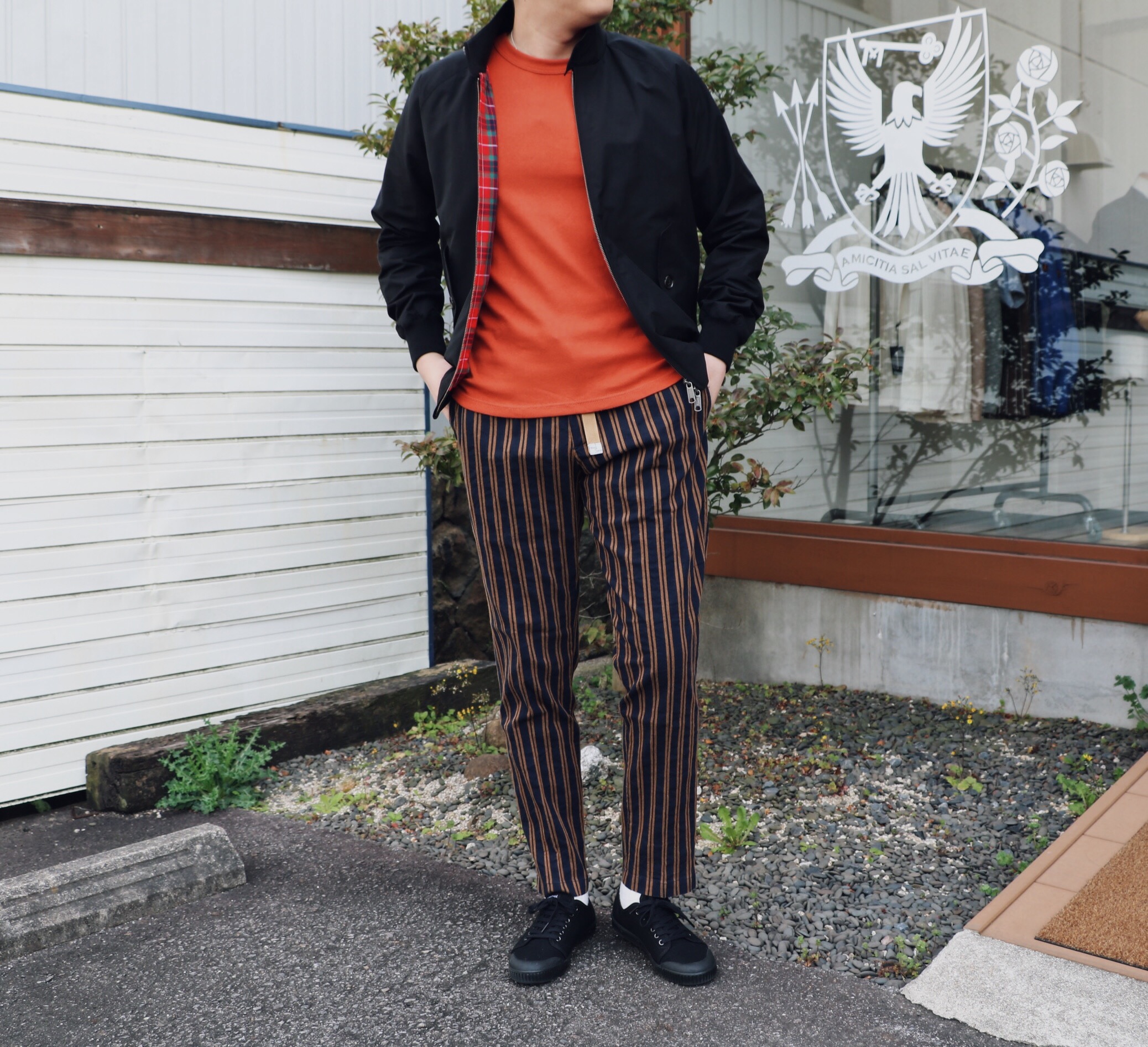 ブラウンのパンツで合わせたブルゾンはEMMETI(エンメティ)、ネイビーはHERNO(ヘルノ)、カットソーはどちらもPANICALE(パニカーレ)、足元のスニーカーはspring court(スプリングコート)の色違いです。