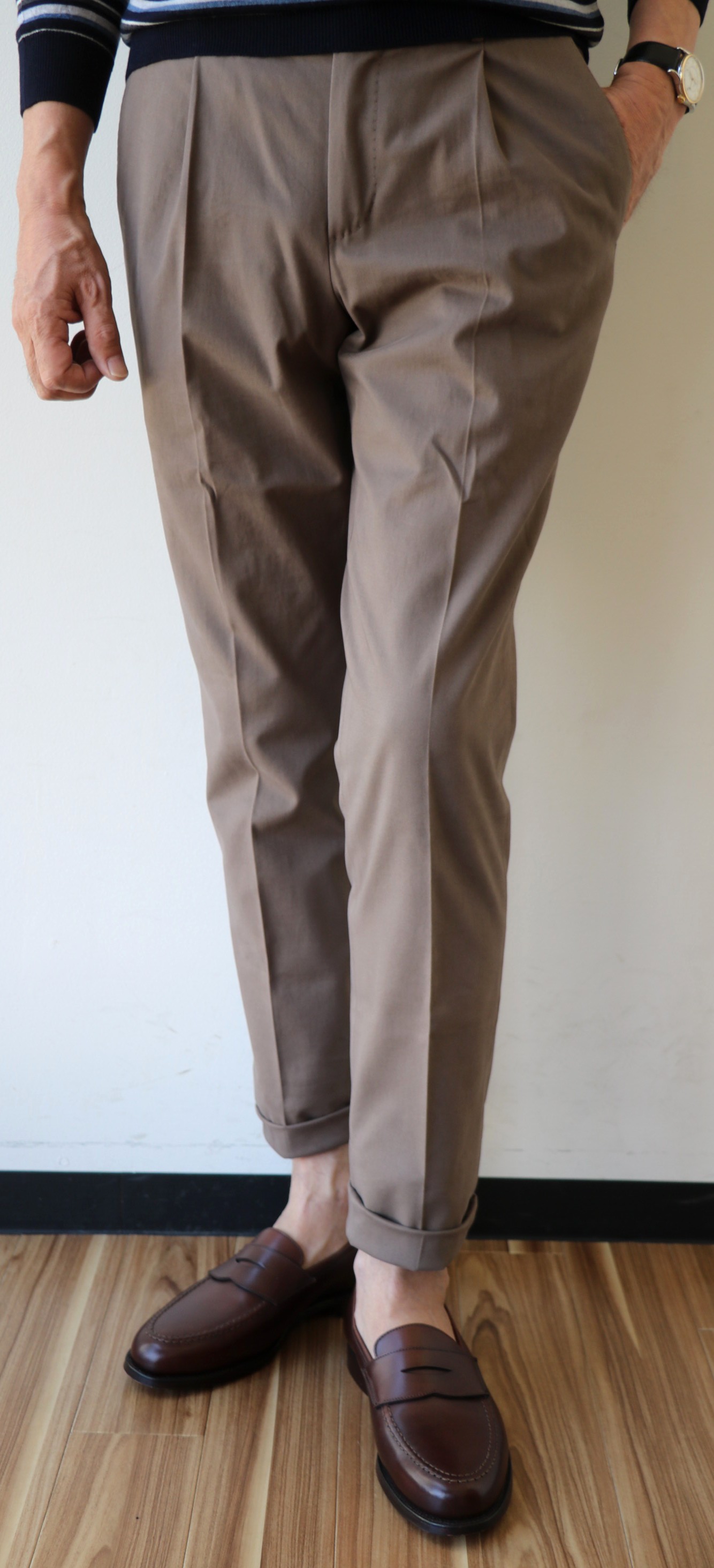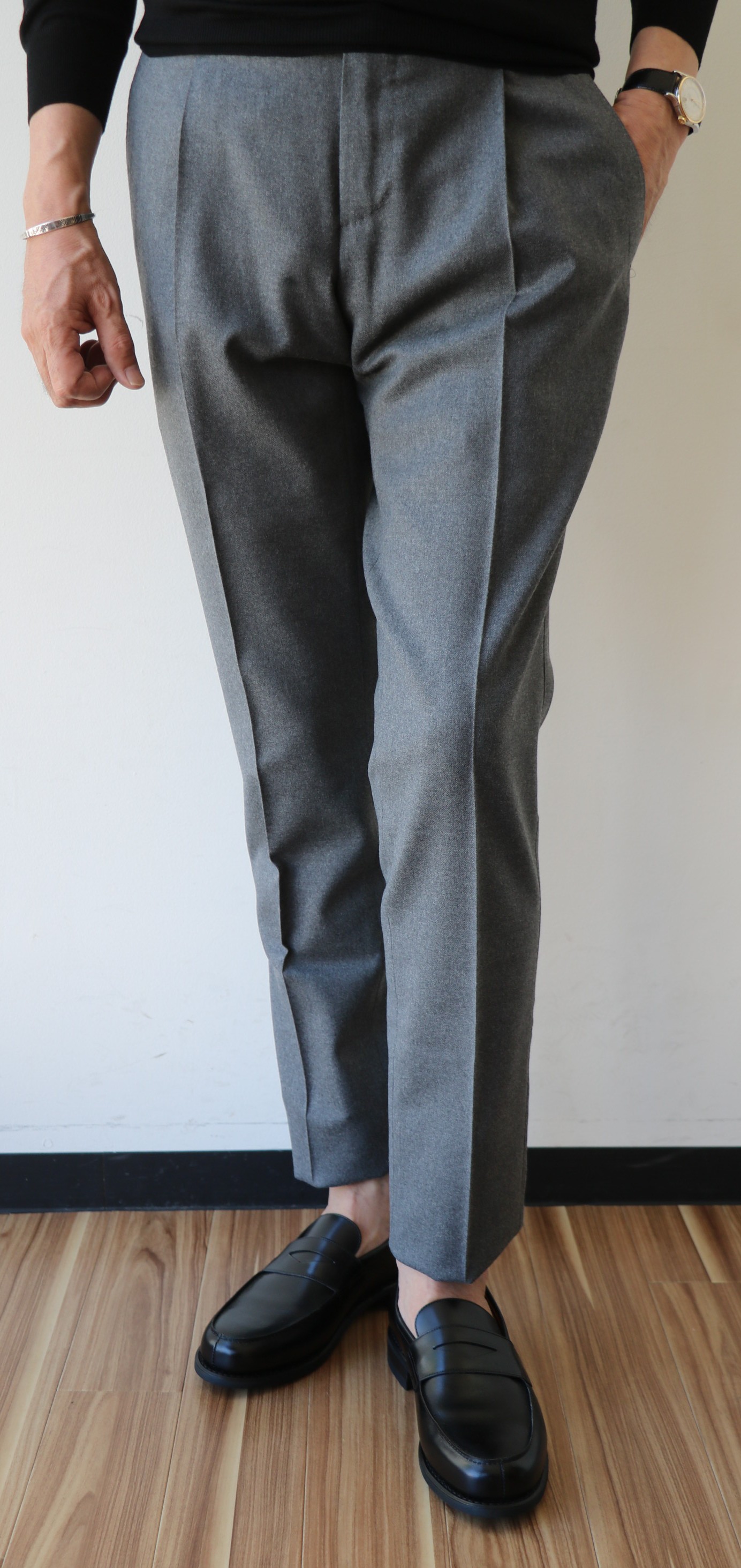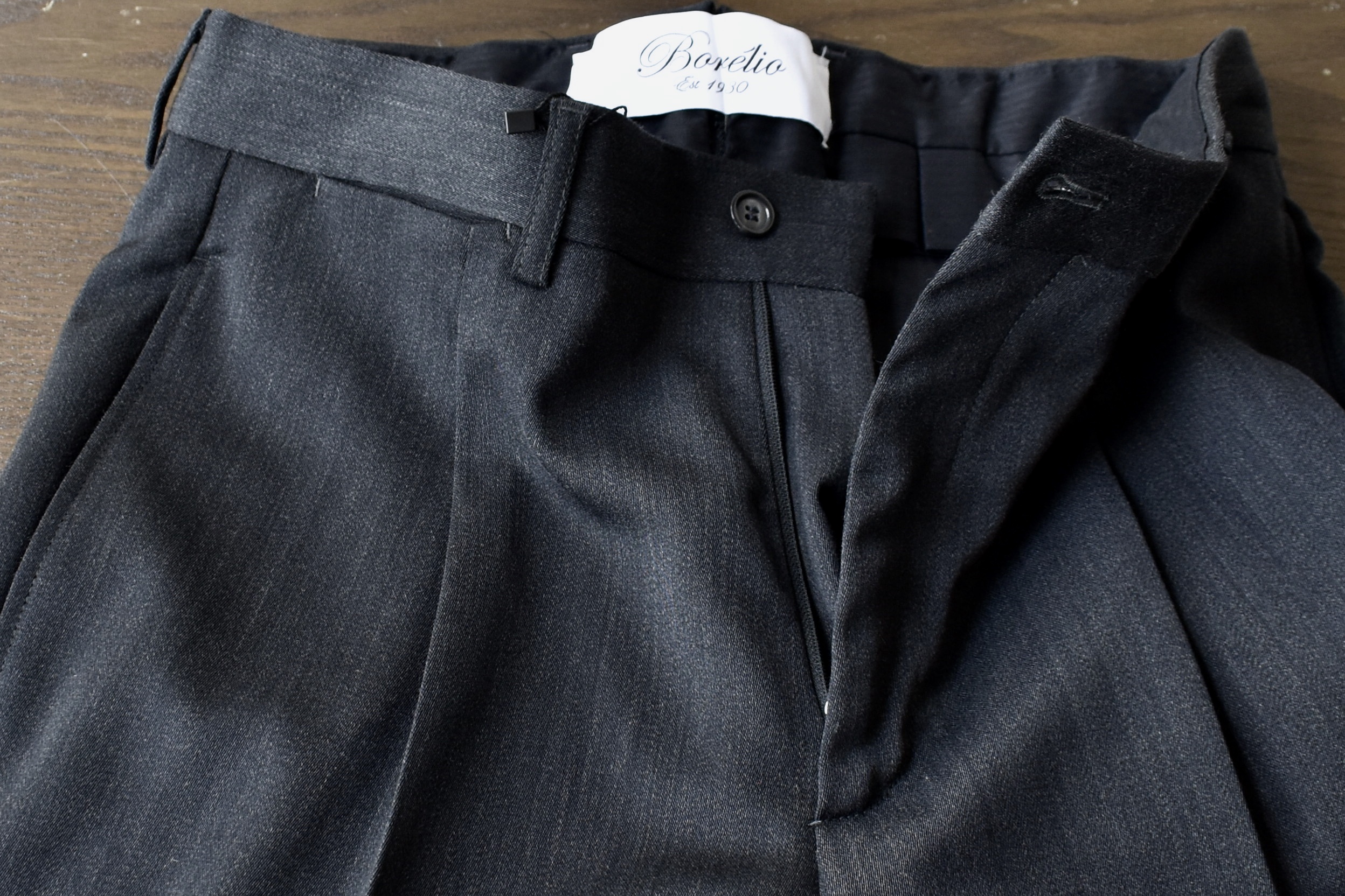 一通りイタリアのパンツが揃った方にお勧めしたいのは、【Borelio/ボレリオ】のパンツ。ベルギー発の老舗パンツブランドが提案する1本は、イタリアのブランドのものとまた違った雰囲気が大いなる魅力...と、言葉にすればそうなるですが、もう少し踏み込んだ案内がしたいところ。一見オーソドックスなウール素材のパンツに見えますが...、