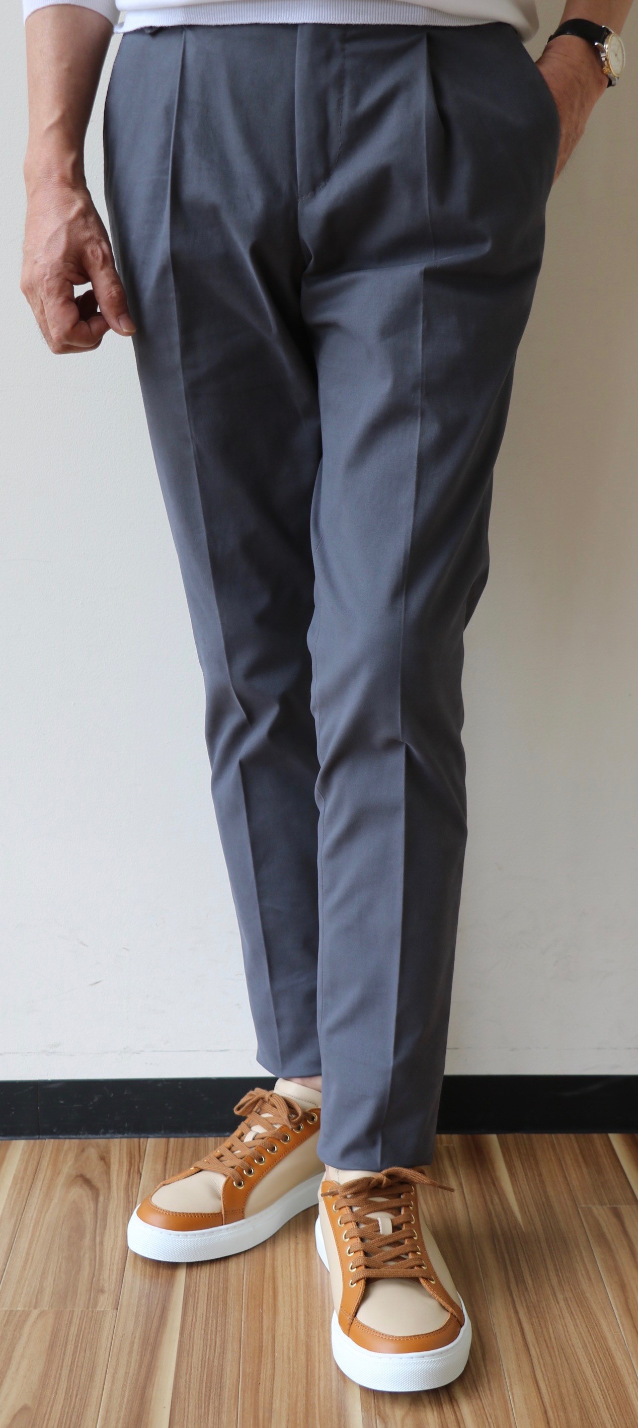こちらは、インコテックスの提案するシャーリングパンツ。シャーリングパンツと言うと、もっとリラックス感を強調したものが多いなか、さすがはインコテックス。リラックス感が前面に出すぎないリラックスパンツとでも申しましょうか、エレガントの中にさり気ない抜け感があるのが特徴です。写真のように白スニーカーで気軽に合わせるも良し、ベルトループも付いているので、仕事で使ってしまうのも良し、であります。