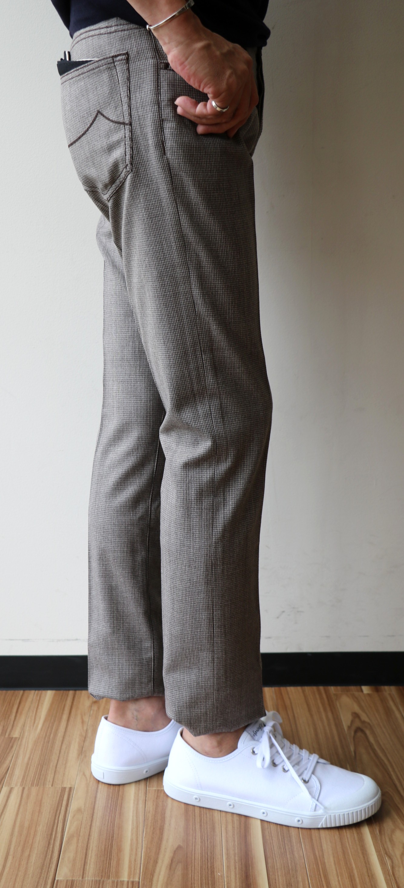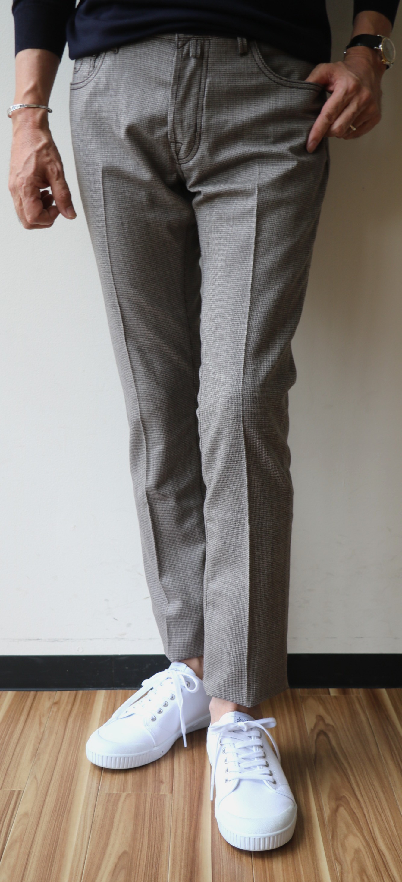 デニム好きなら、【JACOB COHEN/ヤコブ コーエン】は外せませんね。ただし、こちらはデニム生地ではありません。ウール素材の5ポケットパンツは、ブラウンの千鳥格子というのも良いですね。
