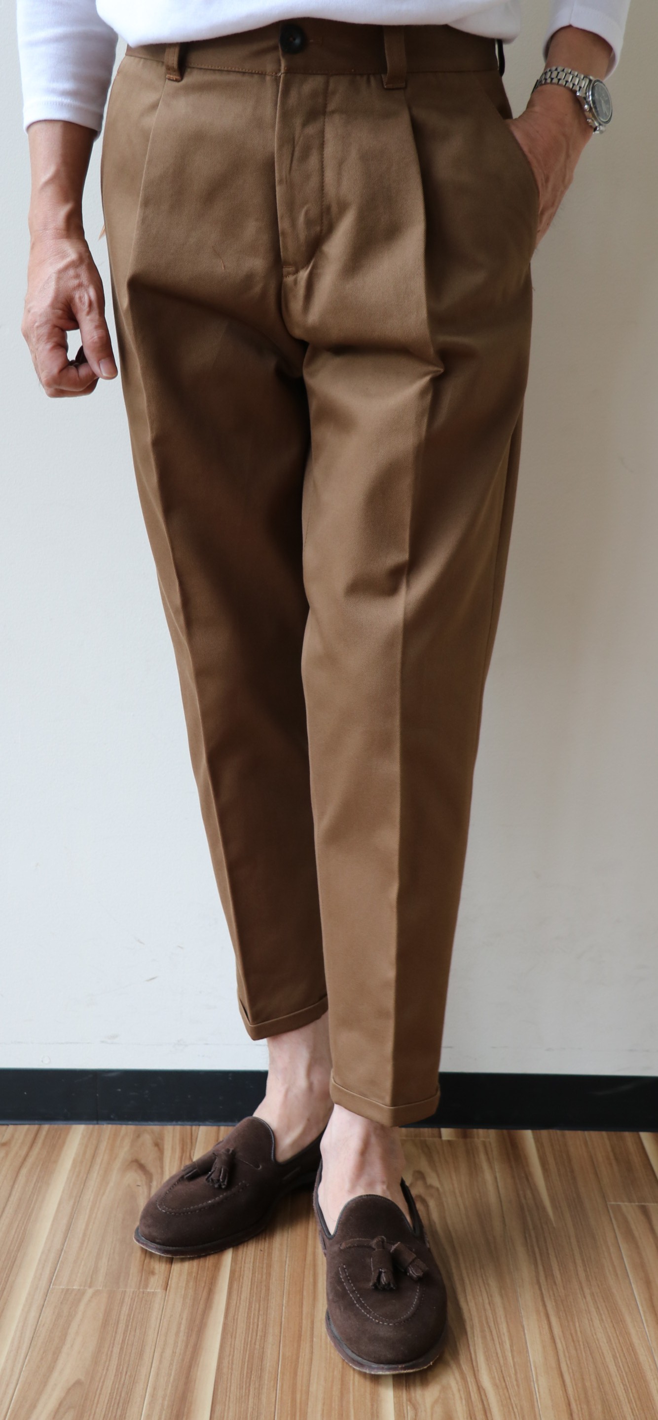 よりスポーティにいくなら、こちら。「FORWARD-Style:05」 コットンチノクロスのクロップドパンツは如何でしょう。人参のような形をしたキャロット型のシルエットは、今提案の多いシルエットでもあります。細身のパンツが揃い、その先の+αを求める方にとって、新鮮な選択肢になるはずですので、是非一度足を入れに来てください。