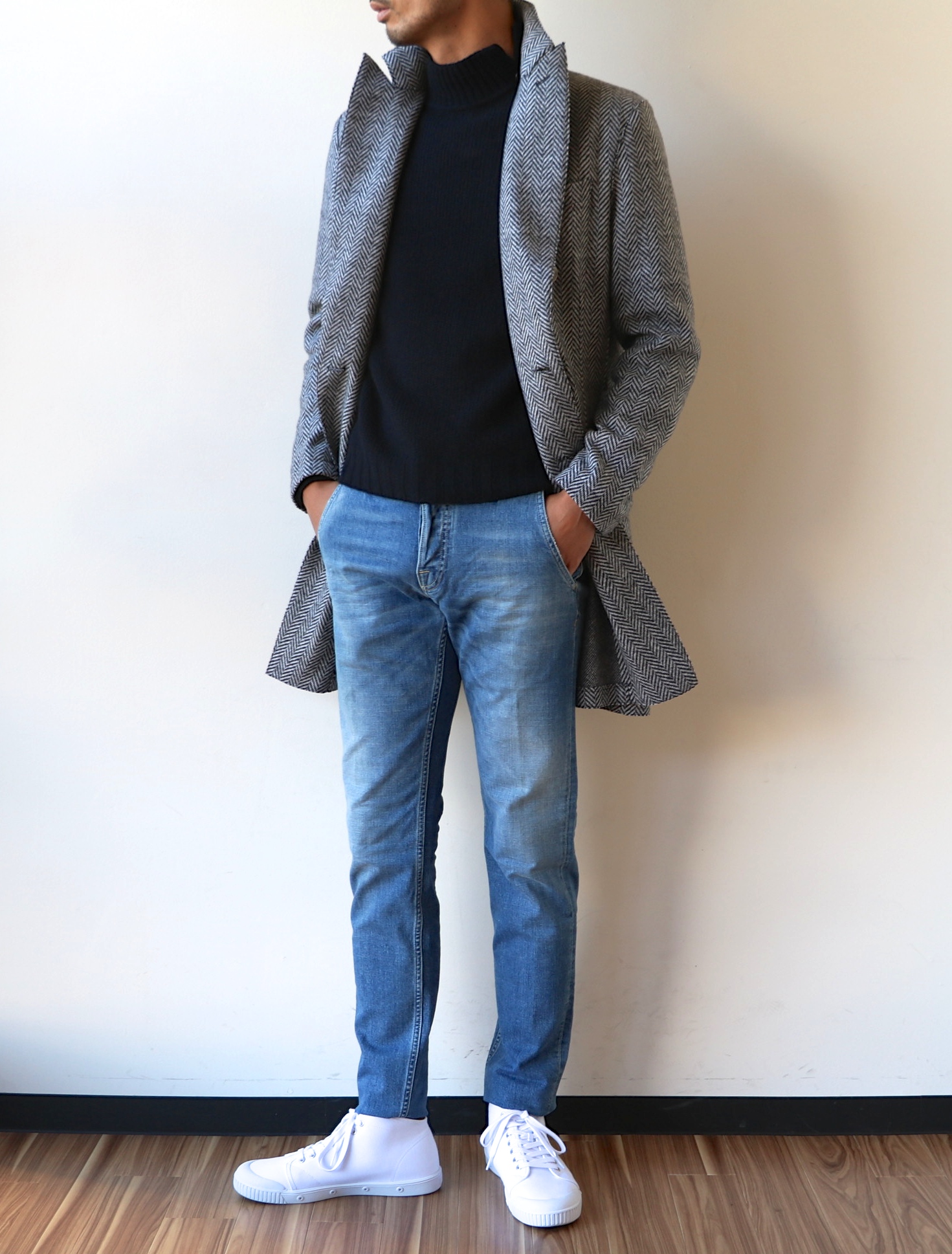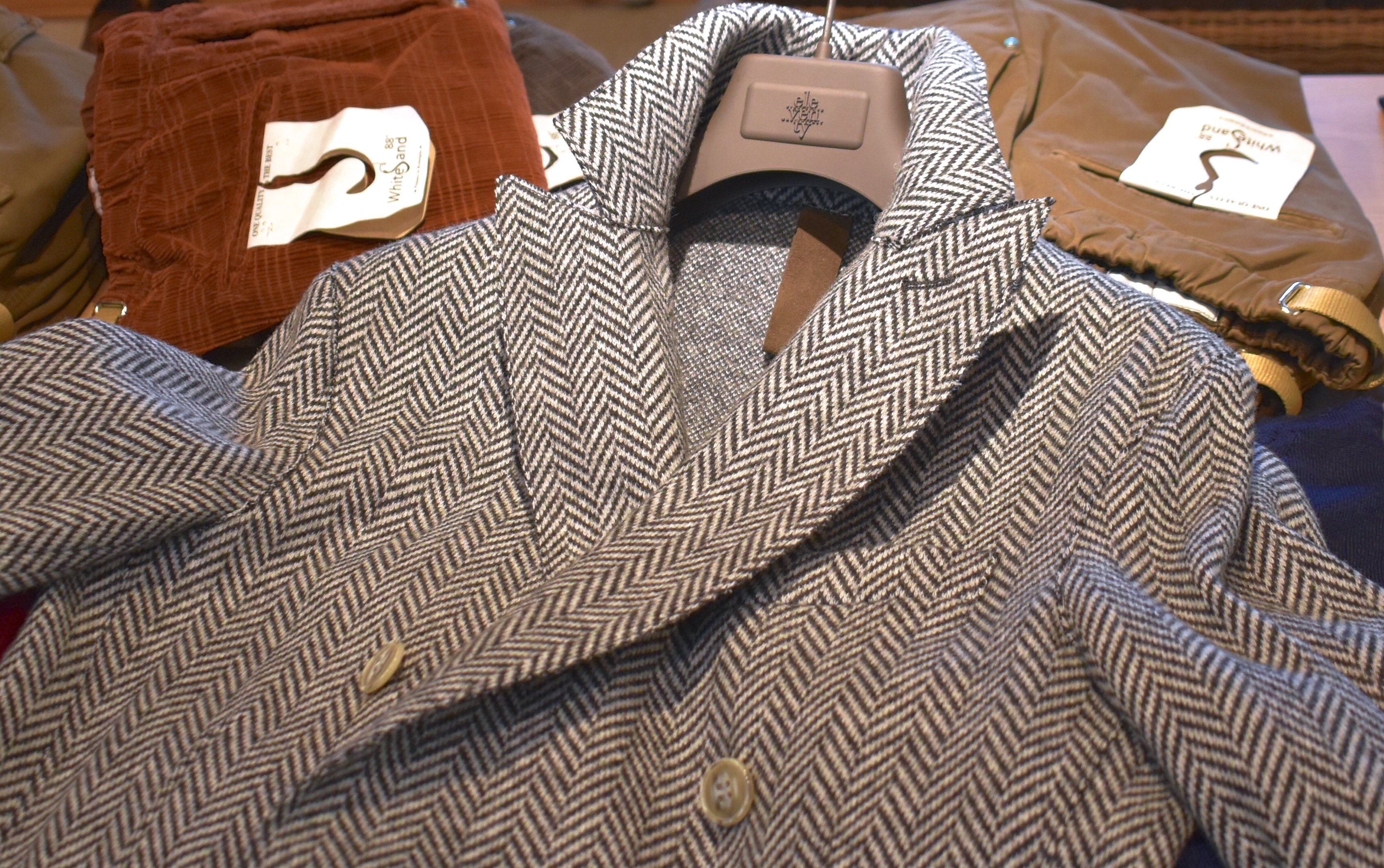 もう1つ、鏡の前で釘付けになってしまったのは、eleventyのヘリンボーン柄コート。こちらも負けじと男前なコートでして、なかなか脱ぐことができませんでした。