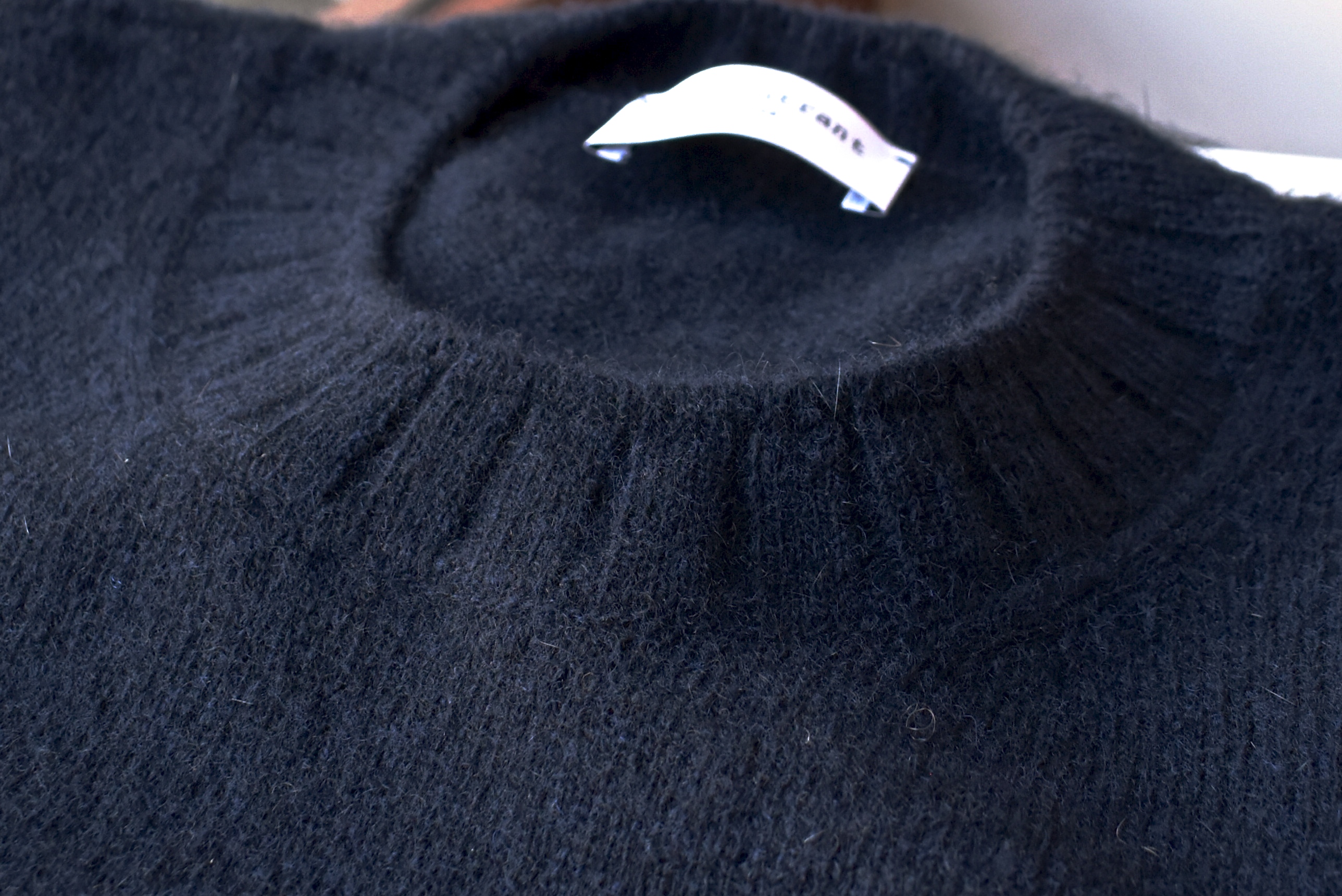 エアリーなクルーネックよりも、ミドルゲージ程の・幾分か厚みのある編み地に変わりますが、軽さや包み込むような着心地は同様です。