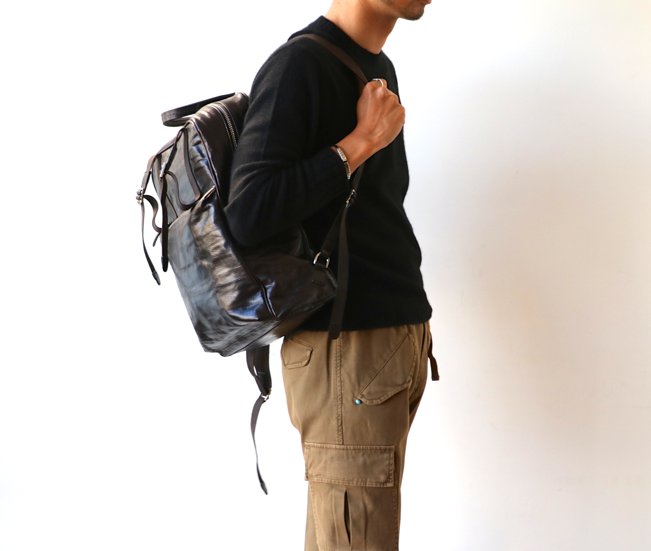 モデルは身長183cm・体重67kg・胸囲95cmで、Sサイズを着用しています。写真では、White Sandのパンツ、Daniel&Bobのレザーリュック、D'AMICOのバングルを合わせております。