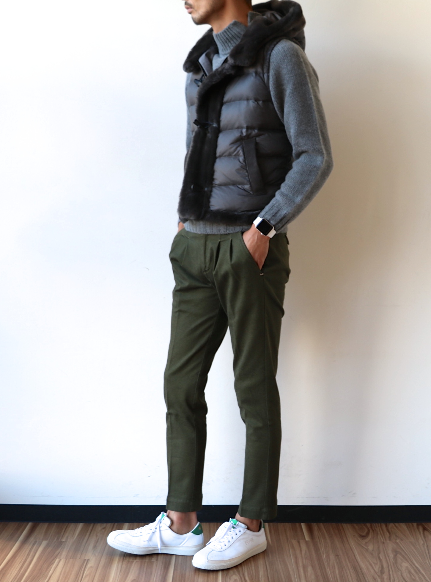 この手のニットと抜群に相性が良いのが、ベスト。マガジーノ的には、EMMETIのムートンダウンベストが第1候補でしょうか。パンツはentre amis、スニーカーはPantofola d'Oroです。