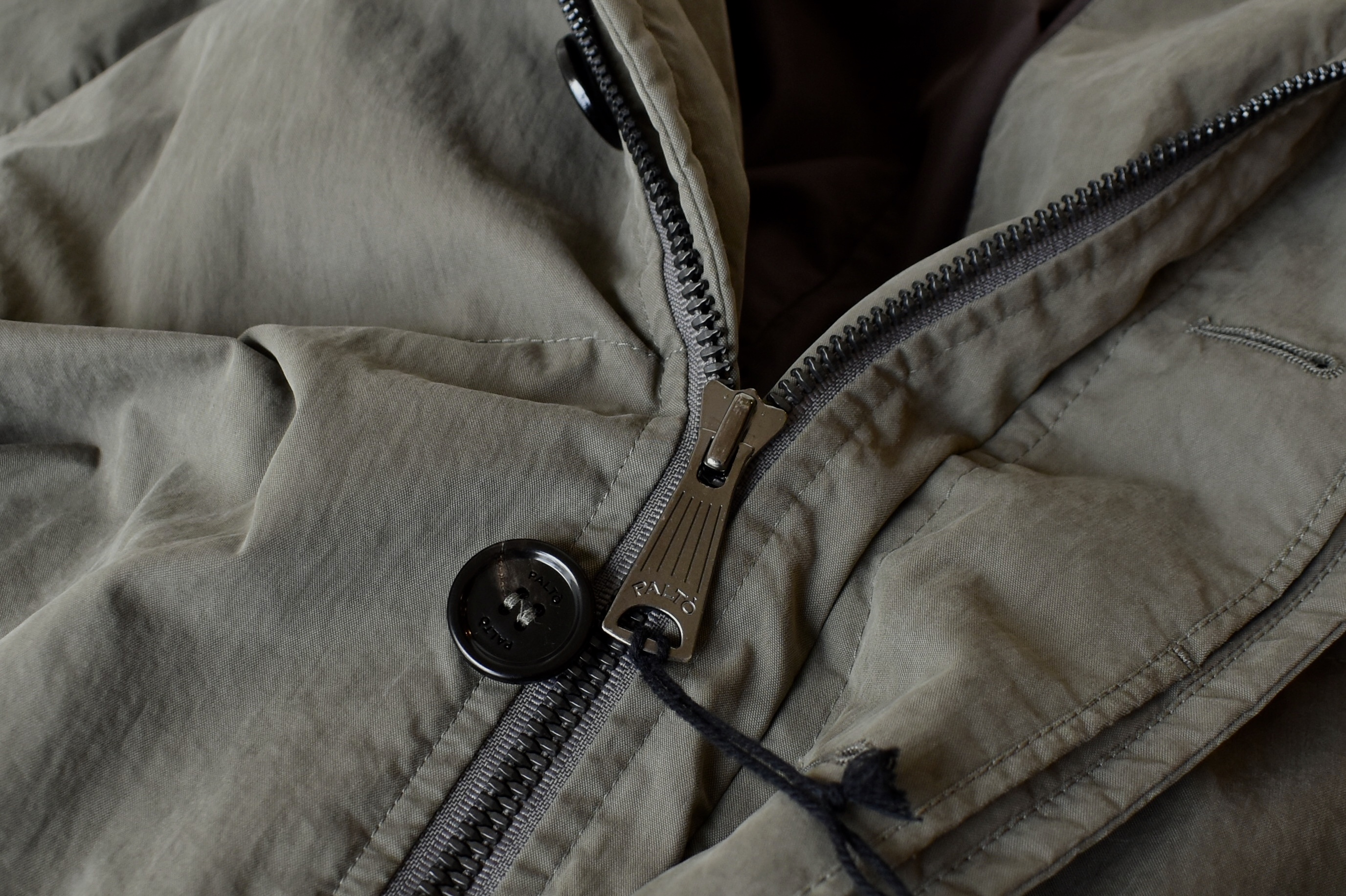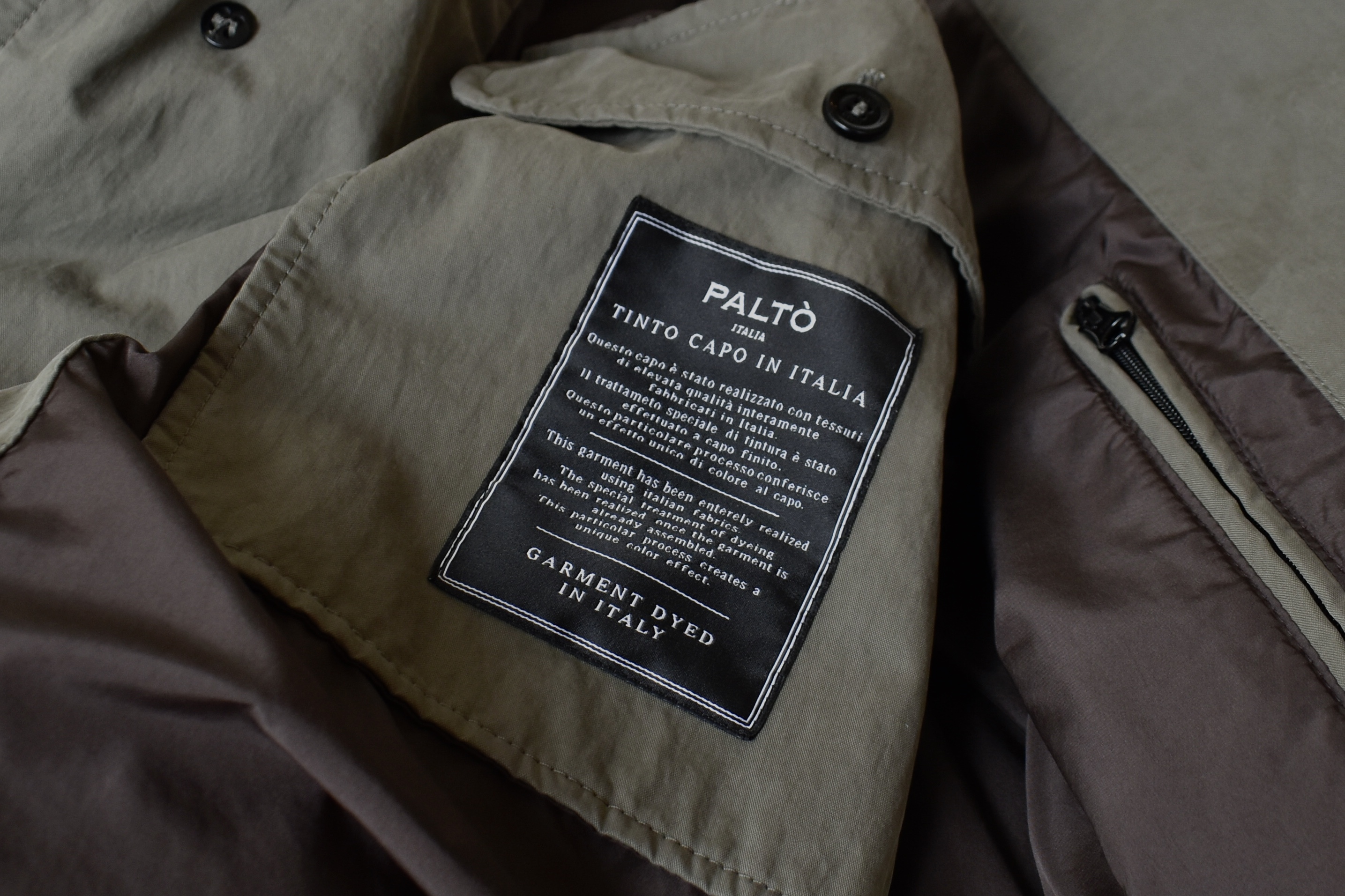 このコートの肝は、「TINTO CAPO IN ITALIA」であること。英語で言えば、「GARMENT DYED IN ITALY」。製品染めのガーメントダイです。製品染めとは、生地を縫製し、服を製品として完成させた後に、色を染める方法のことです。そうすることで、独特の色合いに仕上がるとともに、自然な色ムラが付いたり、アタリや縮みが生まれます。