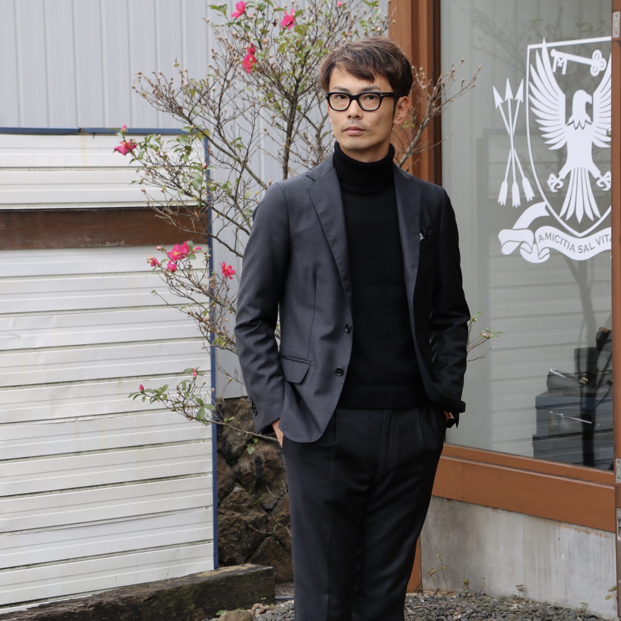 候補に上がっていたのは、スーツ。控えめなスーツに、中にタートルネックでも着て気張らずに。もしレストランやバーに行く予定があれば、こっちにしていたかもしれません。スーツはDe Petrillo、ニットはZANONEのものです。